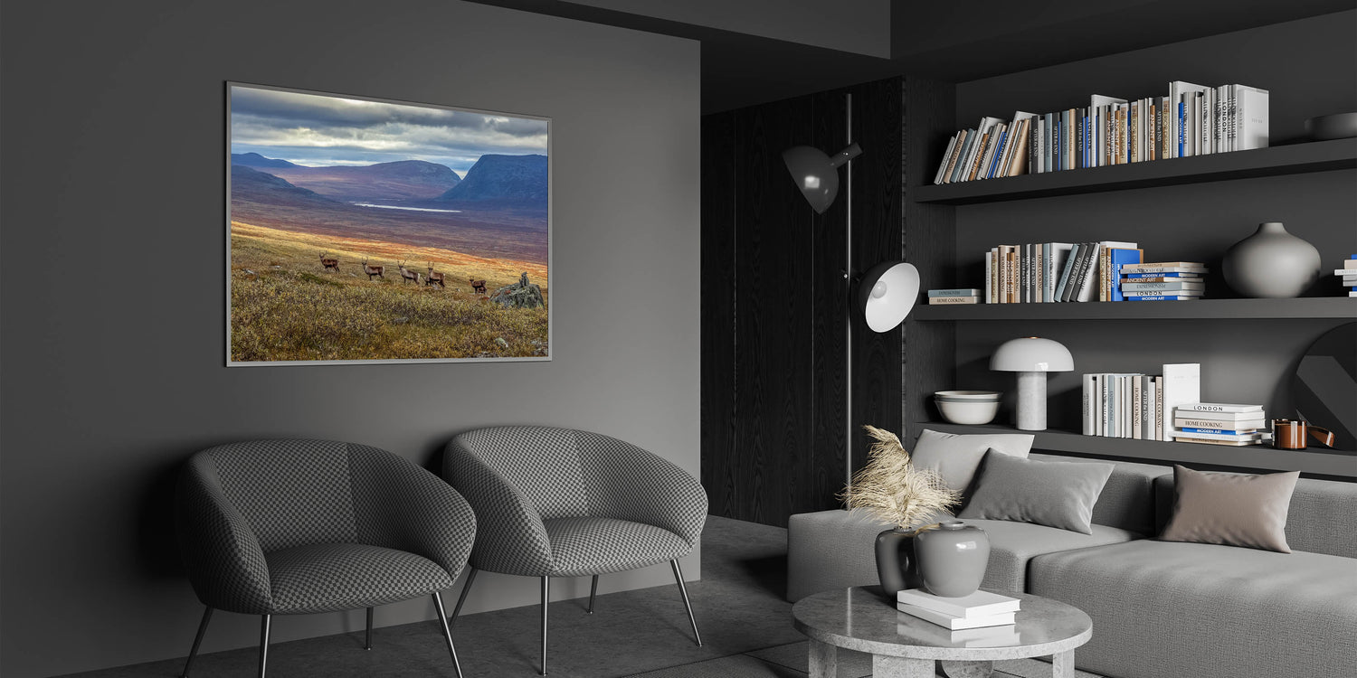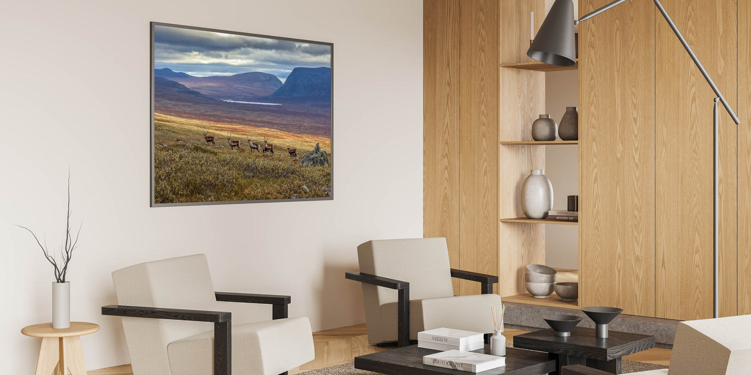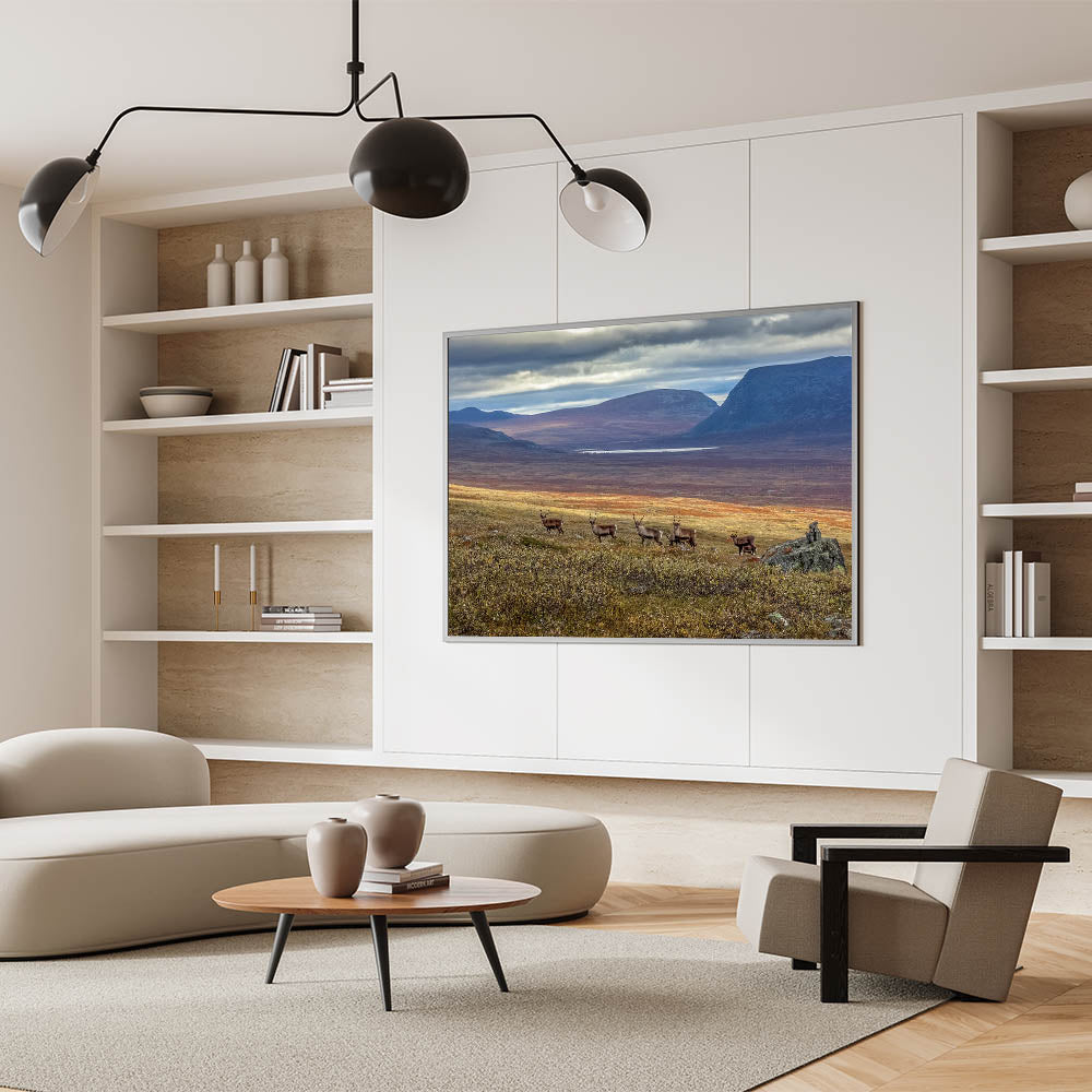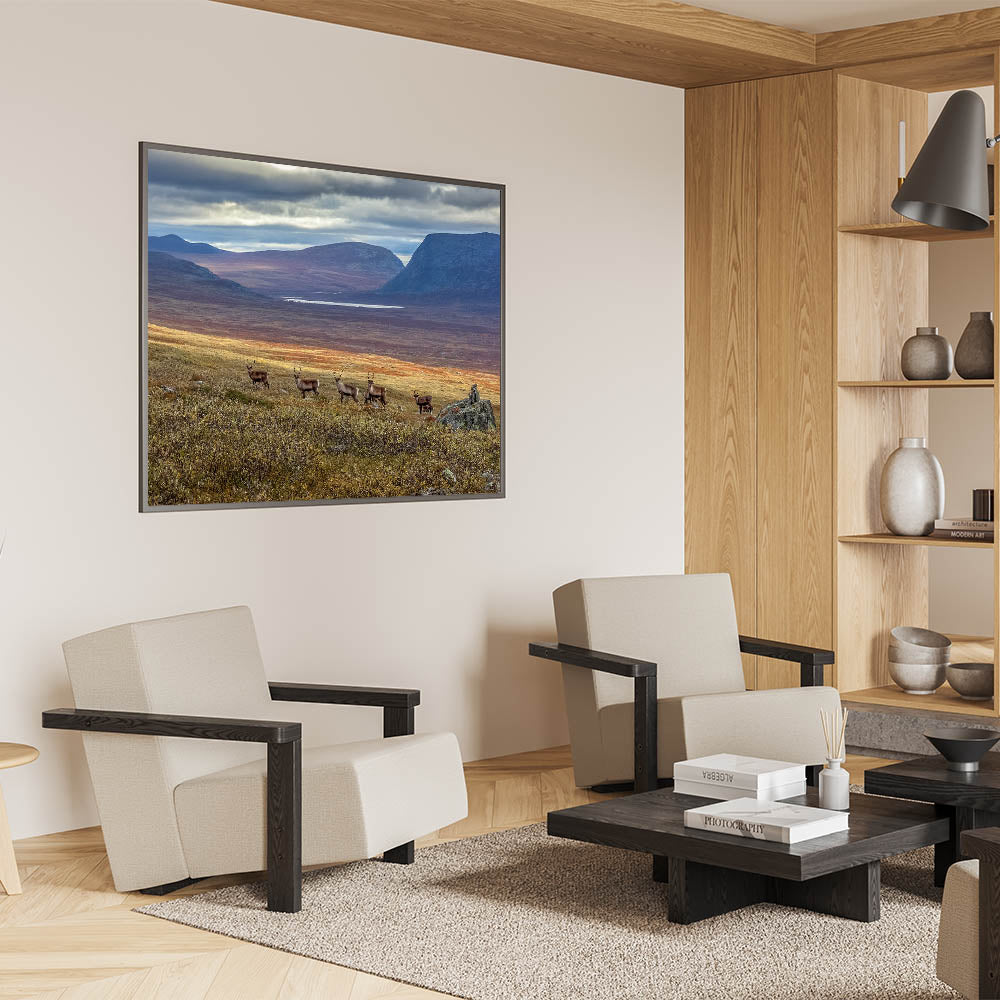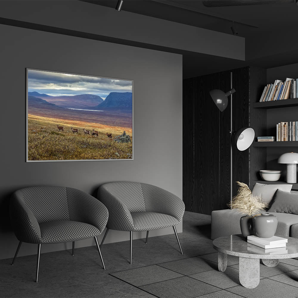 Step into the heart of the Swedish wilderness with this captivating Swedish Scenery Wall Decor featuring a group of reindeer grazing peacefully in the vast Nordic mountains. This breathtaking landscape, with its expansive fields and majestic mountain backdrop, beautifully captures the tranquility of Swedish nature, making it the perfect addition to any nature lover’s space.