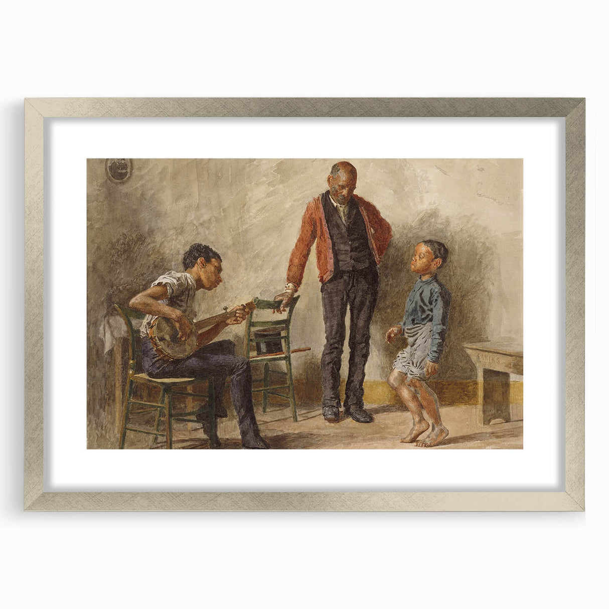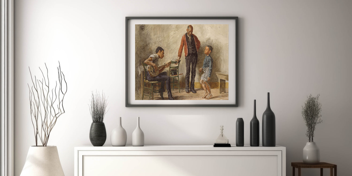 Celebrate the charm of everyday life with "The Dancing Lesson" by Thomas Eakins. This captivating Realism art print portrays an intimate moment between a child, a musician, and an observer, capturing the joy and simplicity of a dance lesson. The detailed expressions and lifelike postures make this piece a perfect addition for anyone who values art that tells a story.