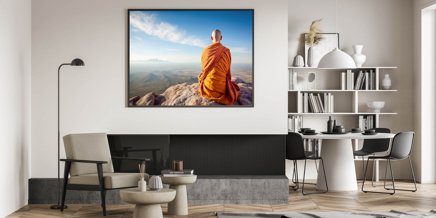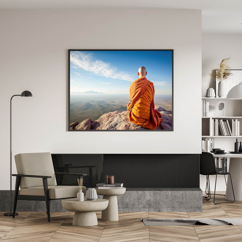 Immerse yourself in the tranquility of Tibetan spirituality with this captivating wall art featuring a monk in meditation, gazing over an expansive landscape. This piece embodies peace, mindfulness, and the beauty of Tibetan culture, making it a perfect addition to spaces designed for relaxation and reflection. Ideal for homes, meditation rooms, or offices, this artwork brings a calming presence to any room.