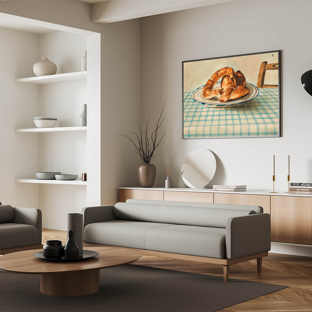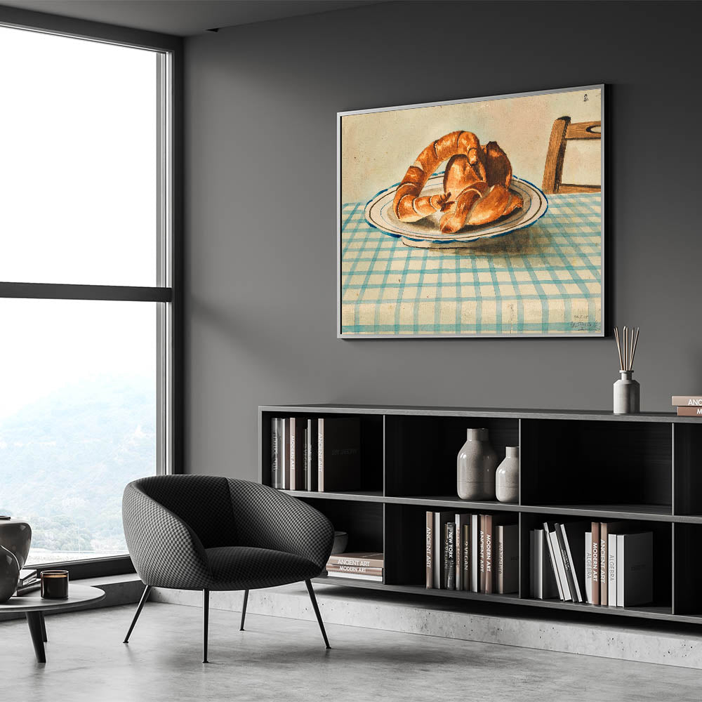 Bring a touch of vintage charm to your kitchen or dining area with this delightful Art Deco wall art featuring a still life of croissants on a checkered table. This artwork captures the simplicity and elegance of everyday life, showcasing warm tones and intricate details that add a cozy, nostalgic feel to any space. Perfect for lovers of classic still-life art and 1920s style, this piece complements both traditional and modern décor.