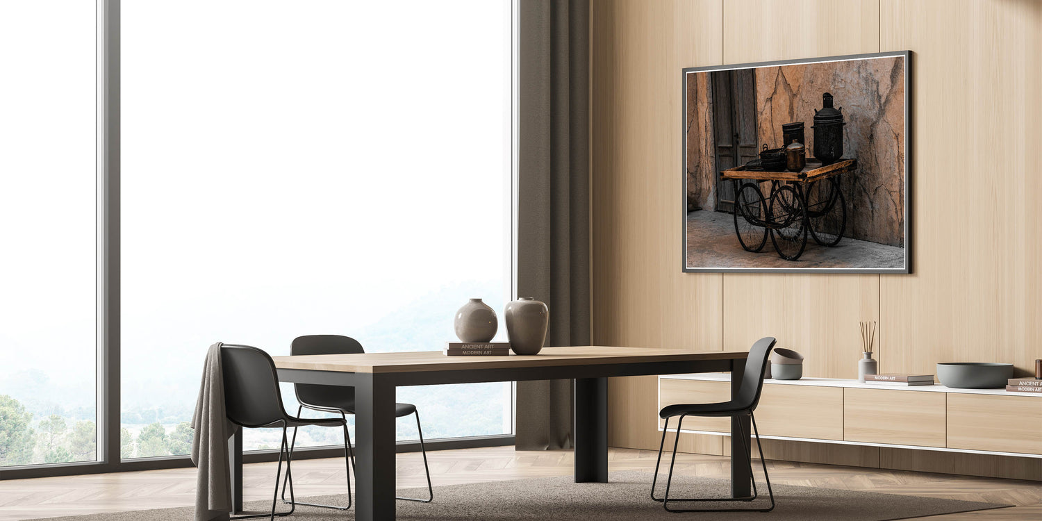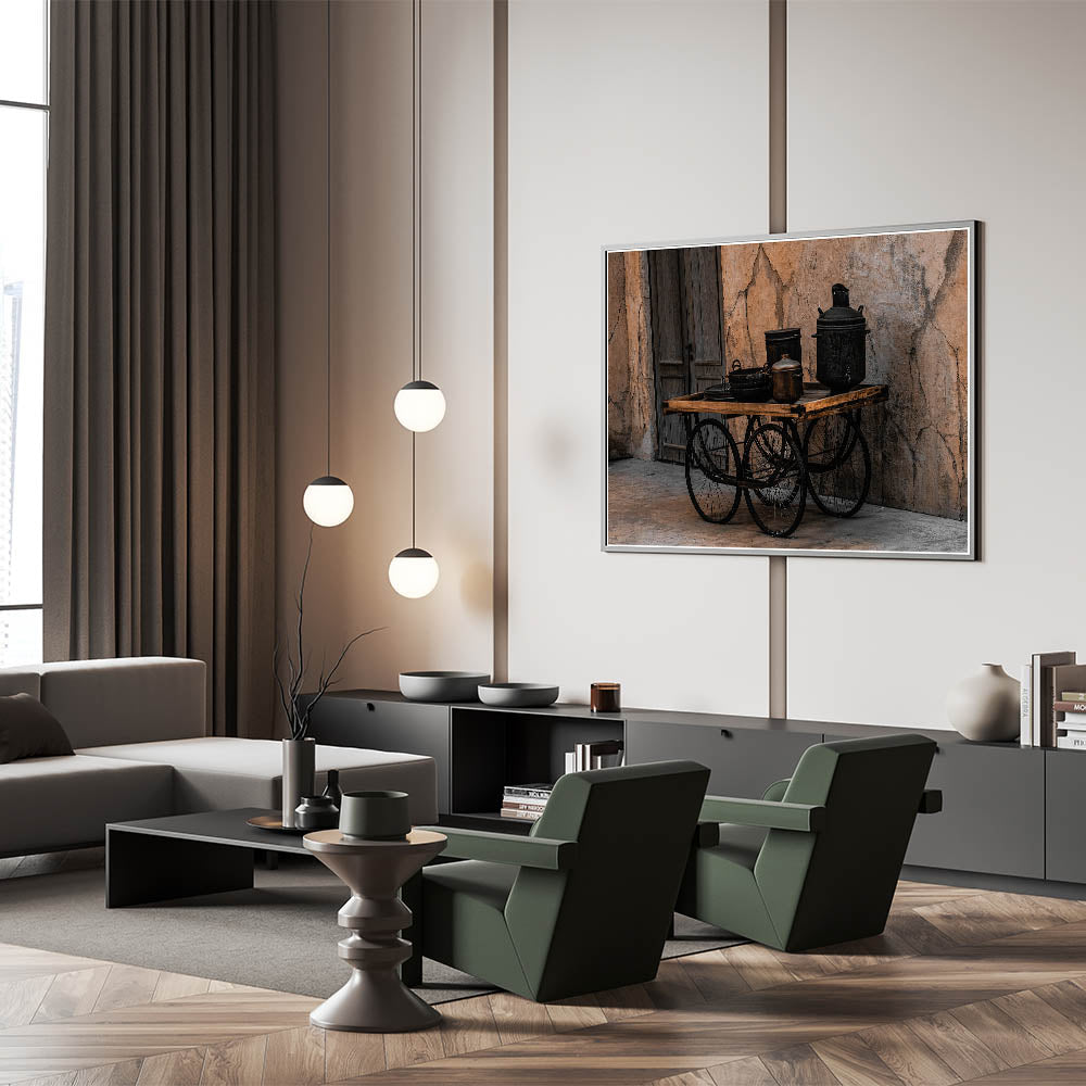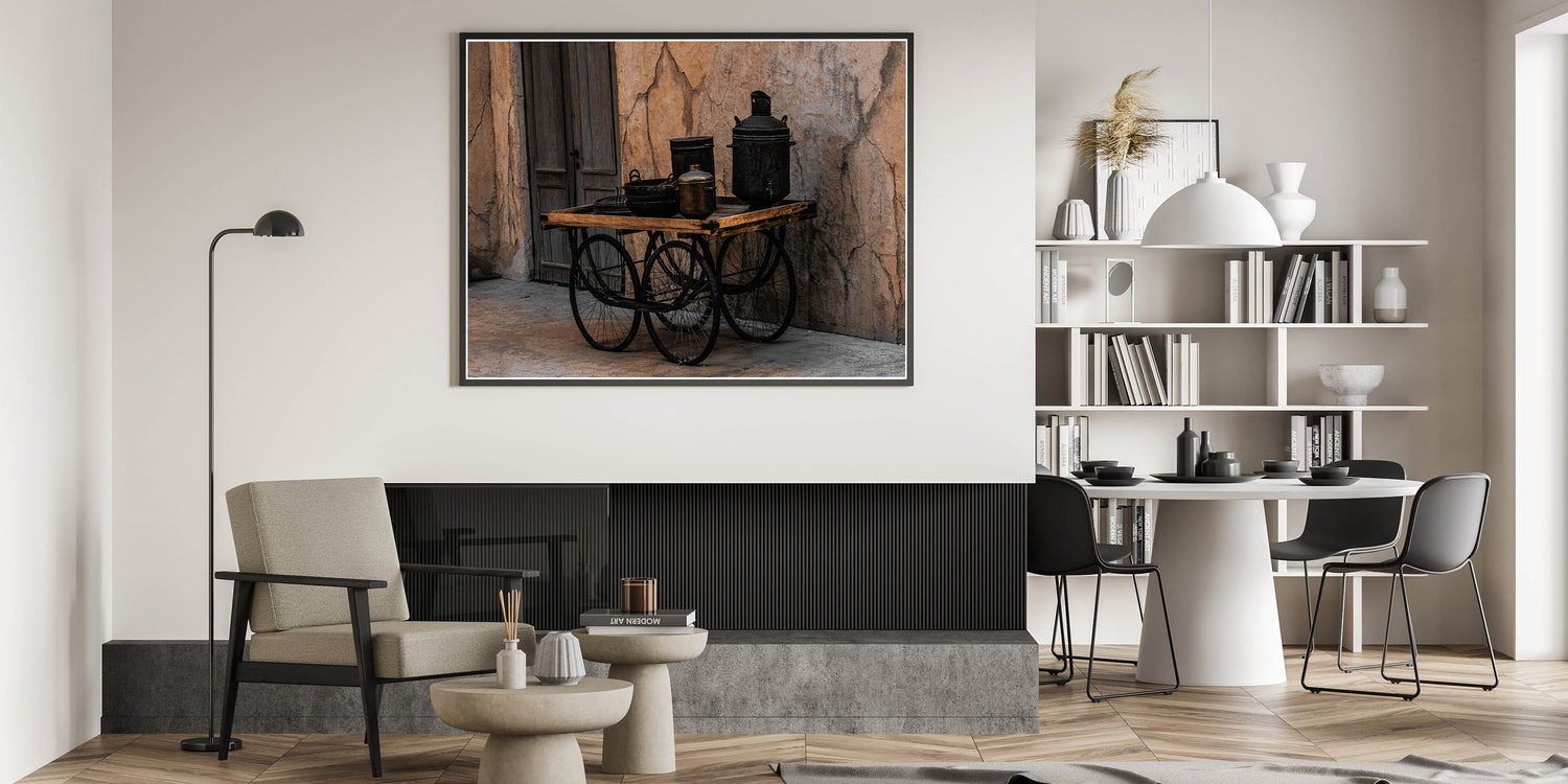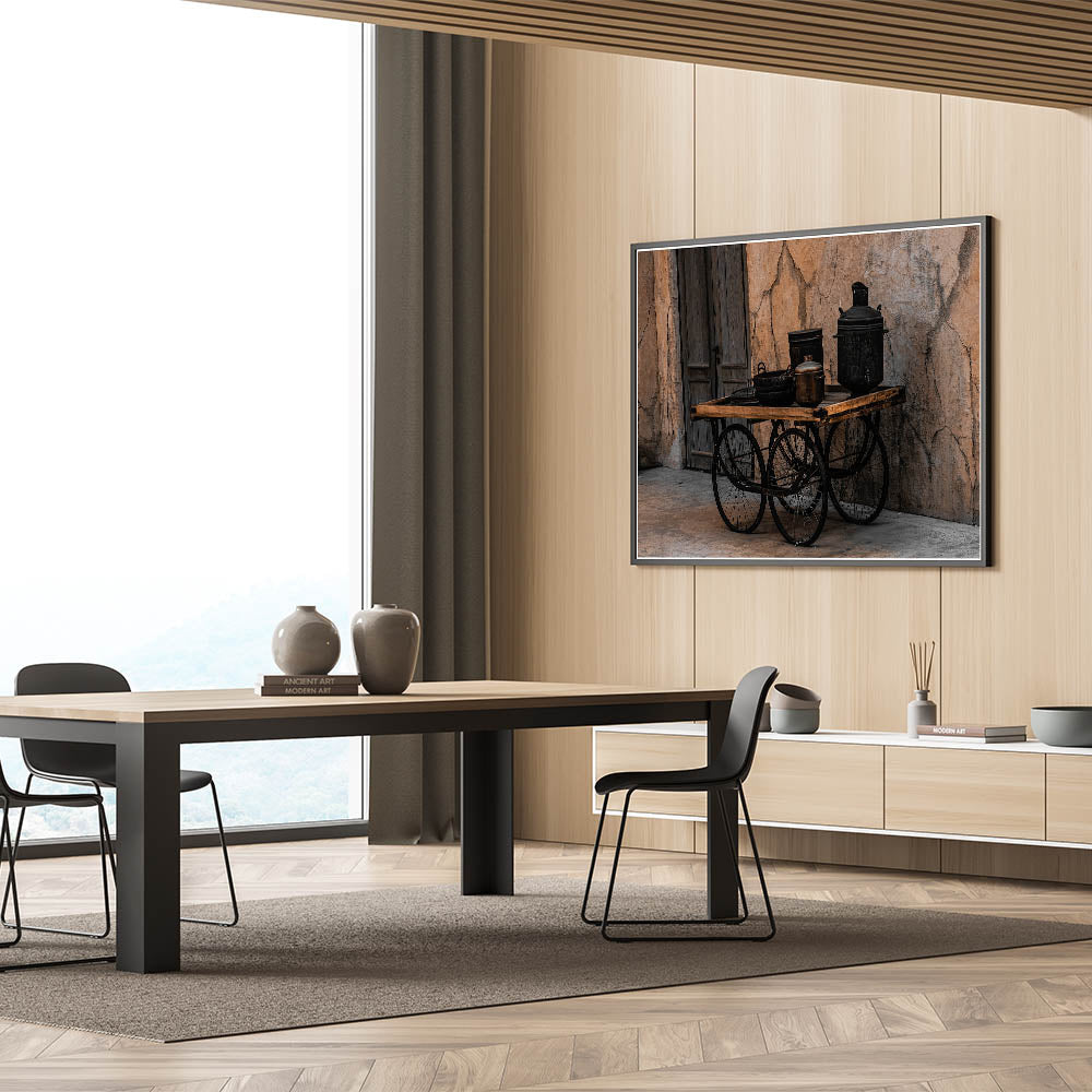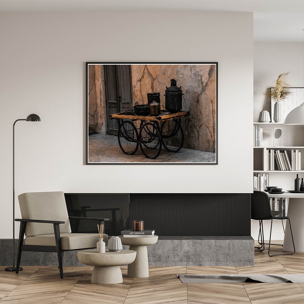 - High-quality print with sharp details, emphasizing the texture and depth of the vintage cookware and cart