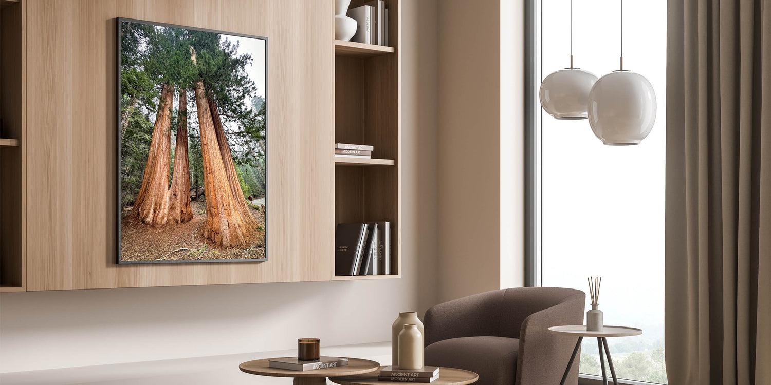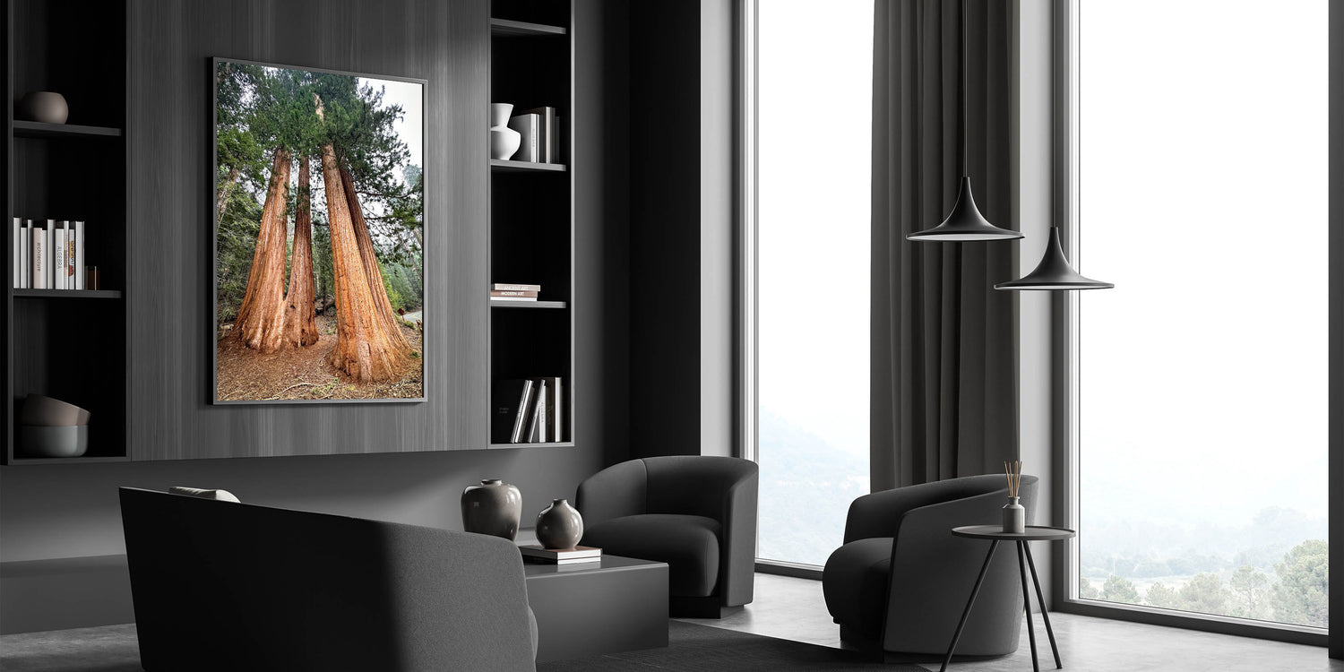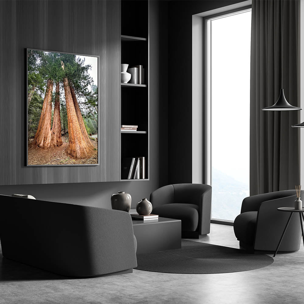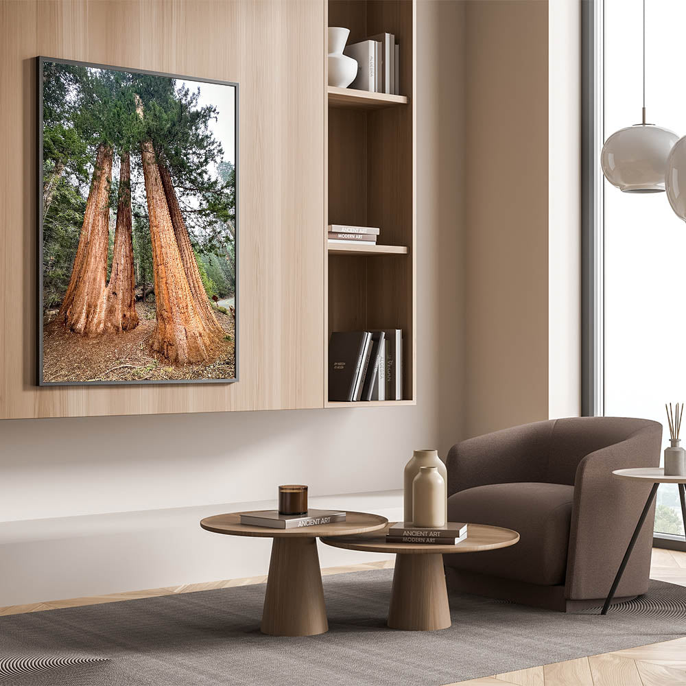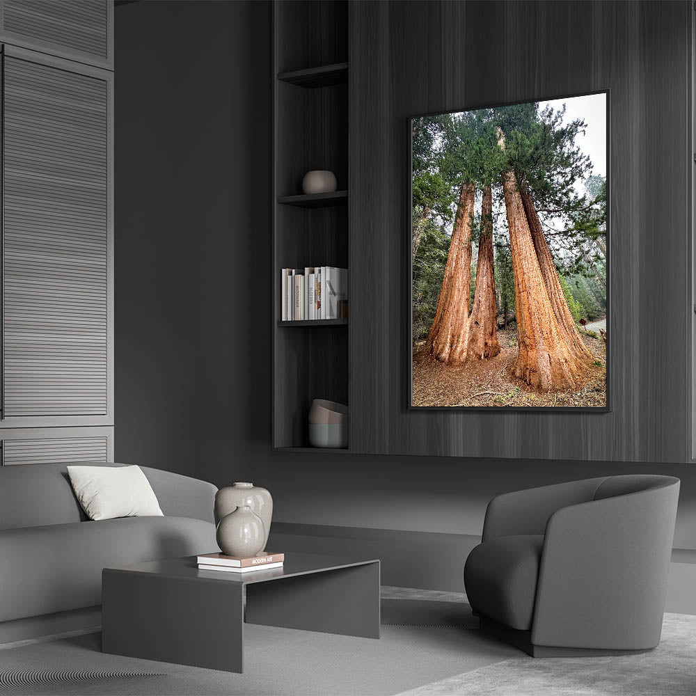 Bring the natural beauty of Sequoia National Park into your home with this captivating wall art. Featuring a trio of towering sequoia trees, this artwork captures the majesty and timelessness of nature. The trees stand tall against the lush forest, making this a perfect piece for those who appreciate the wilderness and the tranquility it offers.