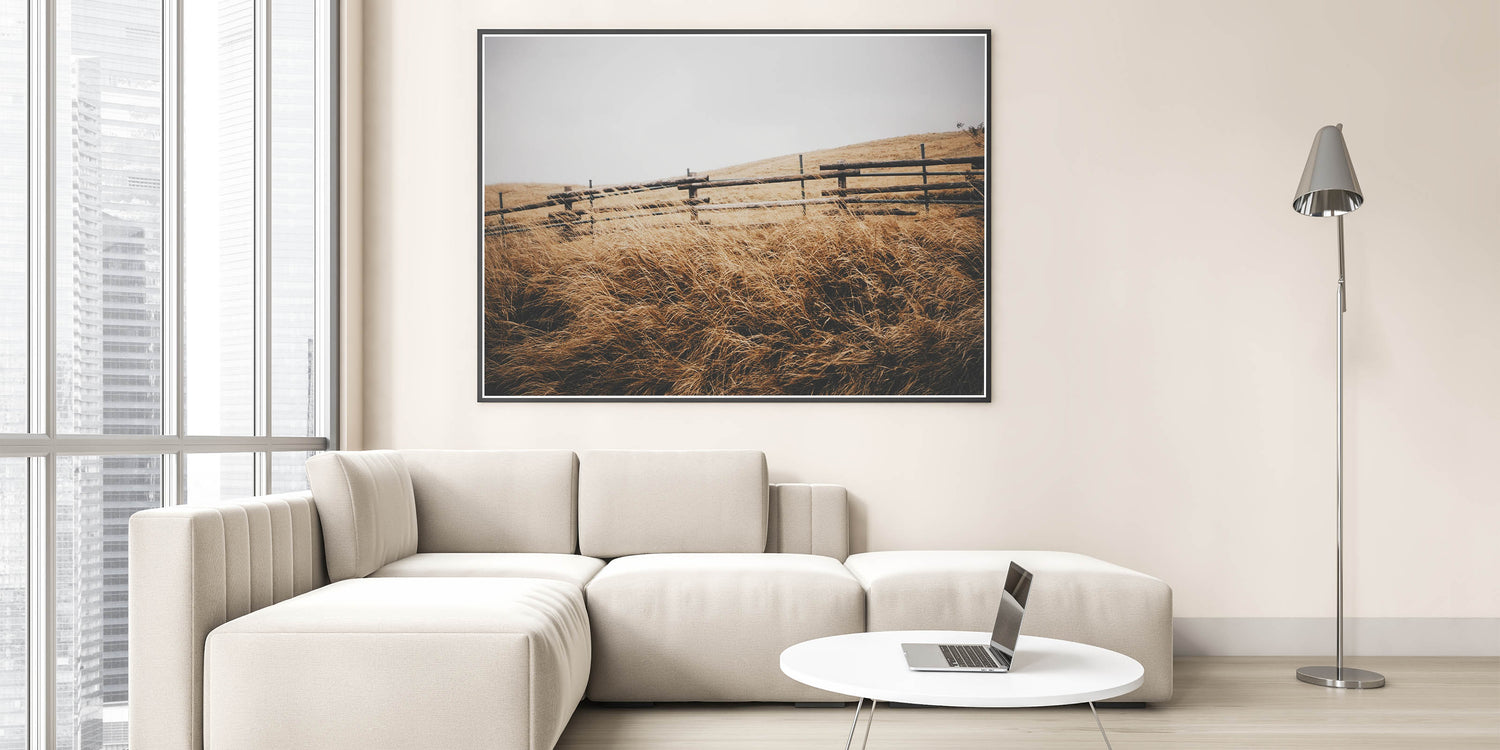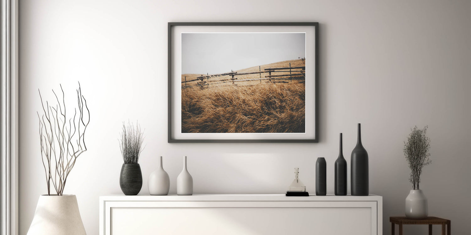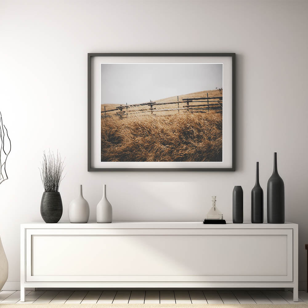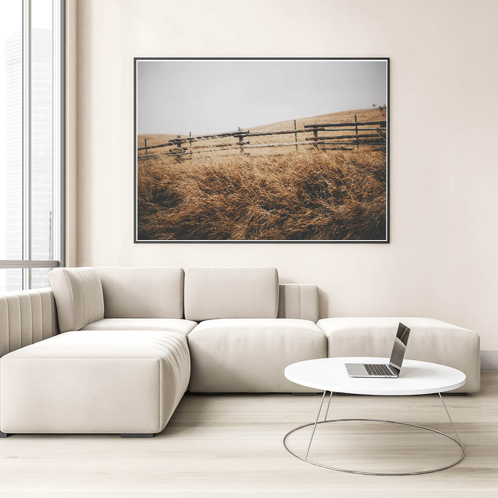 - High-resolution print capturing the intricate movement of the grass and the rustic fence