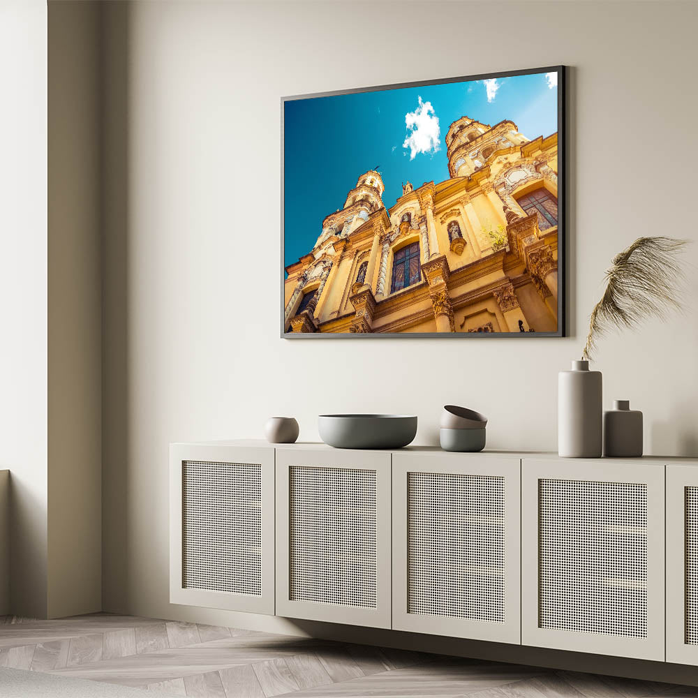 Celebrate the rich history and intricate architecture of Buenos Aires with our "Historic Buenos Aires Architecture - Canvas Art Print." This stunning piece showcases the exquisite details of one of the city's grandest buildings, captured under the brilliant blue sky.