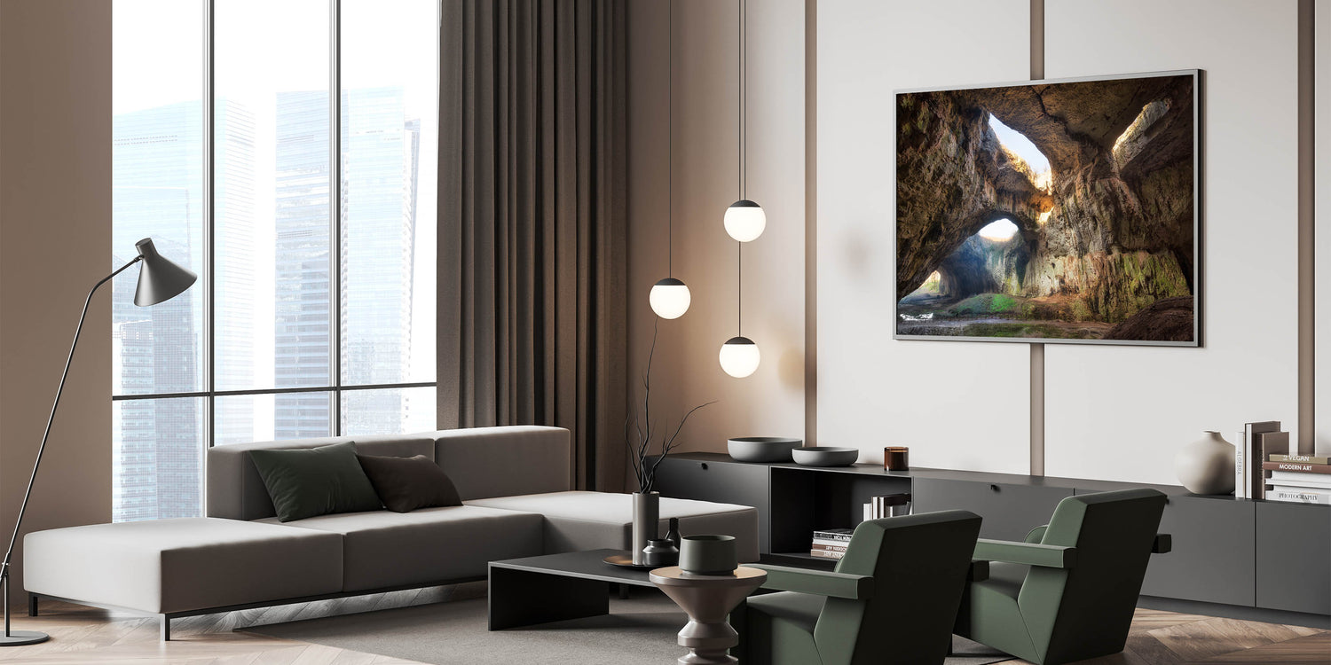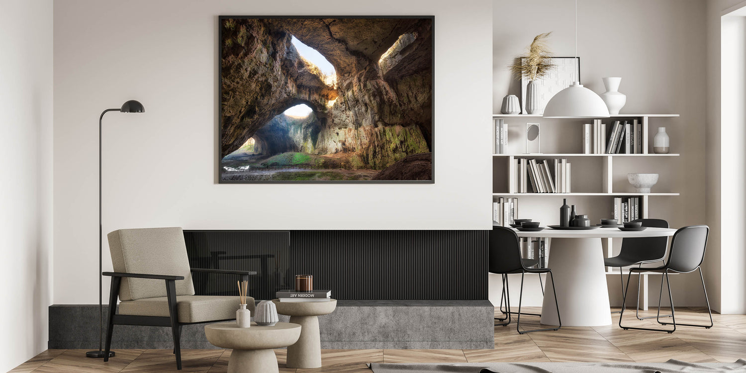 Capture the awe-inspiring beauty of Devetashka Cave, where natural light filters through its vast arches, creating a dramatic interplay of shadows and textures. This striking print transports you into one of Bulgaria's most famous caves, known for its impressive size and stunning geological formations. Perfect for bringing a sense of adventure and nature into your home or office.
