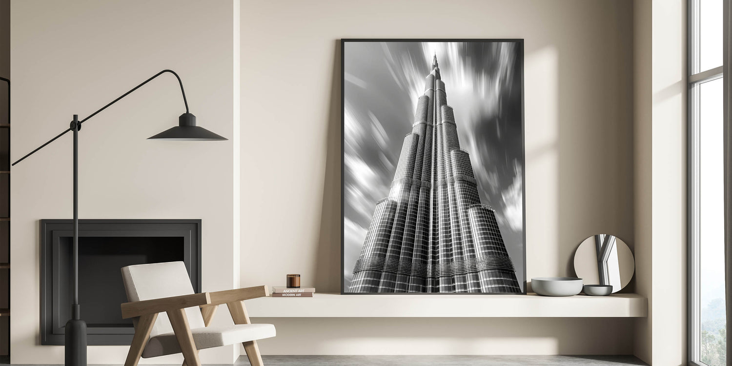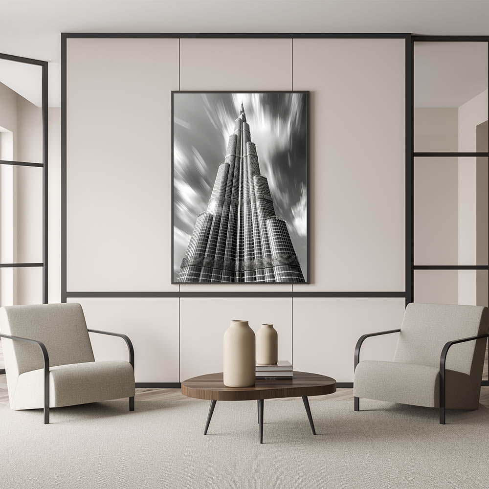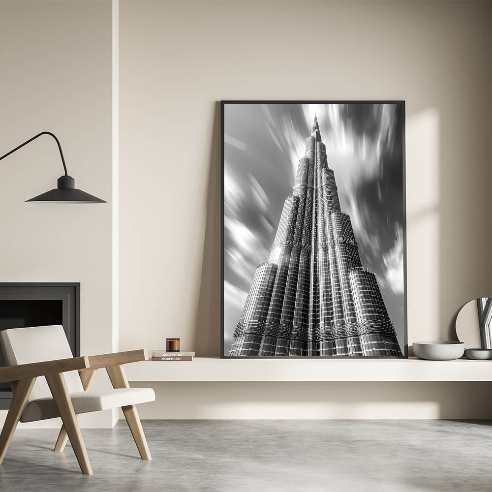 Capture the timeless elegance of Dubai’s most iconic structure with this Black and White Art Print of the Burj Khalifa. The striking monochrome design emphasizes the sleek lines and modern architecture of the world’s tallest building, creating a bold and dramatic piece for any room. This Skyscraper Art Print offers a fresh perspective of the tower, with a dynamic sky in motion, making it a standout choice for minimalist and modern interiors.