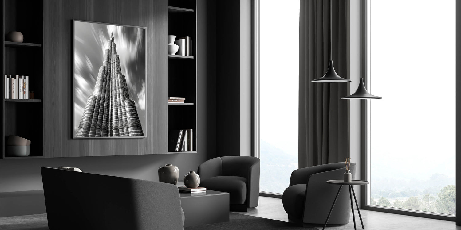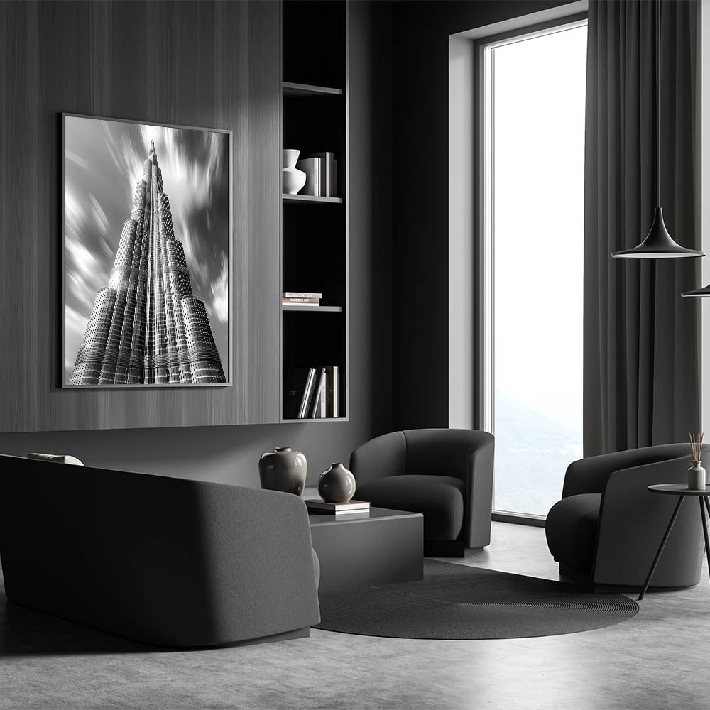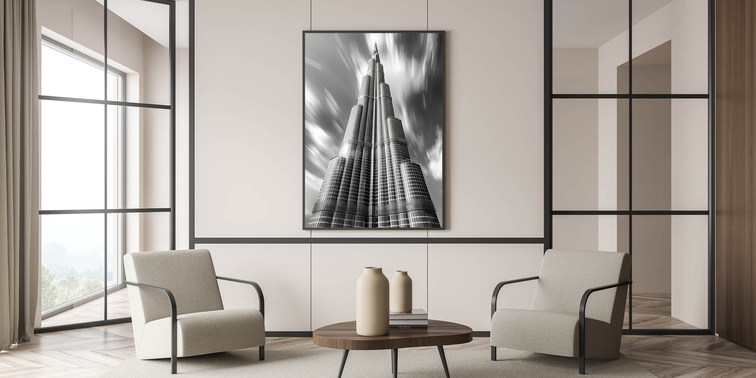 Capture the timeless elegance of Dubai’s most iconic structure with this Black and White Art Print of the Burj Khalifa. The striking monochrome design emphasizes the sleek lines and modern architecture of the world’s tallest building, creating a bold and dramatic piece for any room. This Skyscraper Art Print offers a fresh perspective of the tower, with a dynamic sky in motion, making it a standout choice for minimalist and modern interiors.