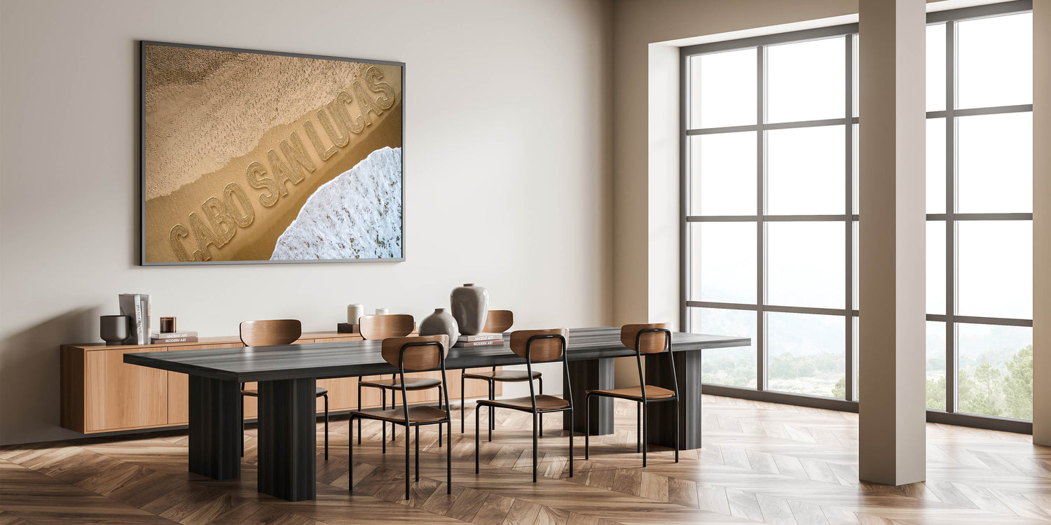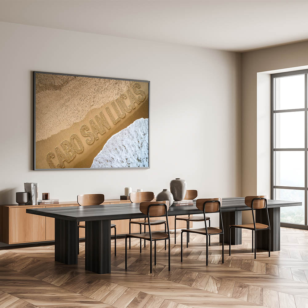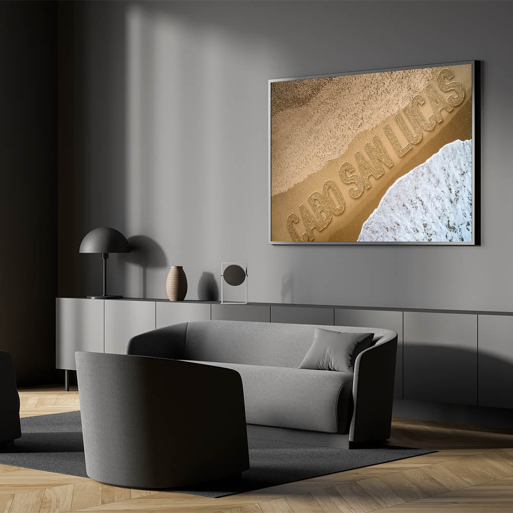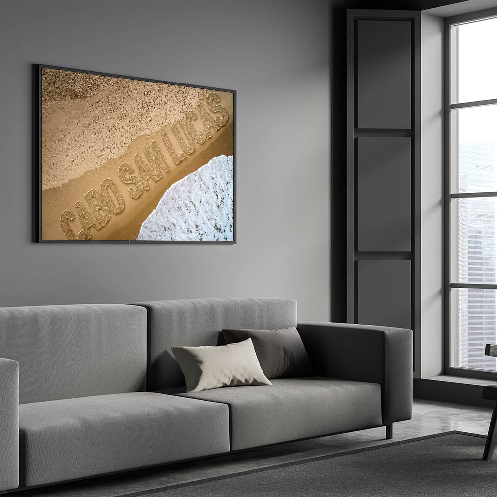 Experience the beauty of Cabo San Lucas with this unique aerial photography print showcasing the iconic destination etched in the sand, gently kissed by ocean waves. This stunning piece captures the peaceful essence of the beach, making it the perfect addition to any coastal or Baja California decor. Whether you're decorating a beach house or adding a touch of relaxation to your living space, this wall art brings the calming vibes of the sea right into your home.