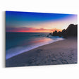 Immerse yourself in the peaceful beauty of Cabo San Lucas with this serene beach sunset wall art. The soft hues of pink, purple, and blue reflect off the ocean, while the calm waves gently touch the dark sandy shore. This tranquil scene captures the peacefulness of a quiet sunset by the sea, making it a perfect piece for those who appreciate calm, coastal landscapes.