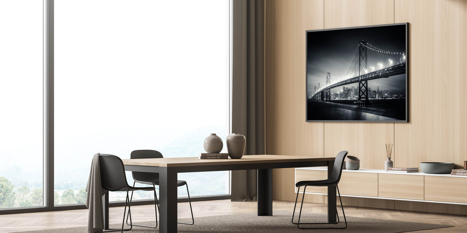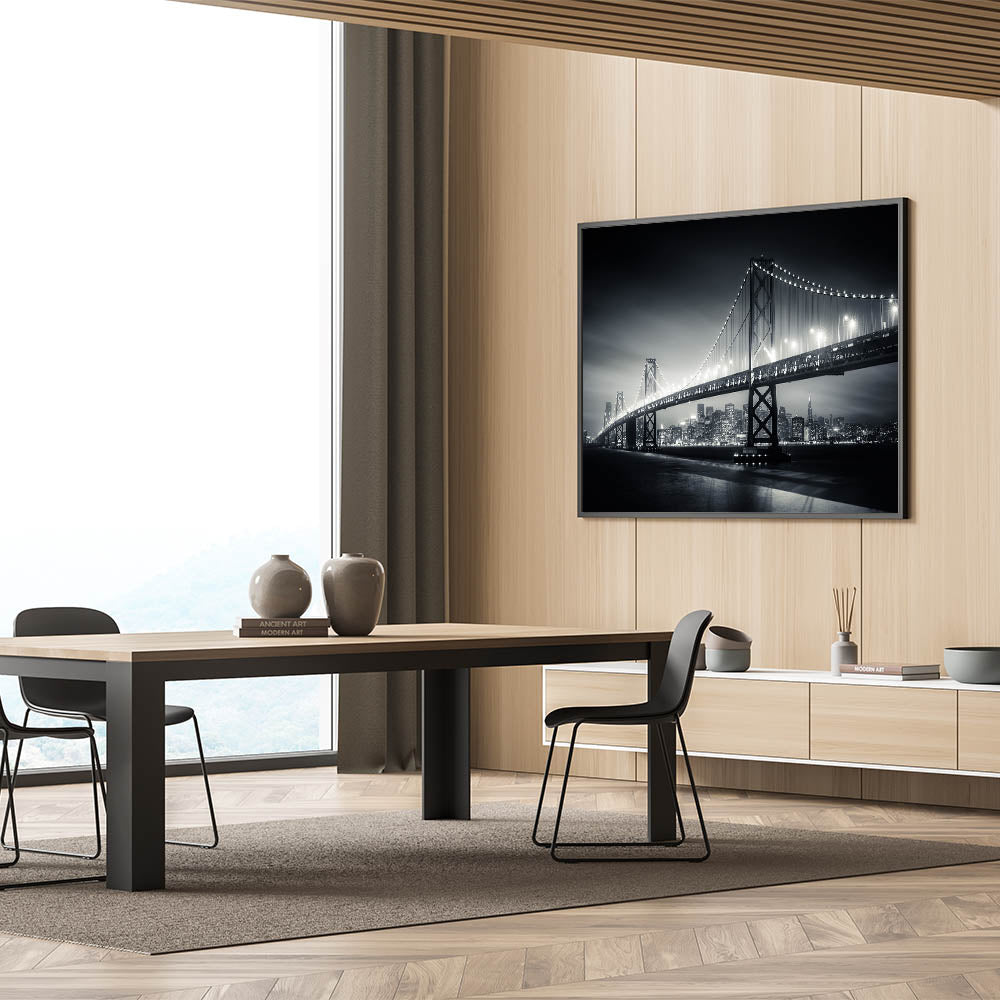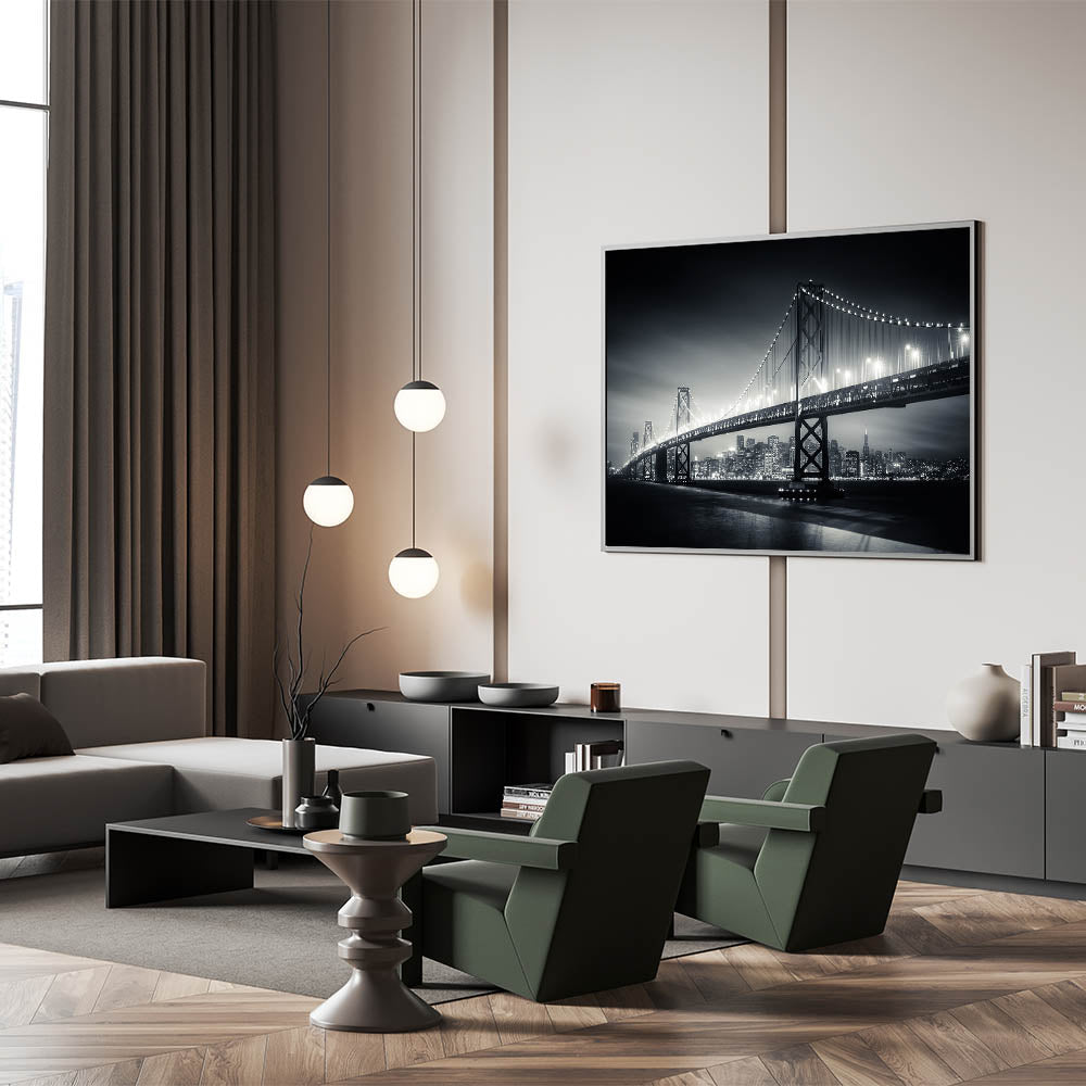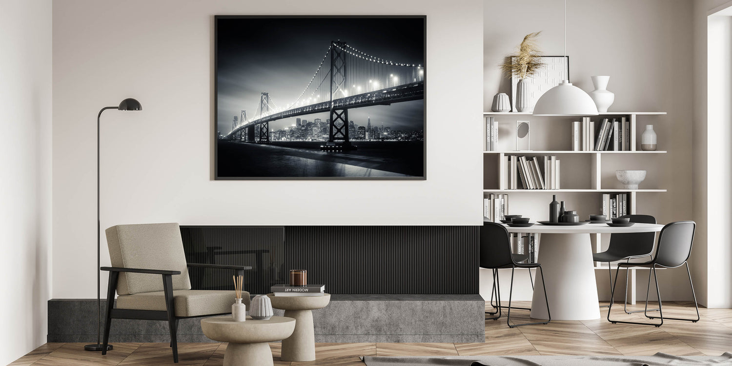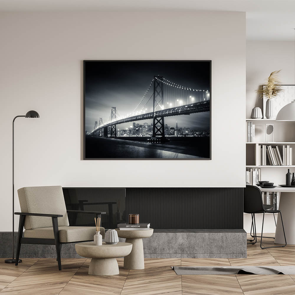 Elevate your decor with this captivating San Francisco wall art, featuring a dramatic black-and-white view of the Bay Bridge. The stunning contrast highlights the architectural elegance of this iconic structure against the city's night skyline, making it an ideal addition for modern, industrial, or minimalist interiors. Perfect for those who appreciate detailed San Francisco photography and timeless California cityscape art.
