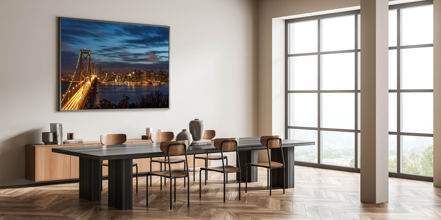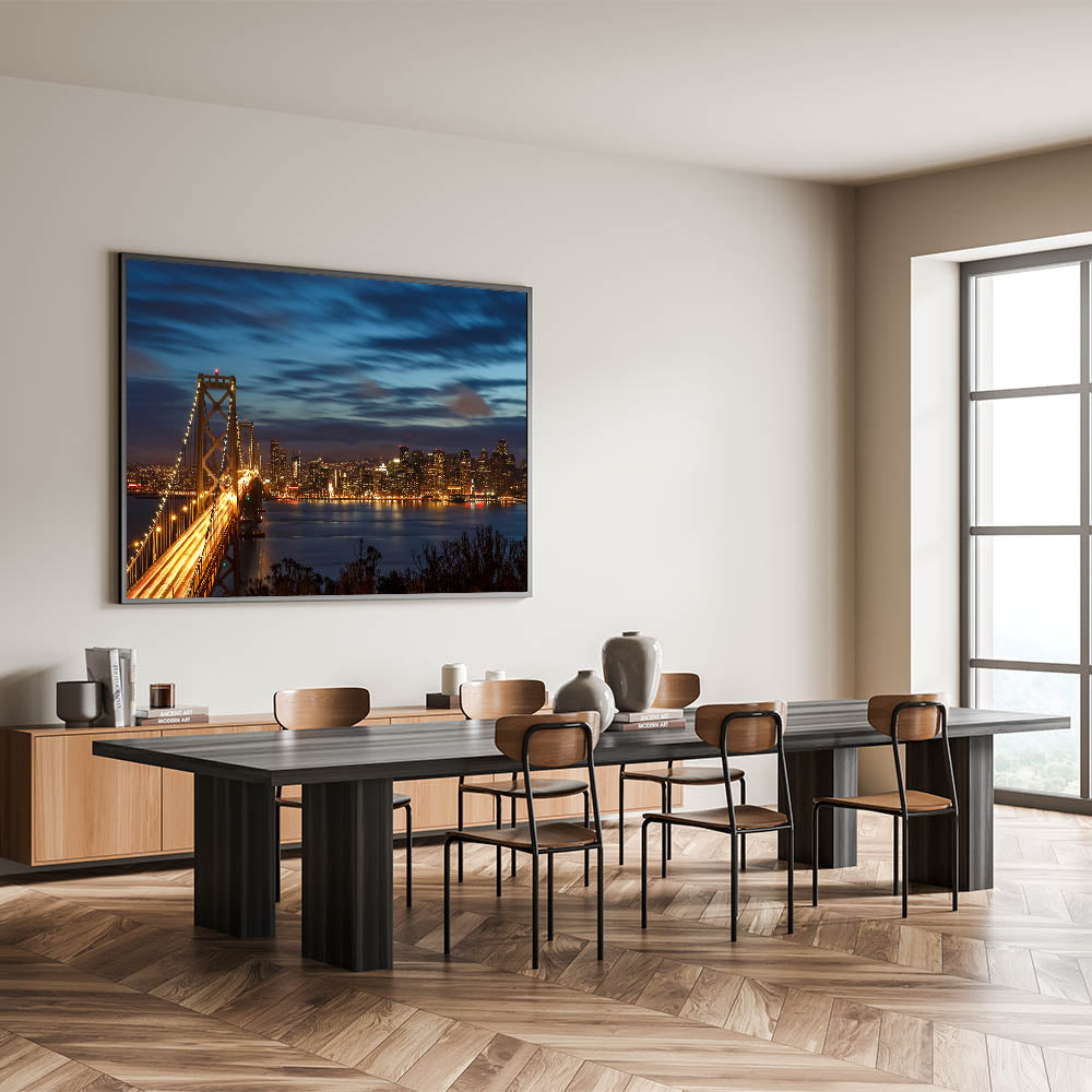 Capture the beauty of San Francisco with this stunning wall art featuring the Golden Gate Bridge and the vibrant city skyline at dusk. Perfect for adding a touch of elegance to your living space or office, this artwork showcases one of California's most iconic landmarks in a captivating scene.