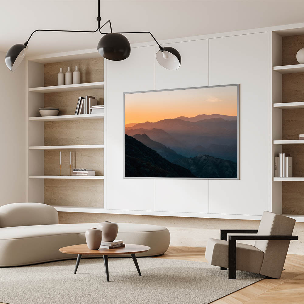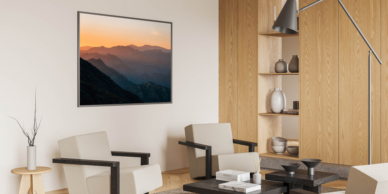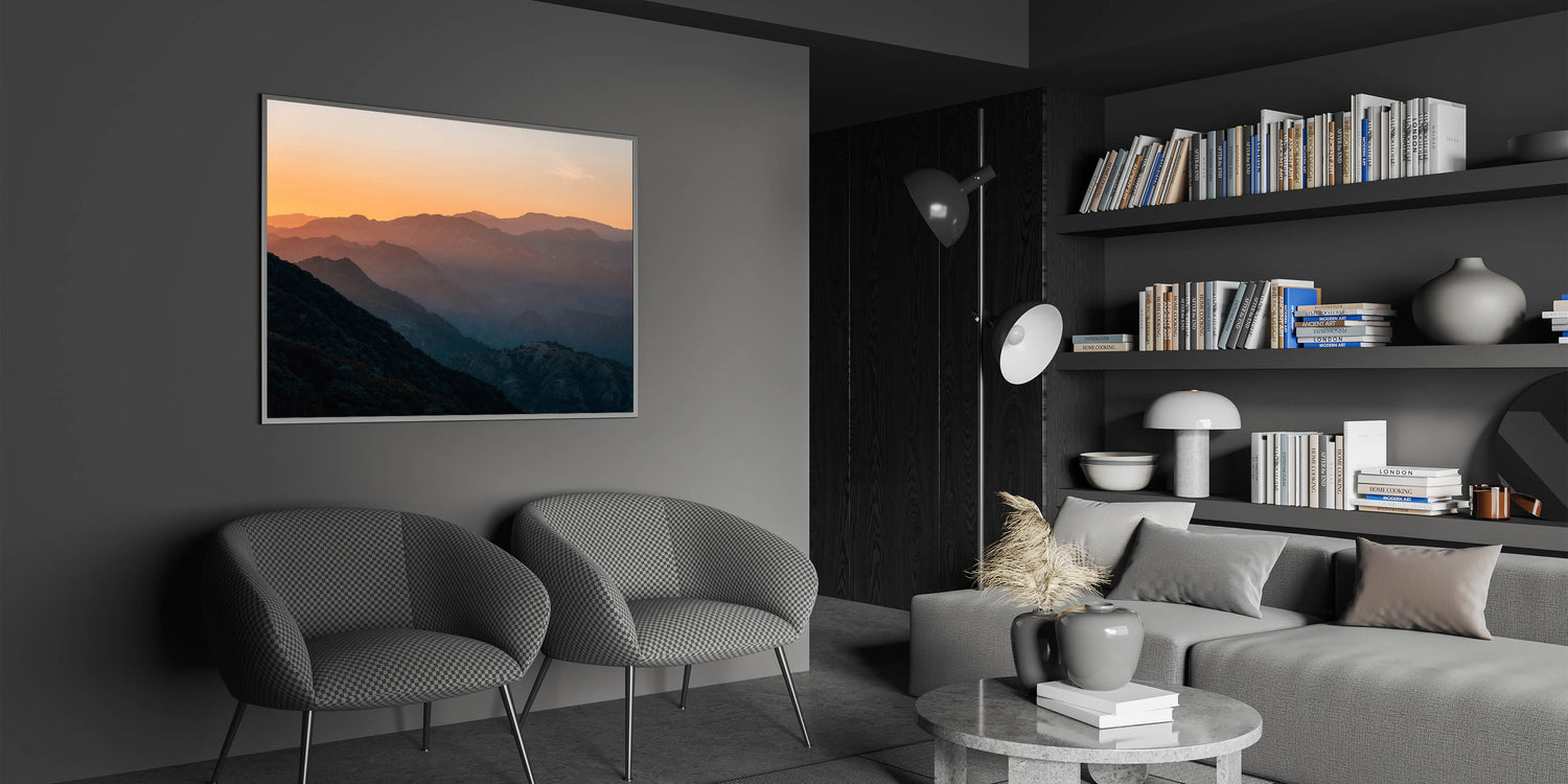 Experience the tranquil beauty of the Santa Barbara mountains with this captivating wall art, featuring a stunning sunset over the rolling hills. The layers of the landscape fade into the distance, with warm hues of orange and yellow blending into deep greens and blues, creating a peaceful and atmospheric scene. Perfect for nature lovers, this artwork brings the serene charm of California's rugged beauty into any space.