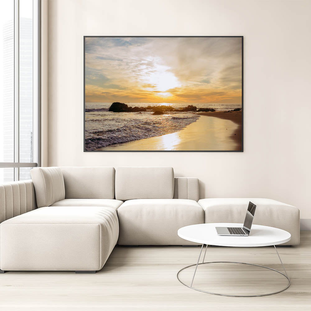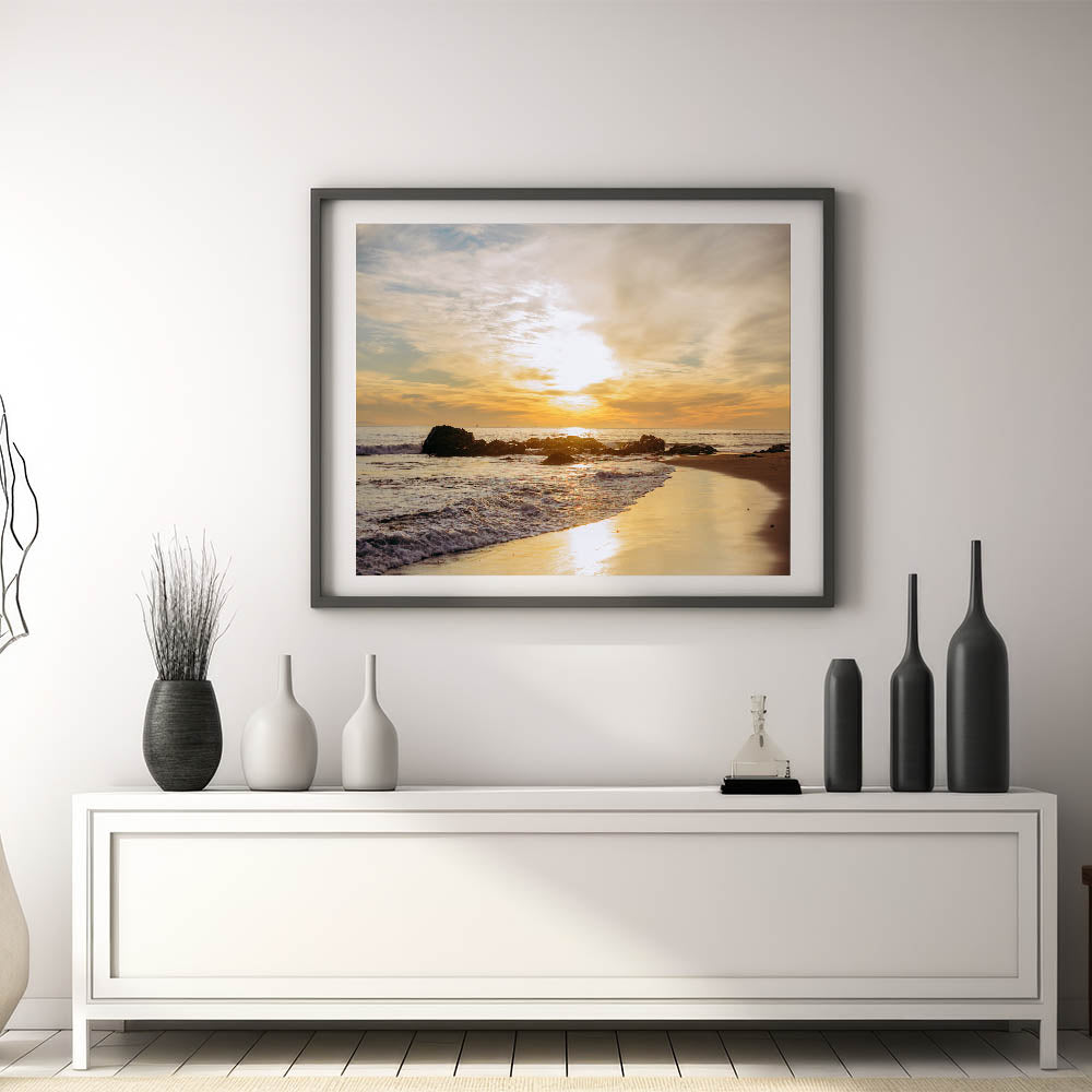 Embrace the serene beauty of a Santa Barbara sunset with this stunning wall art, featuring a warm golden glow over the ocean and sandy beach. The setting sun illuminates the sky and waves, casting a beautiful light on the rocky shoreline. This artwork captures the tranquil charm of the California coast, making it a perfect addition to any room seeking a touch of natural elegance.