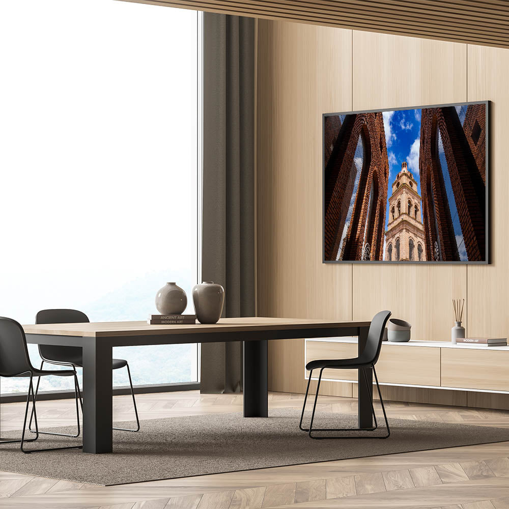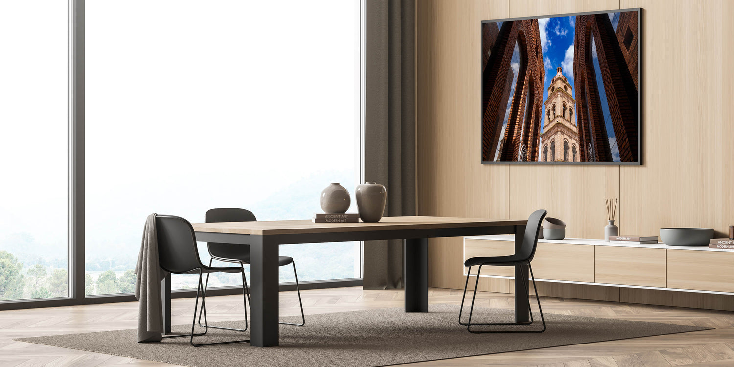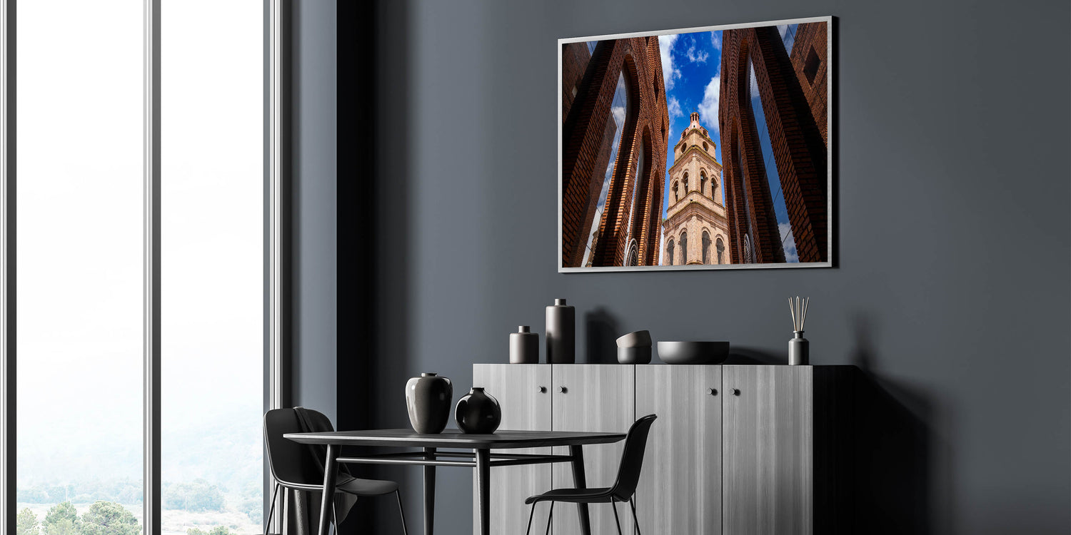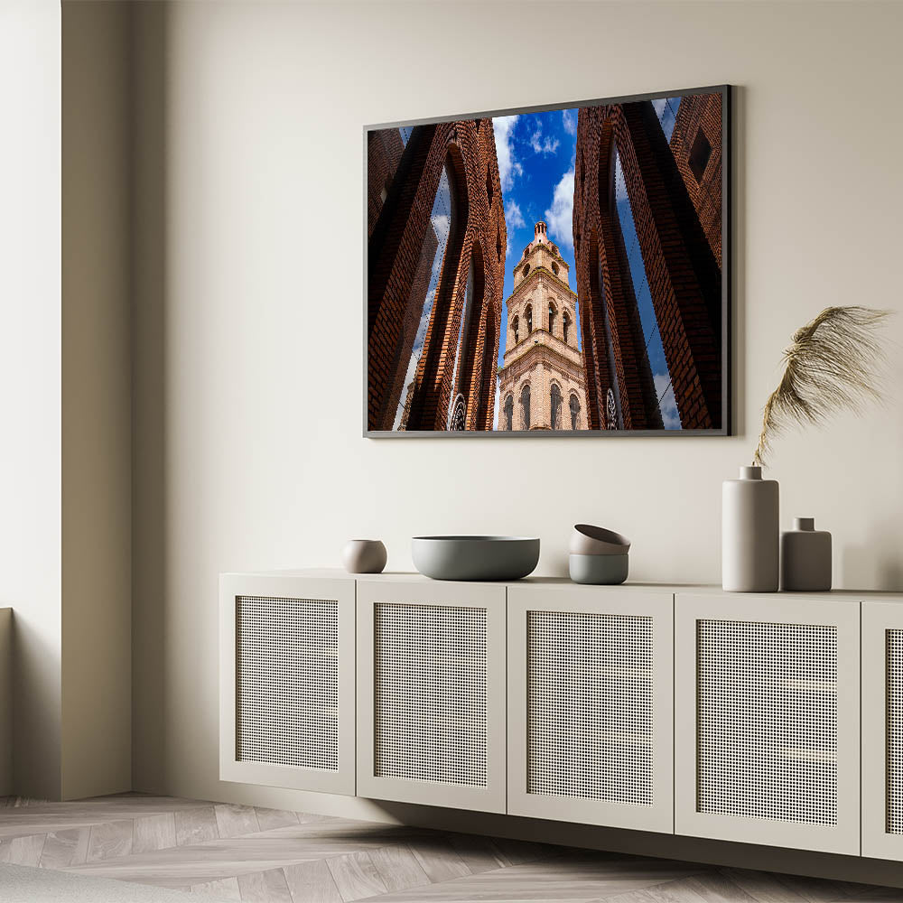 Capture the striking beauty of Santa Cruz’s historic architecture with this captivating wall art. Featuring a stunning upward view of a majestic brick tower framed by symmetrical arches, this piece brings an air of sophistication and charm to any room. The vibrant blue sky in the background contrasts beautifully with the rich tones of the brick, making this artwork a perfect addition to modern or traditional decor. With multiple framing options, this piece is a versatile choice for any space, whether at home or in the office.