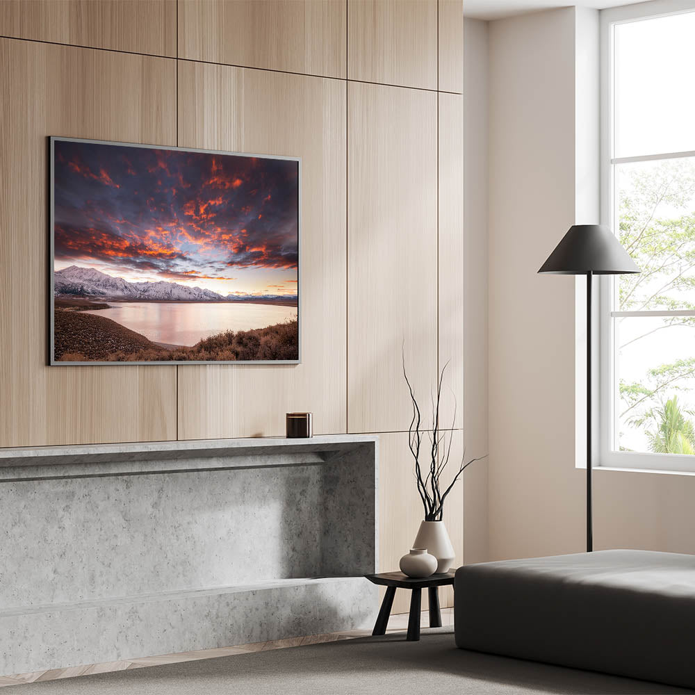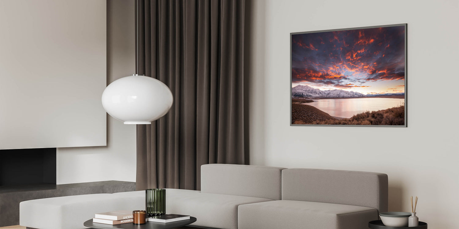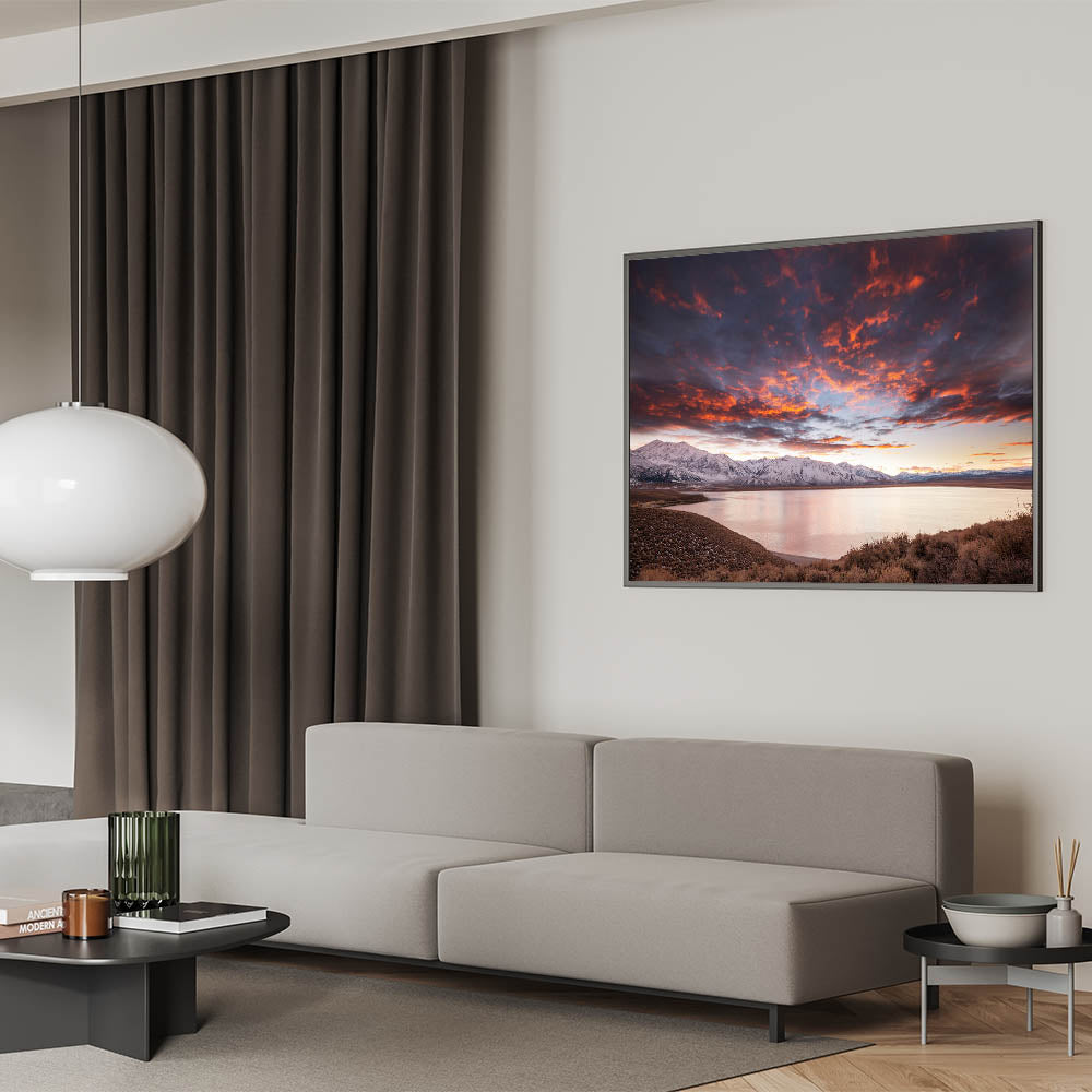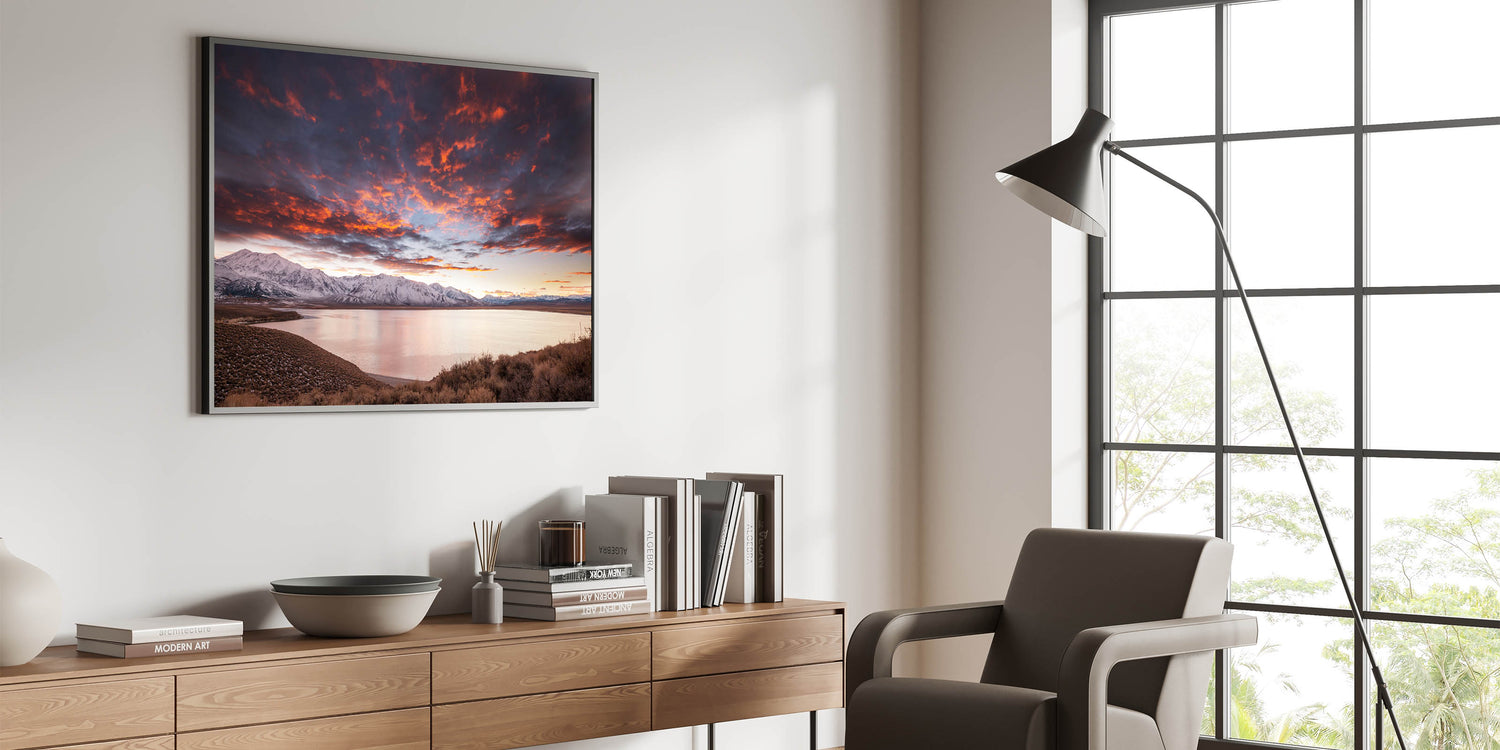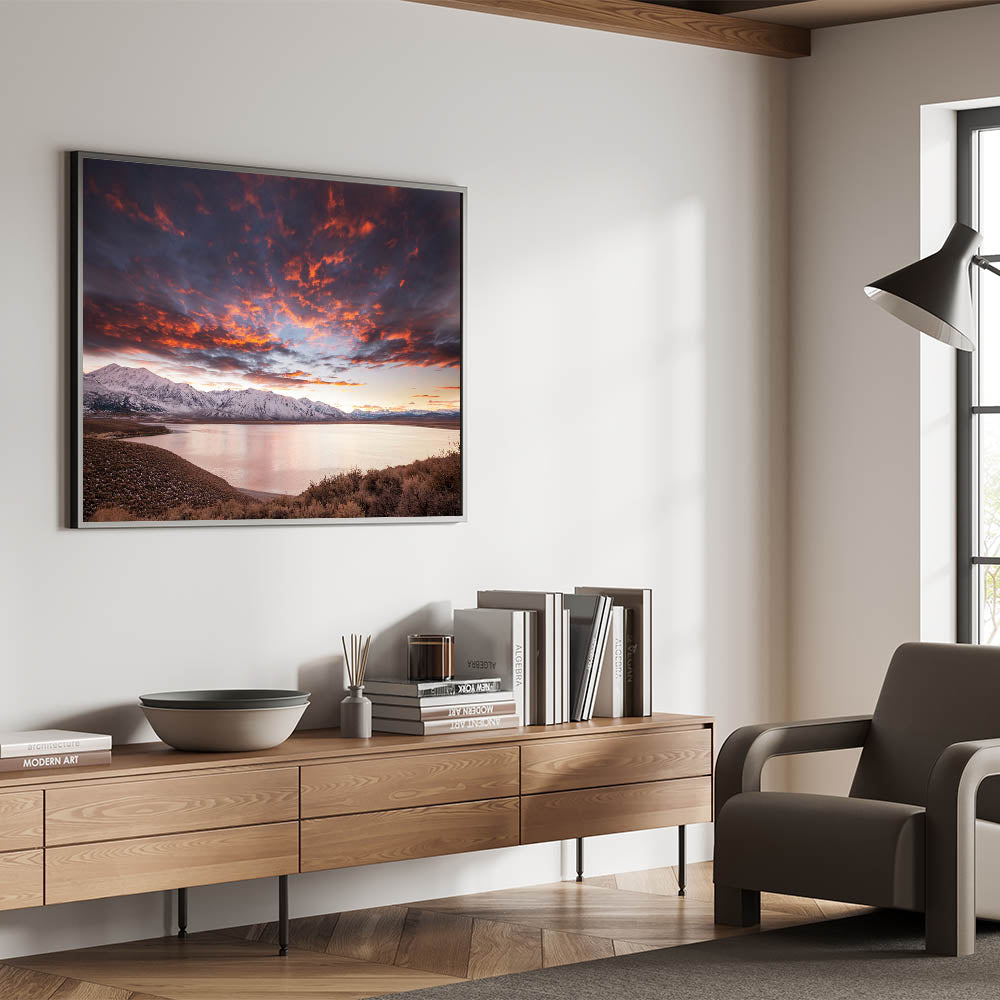 Enhance your decor with this stunning Sierra Nevada canvas art, capturing a breathtaking sunset over snow-capped mountains and a serene lake. The rich orange and red tones of the sky blend with the soft whites and grays of the mountain peaks, creating a dramatic and visually striking contrast. Perfect for nature enthusiasts and lovers of scenic landscapes, this piece will instantly add warmth and beauty to any room.