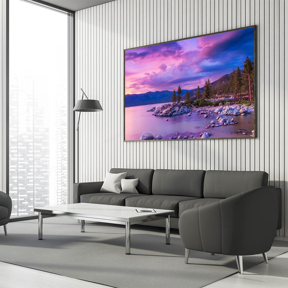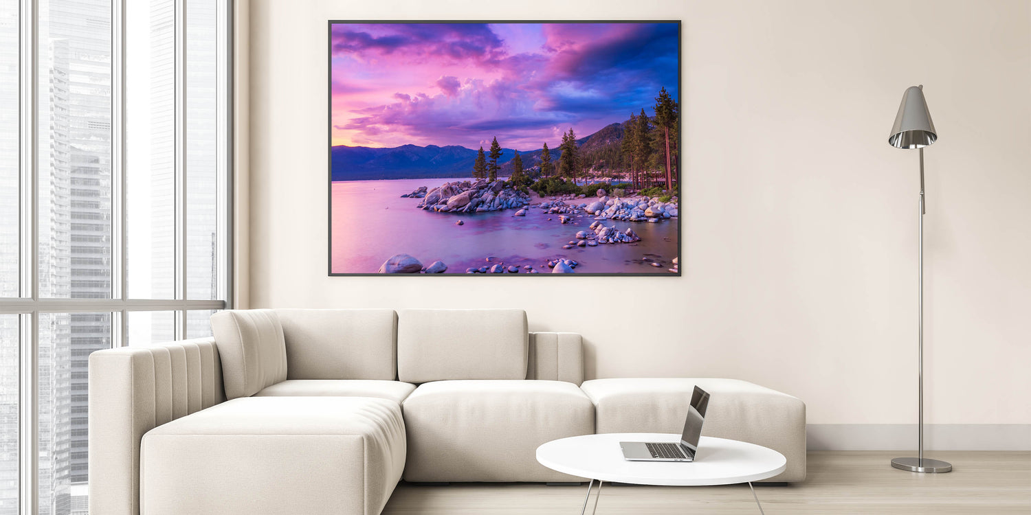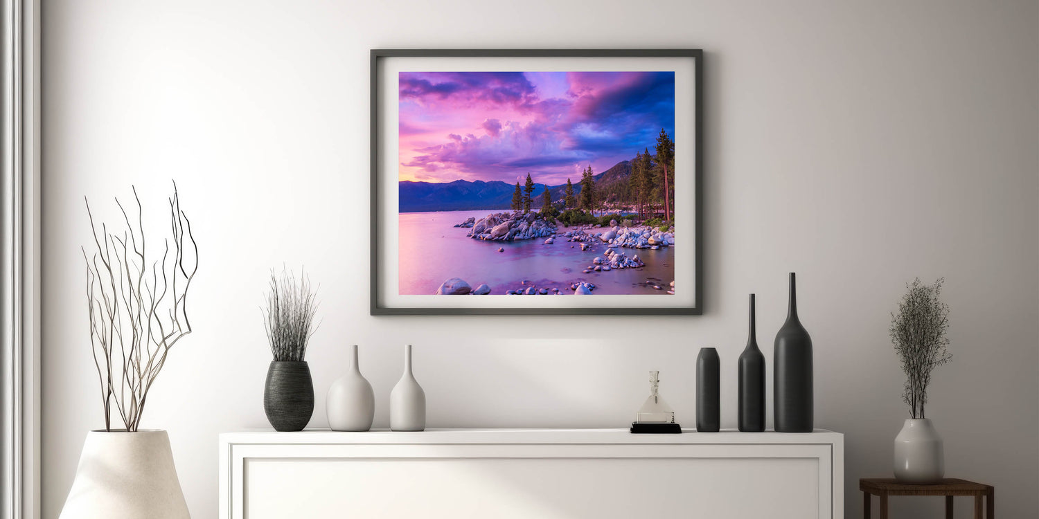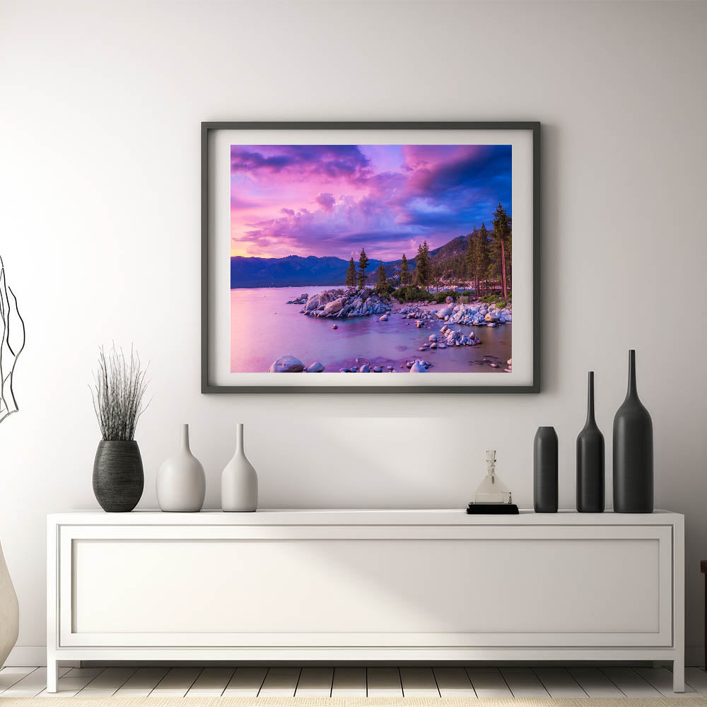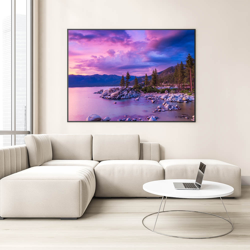 Bring the beauty of the Sierra Nevada mountains into your home with this stunning wall art. This piece showcases a vibrant sunset over a tranquil lakeside setting, with rich purples, pinks, and blues blending seamlessly into the serene landscape. Perfect for nature lovers and those who appreciate scenic views, this artwork will transform any space into a calming retreat.