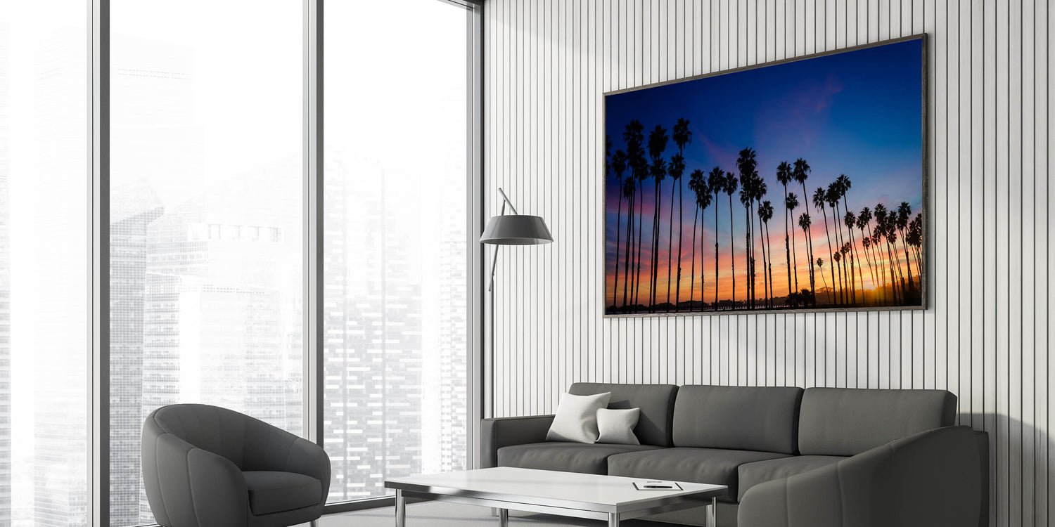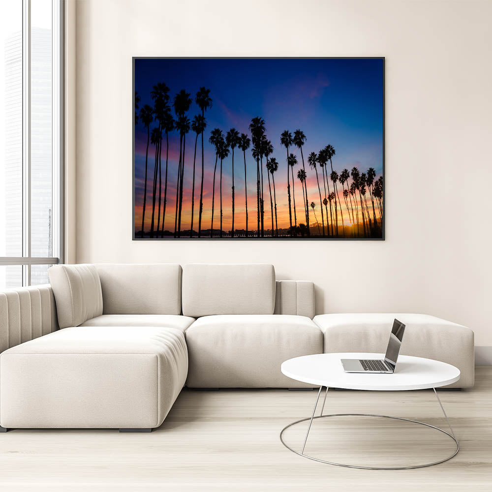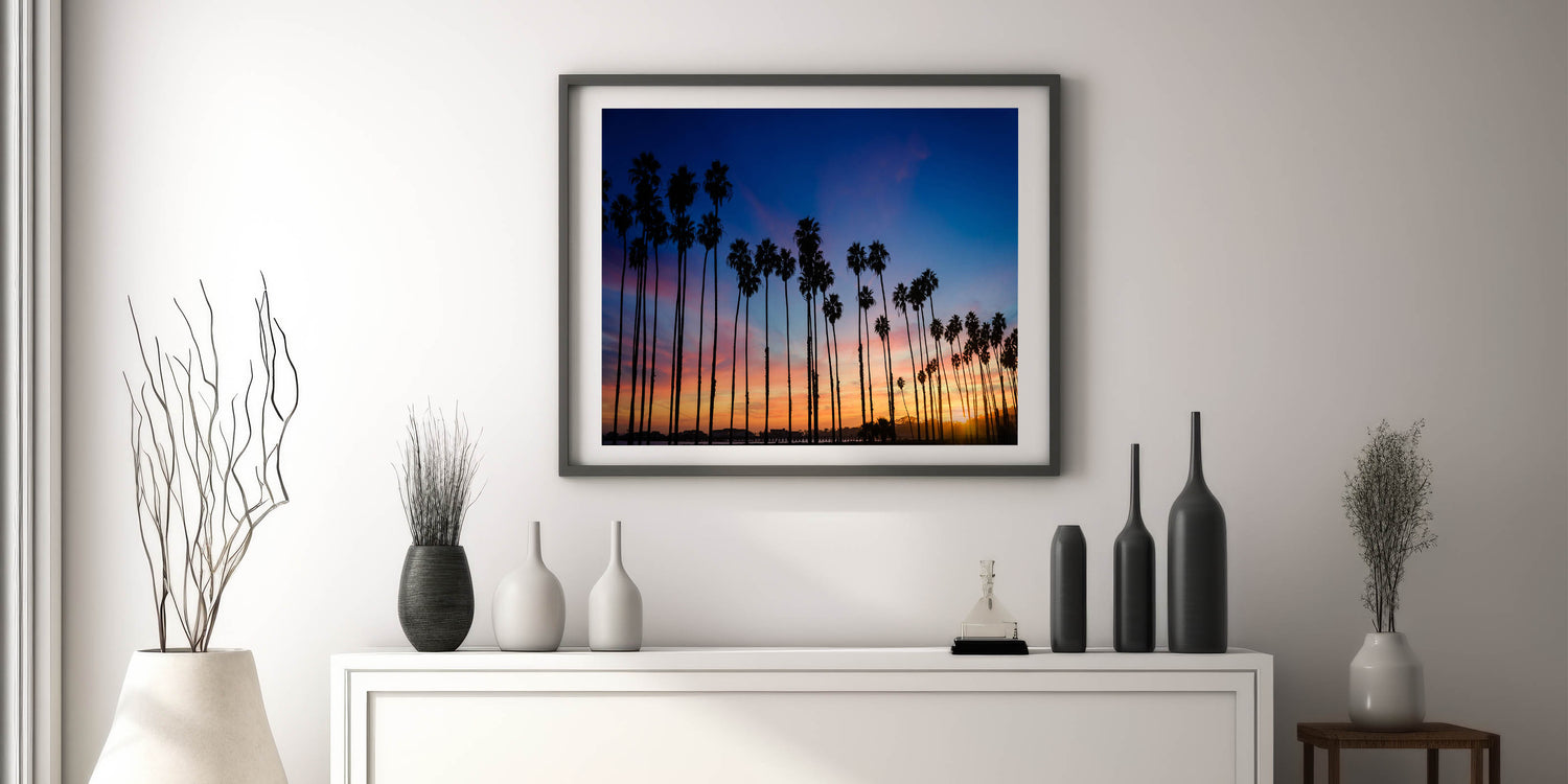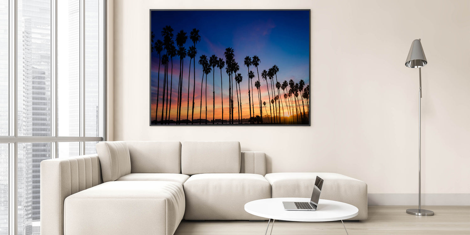 Available in different display options, this piece will bring the magic of Santa Barbara's sunset palm trees into your home, creating a soothing and visually stunning atmosphere.