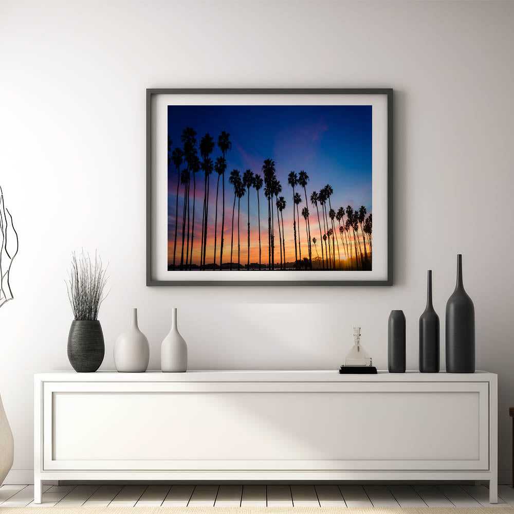 Experience the beauty of a California sunset with this stunning wall art, showcasing tall palm trees silhouetted against a vivid twilight sky in Santa Barbara. The blend of deep blue, orange, and pink hues creates a captivating coastal scene, making it a perfect piece for enhancing any space with the serene charm of California’s coast. This artwork is ideal for those who love the beauty of nature and coastal decor.