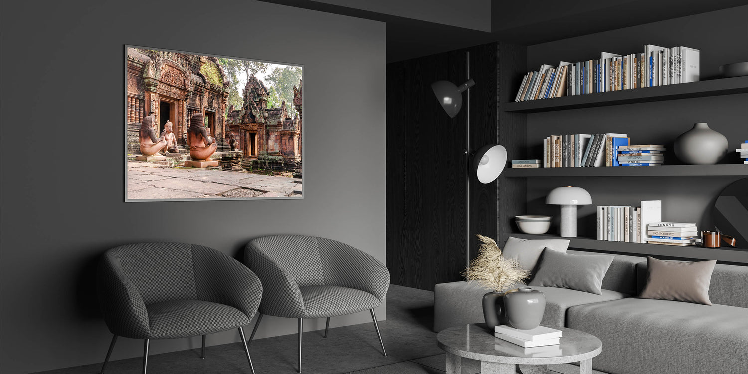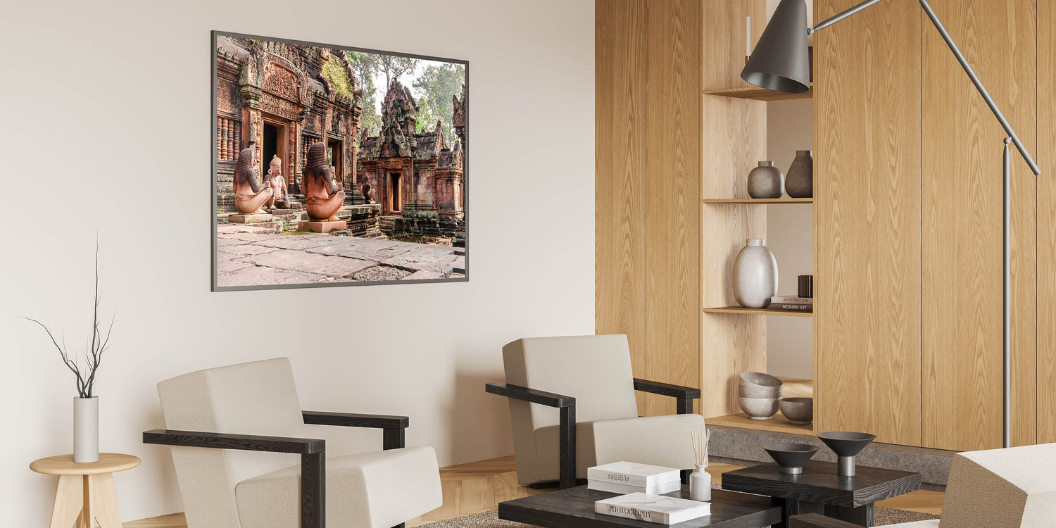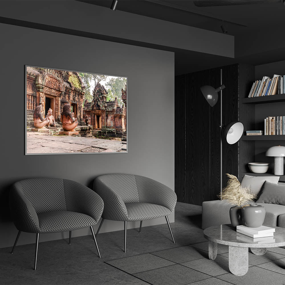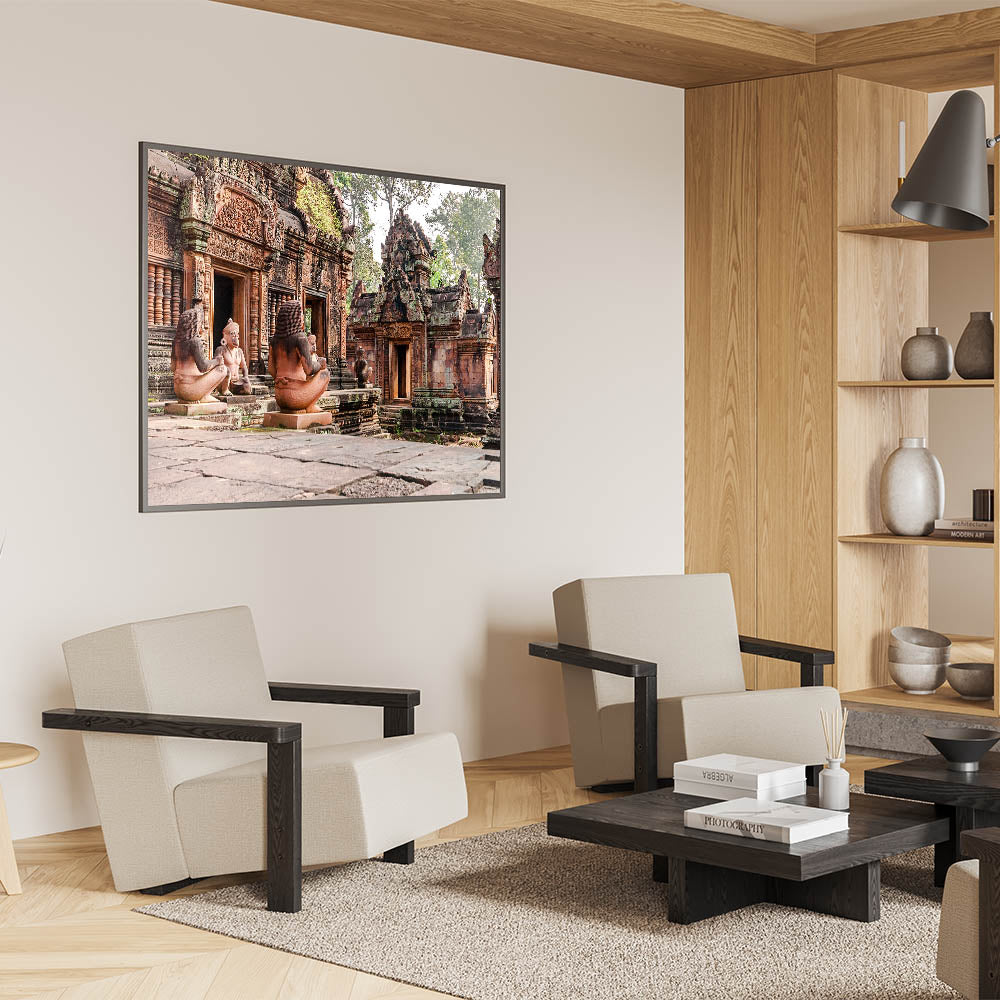 Bring a piece of Cambodian history and culture into your home with this beautiful representation of Banteay Srei Temple. Perfect for those who appreciate Southeast Asia's rich heritage, this artwork is a timeless addition to any room.