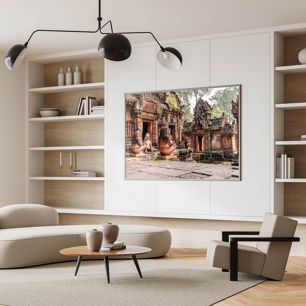 Enhance your home decor with this stunning piece of Cambodia wall art featuring the intricate details of Banteay Srei Temple, a true gem in Siem Reap. Known for its exquisite carvings and warm sandstone hues, this artwork captures the essence of Khmer culture and ancient Cambodian architecture.