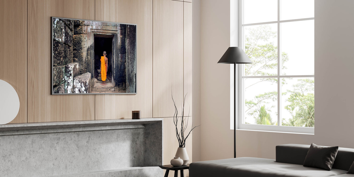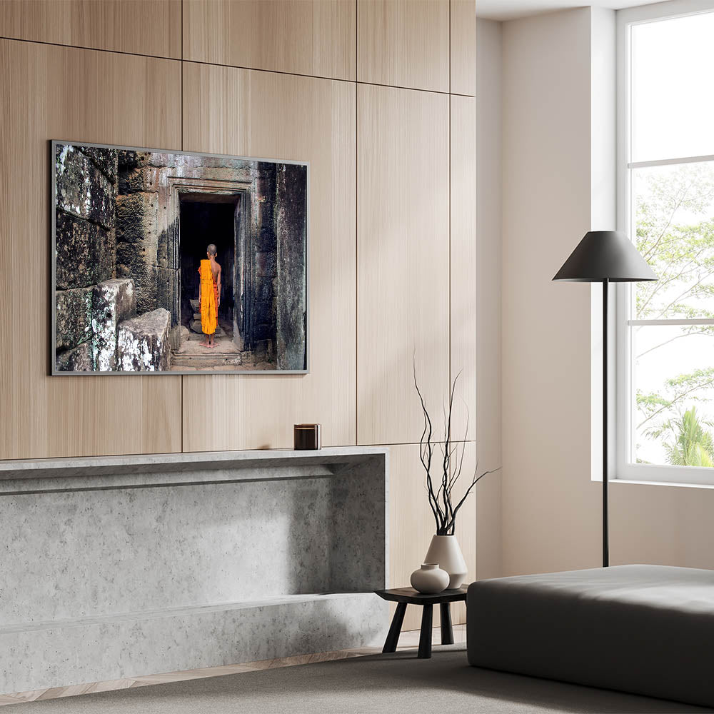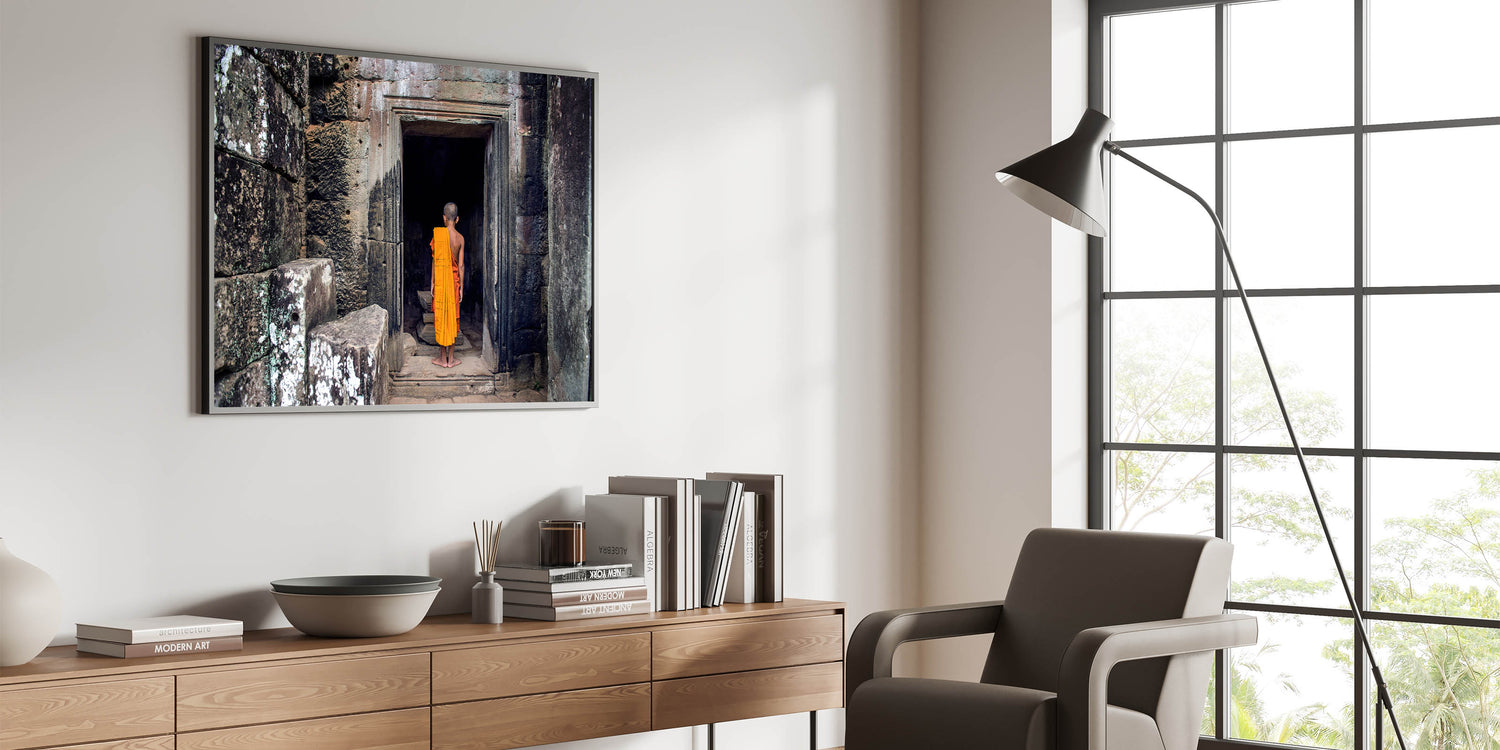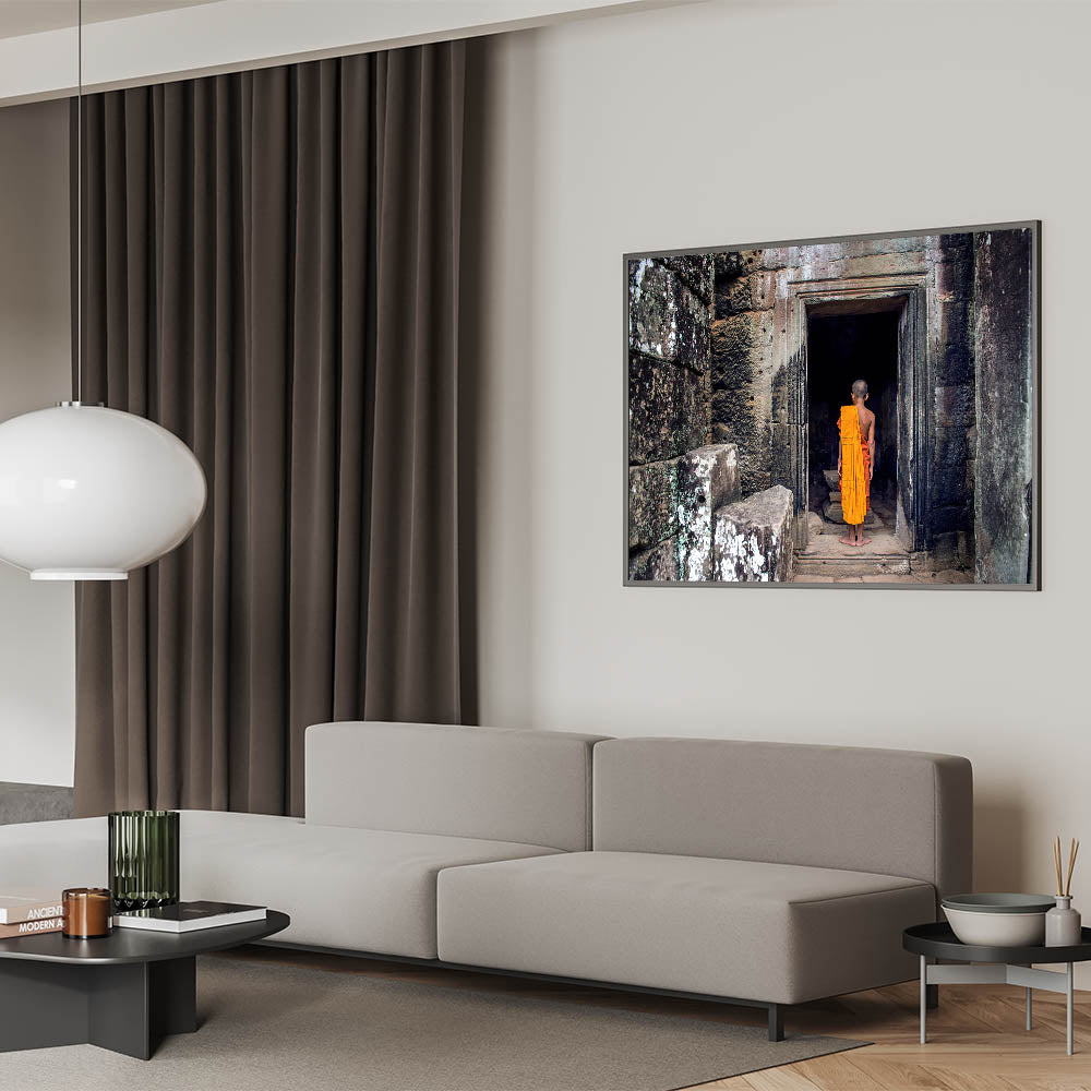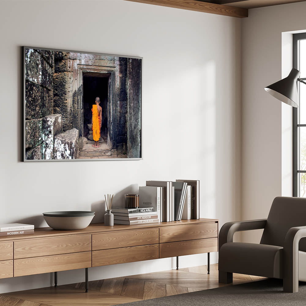 • High-Resolution Print: The intricate textures of the temple's stonework and the rich color of the monk's robe are rendered in stunning detail.