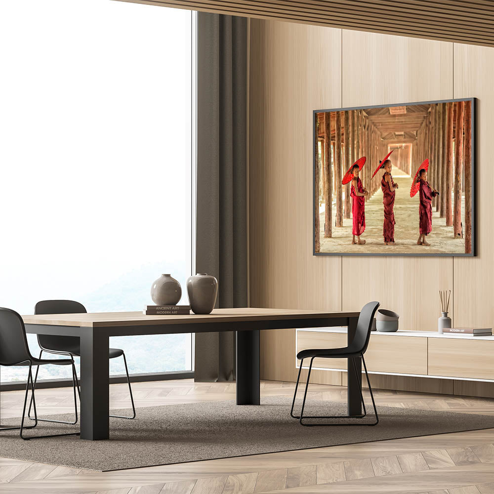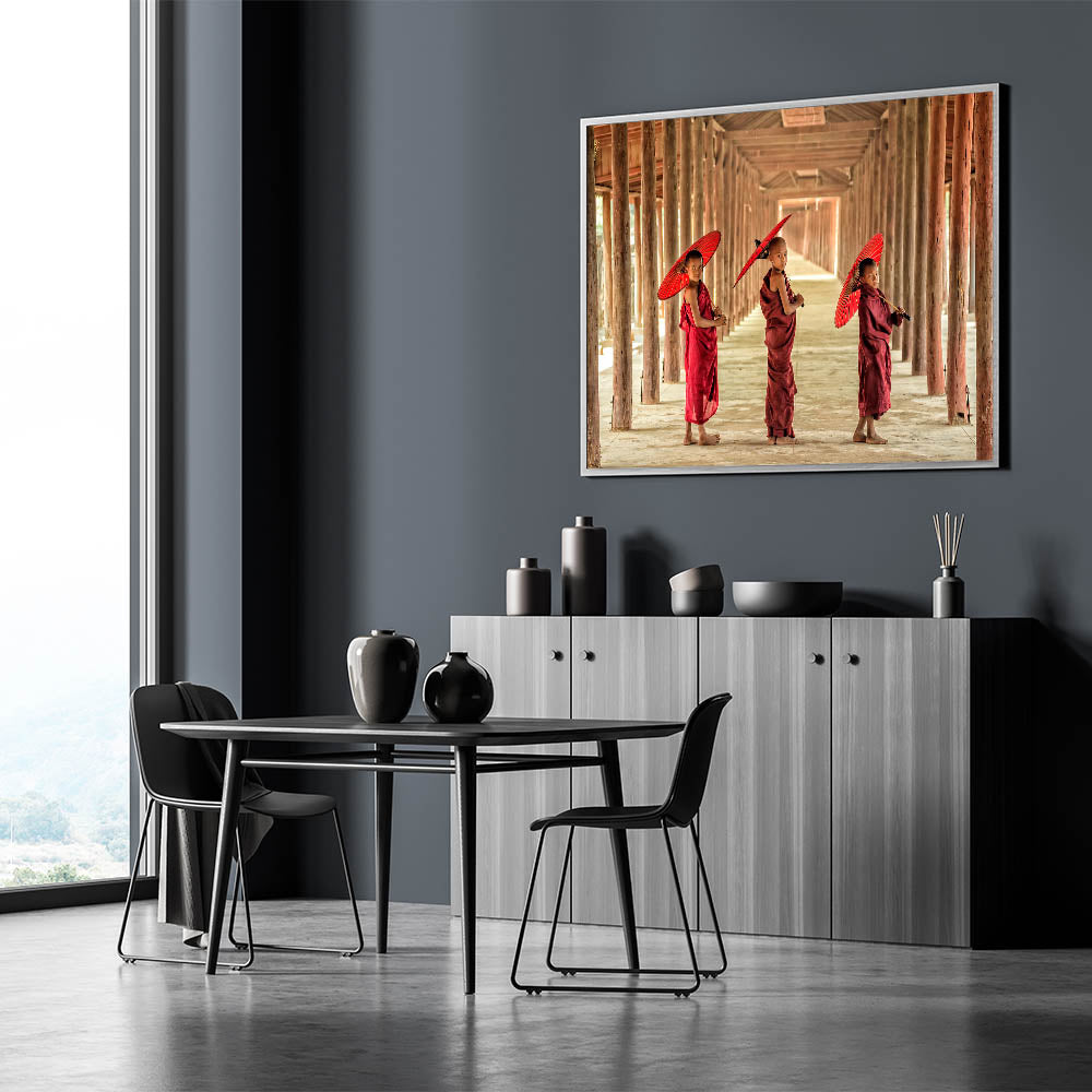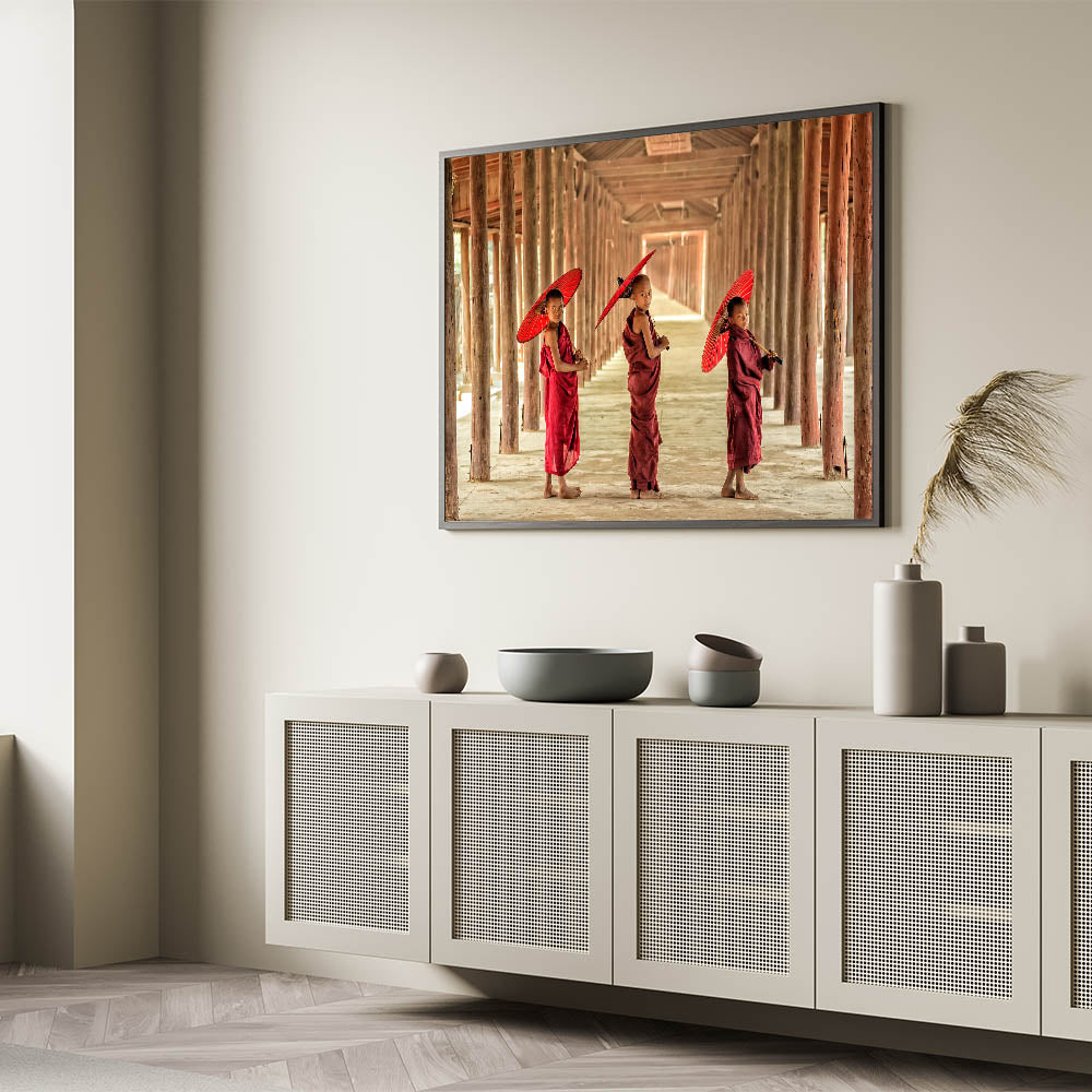 Bring the serene beauty of Cambodian culture into your home with this striking piece of Siem Reap Photography, featuring young Buddhist monks holding traditional red umbrellas. This captivating scene, set within an ancient temple corridor, captures the tranquil essence of Khmer spiritual life. The vibrant red robes and umbrellas stand out against the muted tones of the wooden columns, making this artwork a visually compelling addition to any space.
