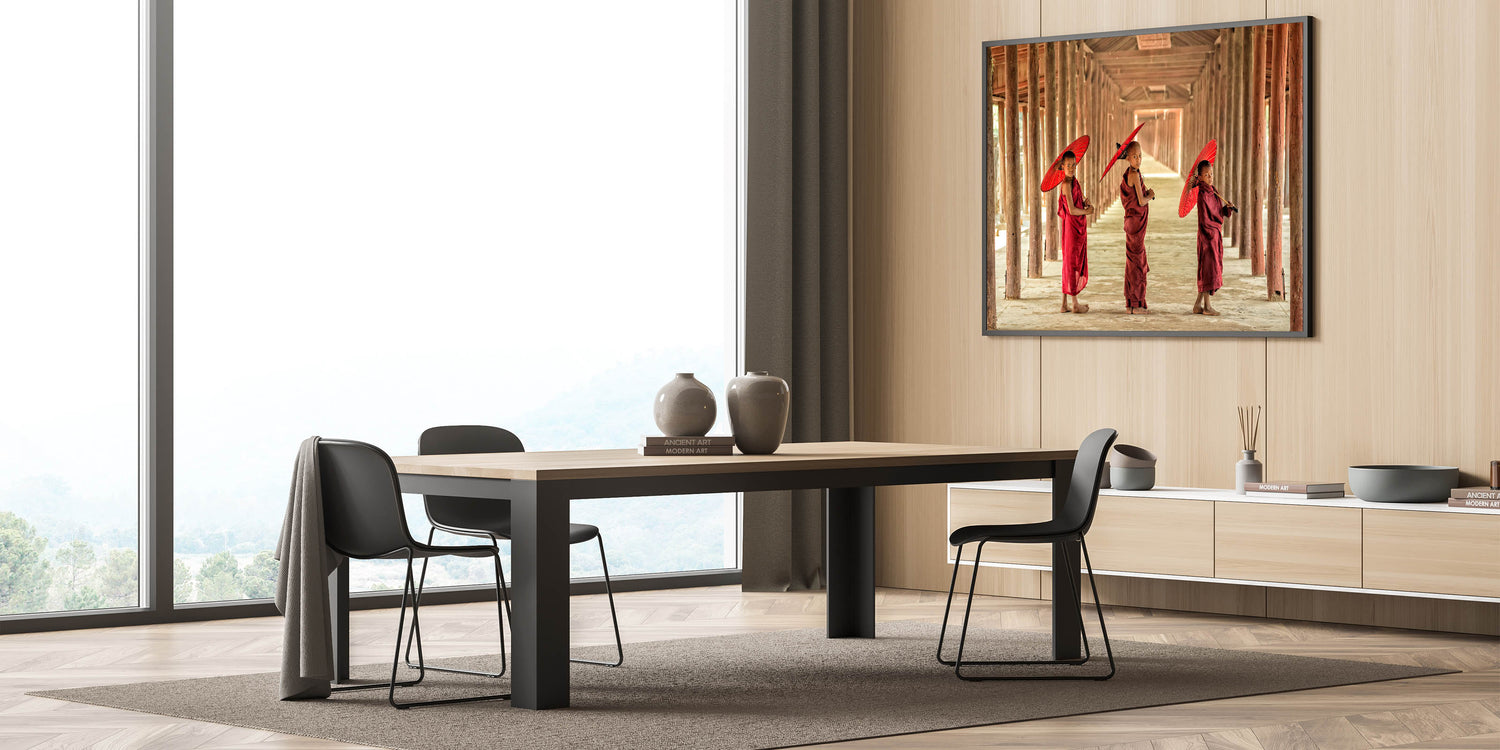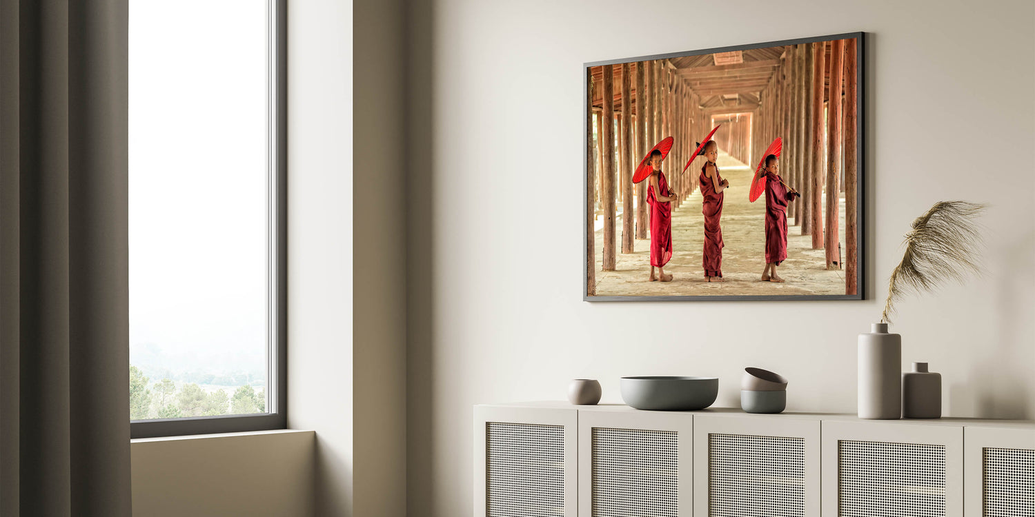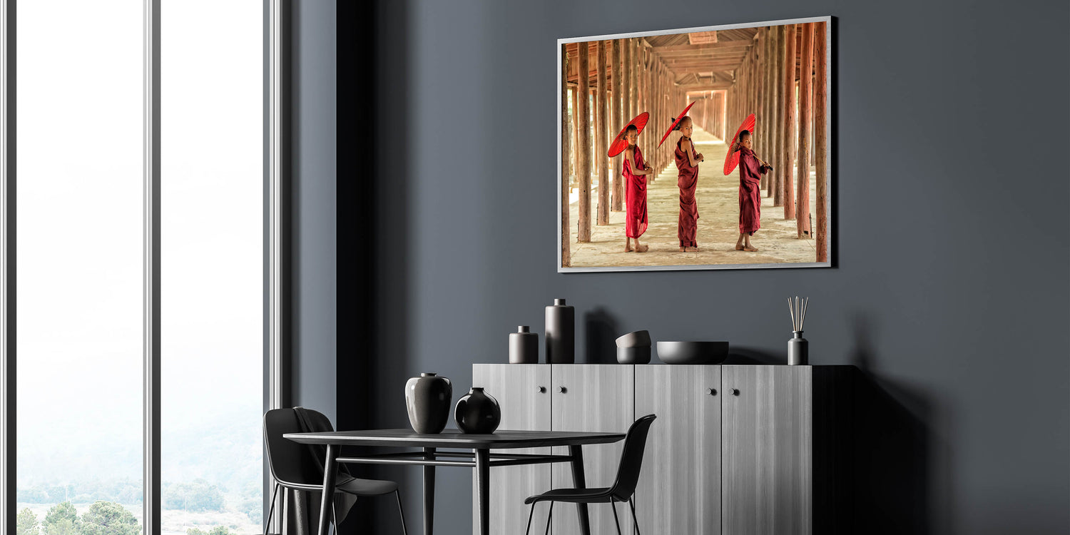 Bring the serene beauty of Cambodian culture into your home with this striking piece of Siem Reap Photography, featuring young Buddhist monks holding traditional red umbrellas. This captivating scene, set within an ancient temple corridor, captures the tranquil essence of Khmer spiritual life. The vibrant red robes and umbrellas stand out against the muted tones of the wooden columns, making this artwork a visually compelling addition to any space.