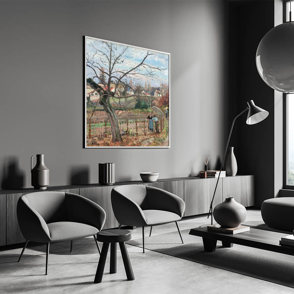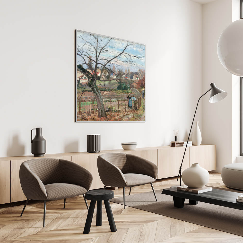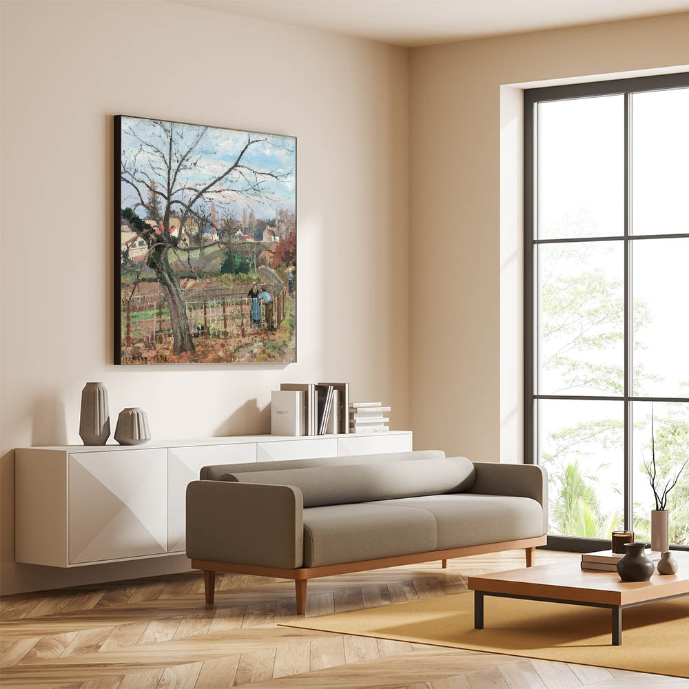 Bring the quiet charm of rural life into your home with this captivating Camille Pissarro painting. This Impressionist artwork captures a peaceful garden scene, with villagers engaging in conversation under the bare branches of a tree. The subtle details of the French countryside, combined with Pissarro’s skillful use of light and shadow, make this piece a perfect choice for those who love the serenity of nature and rural landscapes.