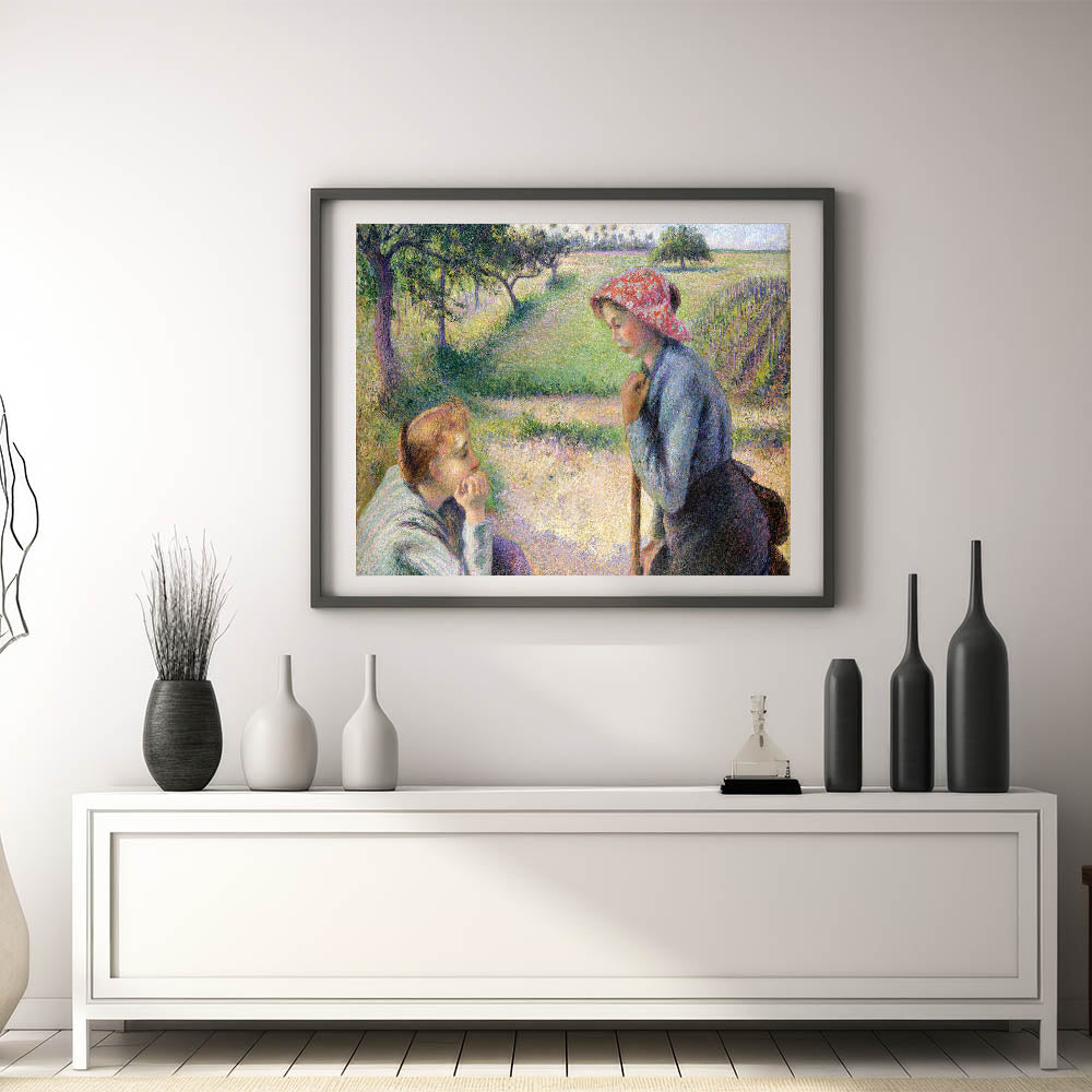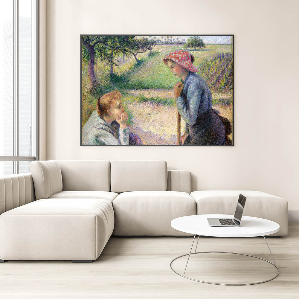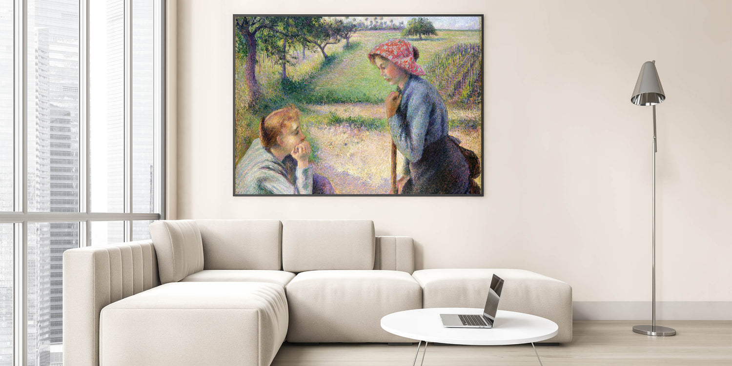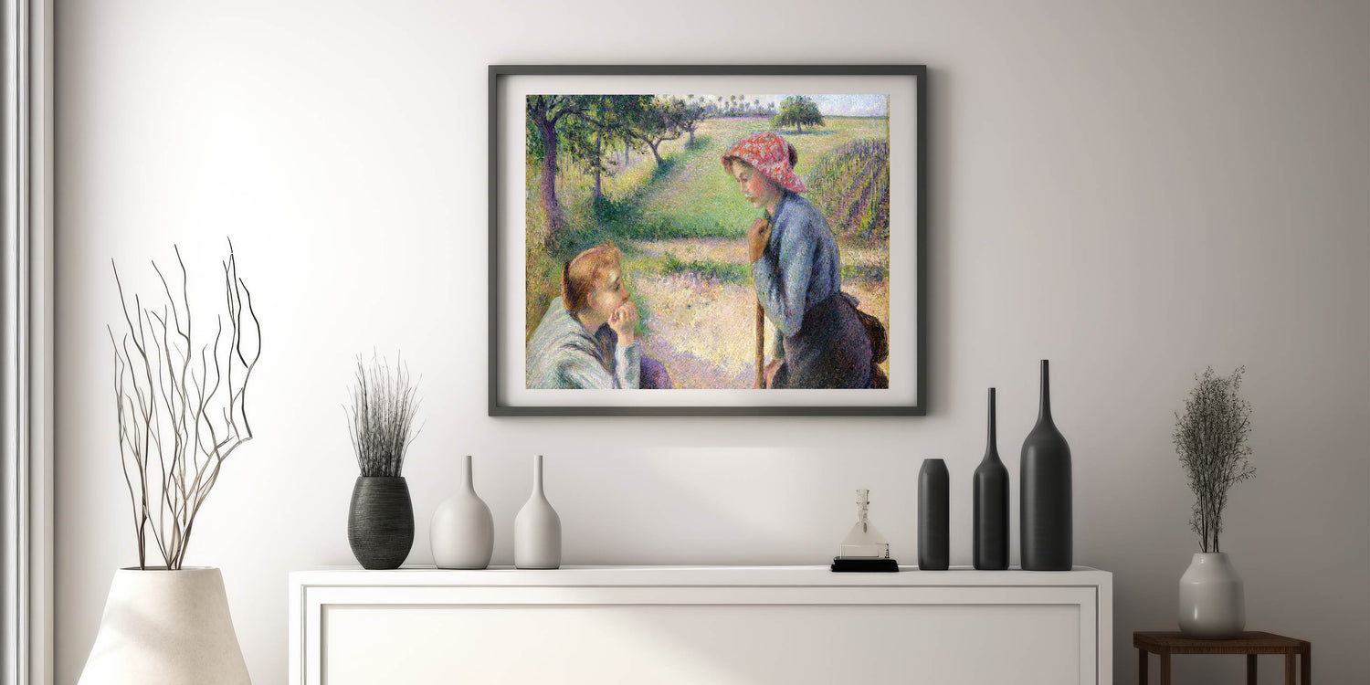 Celebrate the simple beauty of rural life with this captivating Camille Pissarro painting. Featuring two young women in conversation amidst a serene countryside, this artwork reflects the heart of peasant life in 19th-century France. Pissarro’s masterful use of color and light creates a soft, harmonious scene that captures the tranquility and simplicity of the moment. This Impressionist piece is perfect for adding warmth and character to any space.