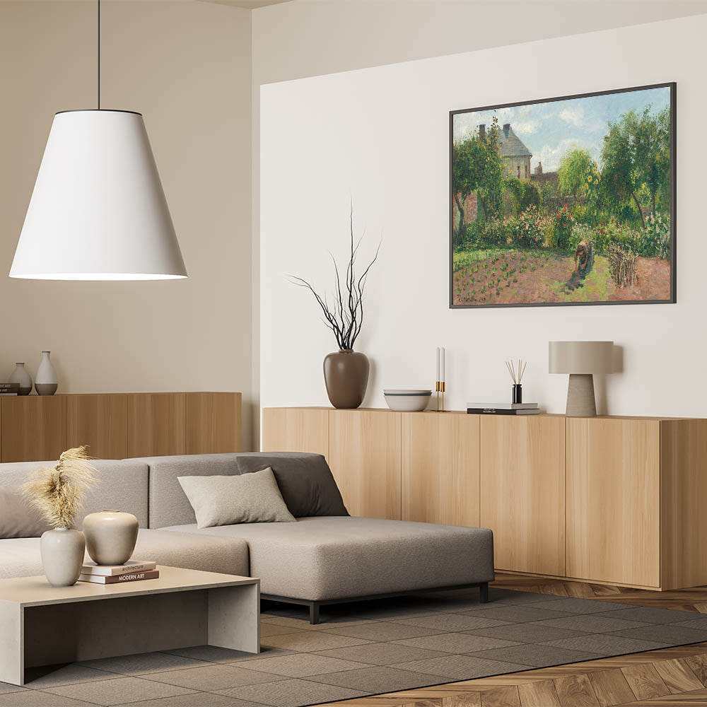 Celebrate the simple beauty of country life with this serene garden scene by Camille Pissarro, one of the pioneers of the Impressionist movement. This charming painting depicts a tranquil moment in a blooming garden, where a gardener tends to the earth surrounded by lush greenery and vibrant flowers. Pissarro’s signature brushwork captures the intricate details of nature and the delicate play of light, creating a sense of peace and connection to the natural world.