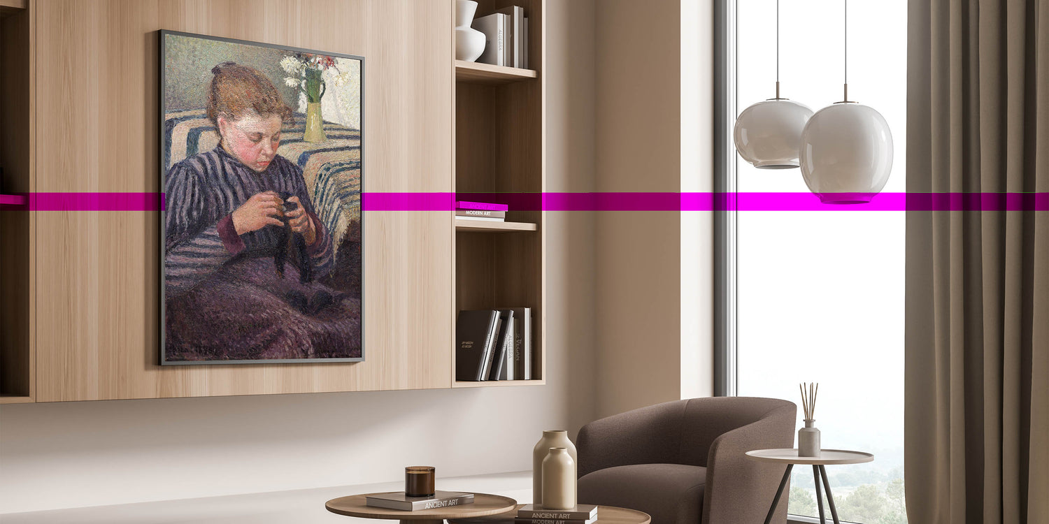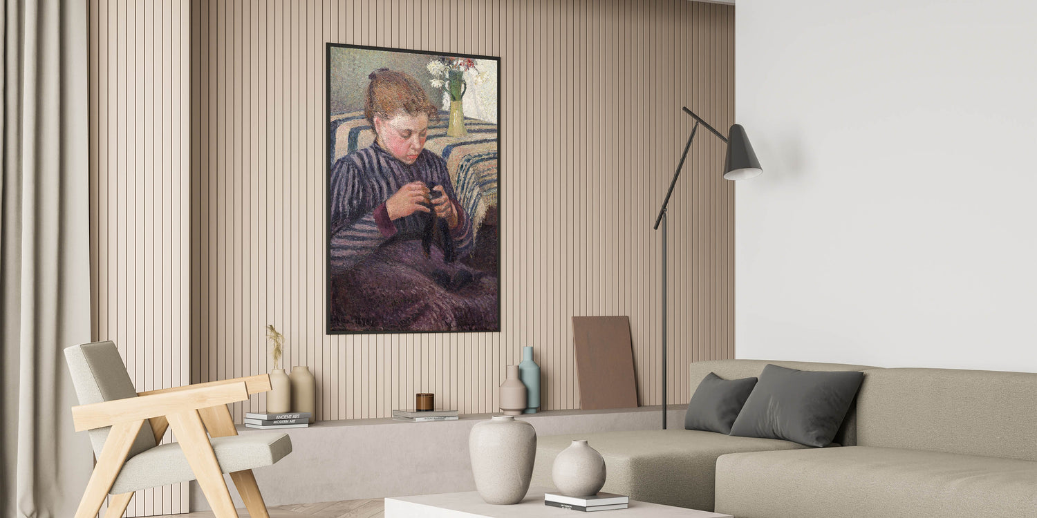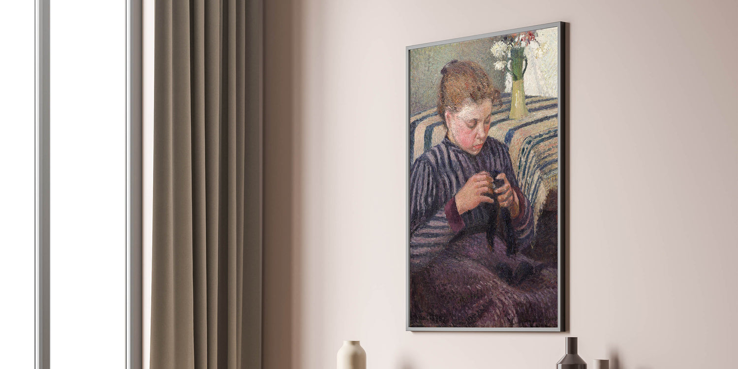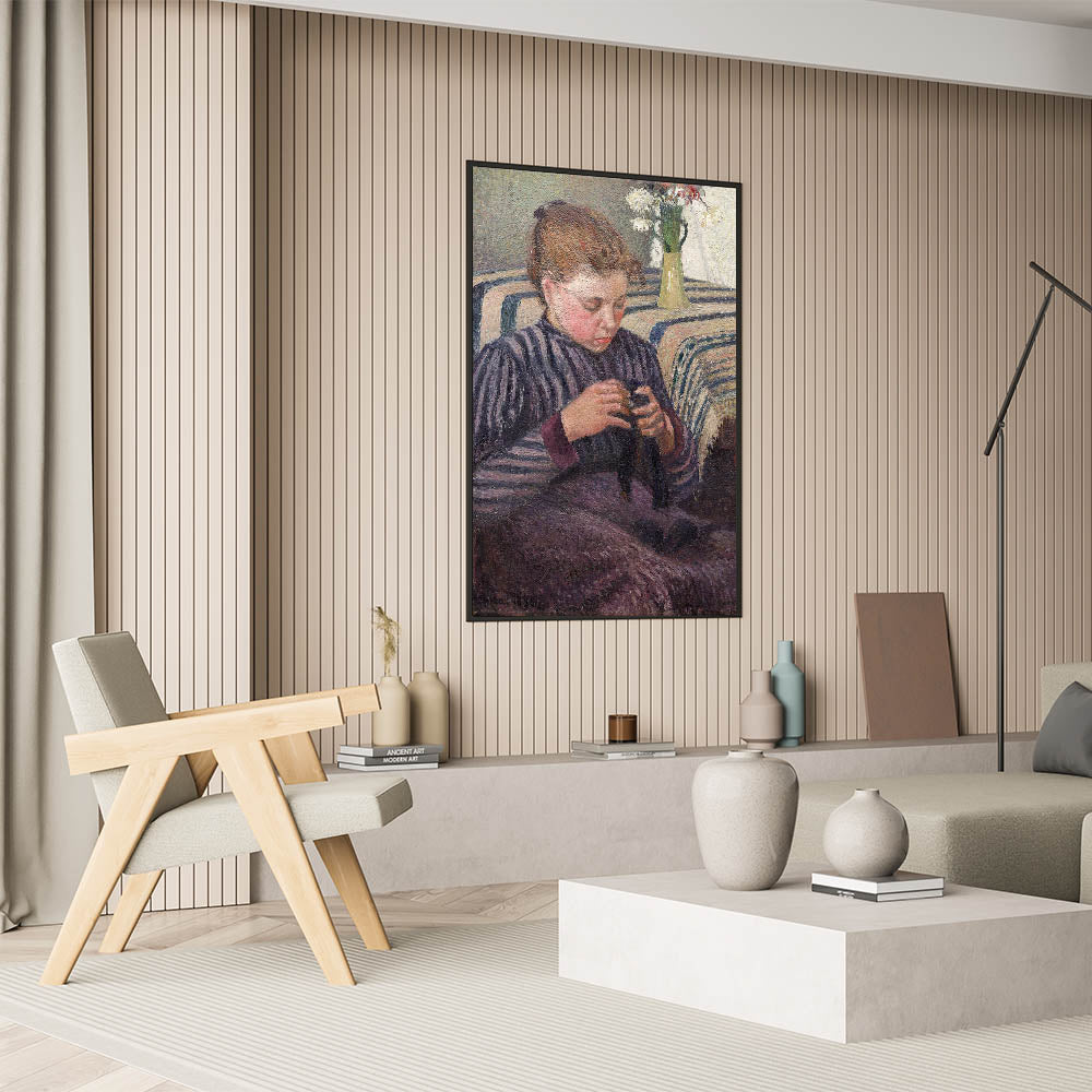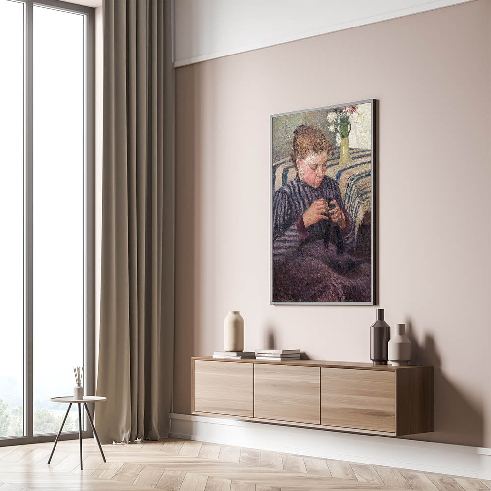Bring the quiet intimacy of everyday life into your space with this thoughtful portrait by Camille Pissarro. This Impressionist masterpiece captures a young girl engrossed in knitting, framed by the soft hues of her surroundings. Pissarro’s gentle brushstrokes and subtle use of color create a serene, reflective atmosphere, making this artwork a perfect addition to any room that seeks to evoke calm and warmth.