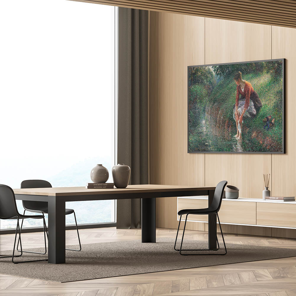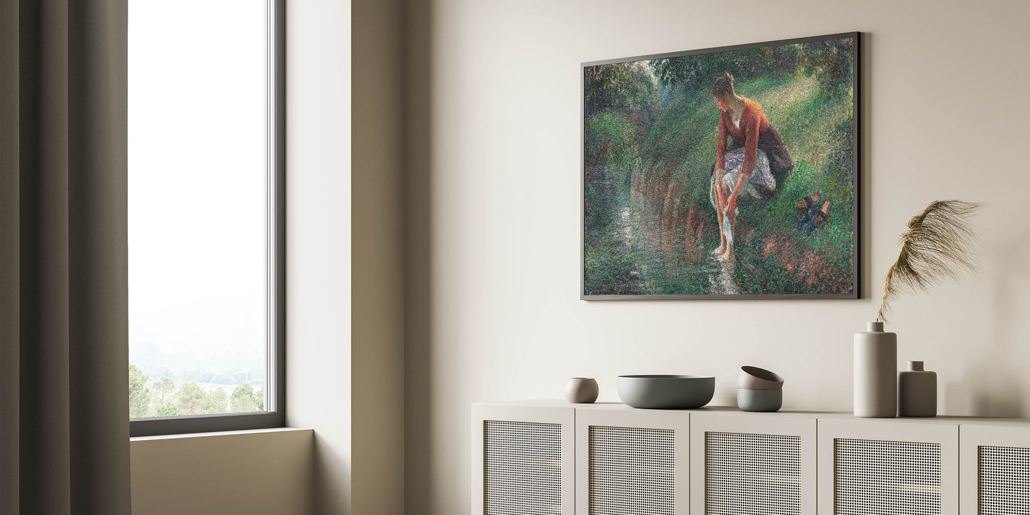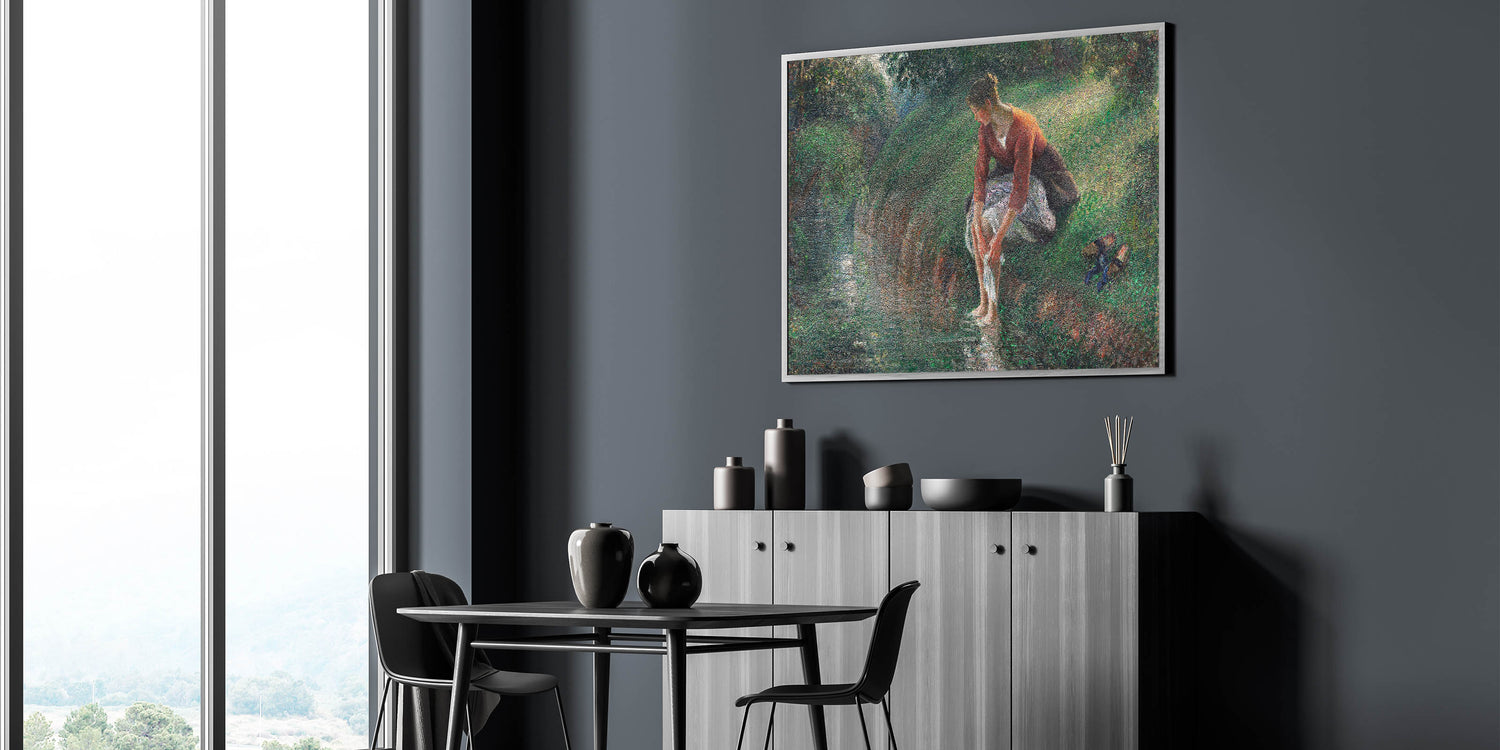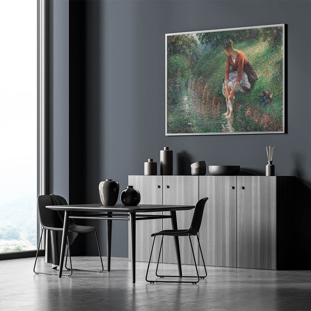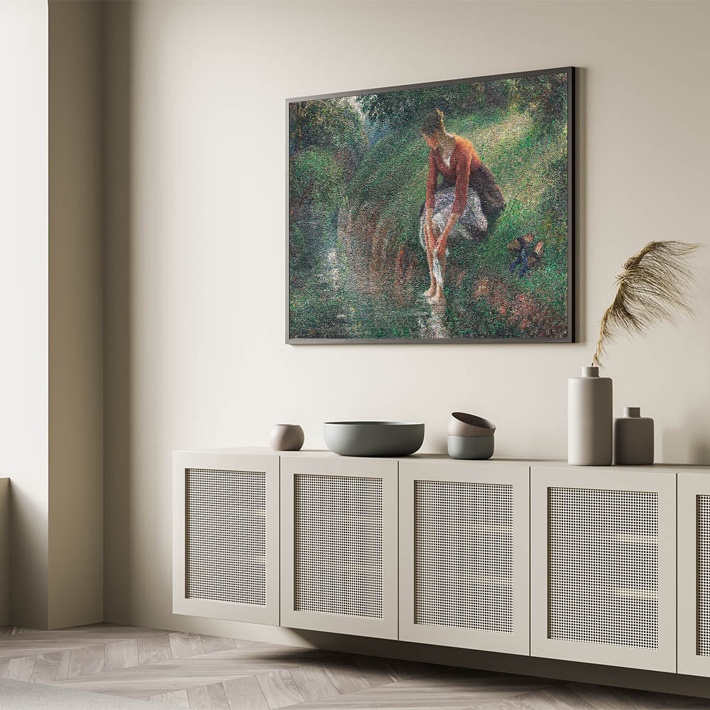 Experience the quiet beauty of Camille Pissarro's Woman by the Stream, an enchanting example of impressionist art that captures the peaceful simplicity of rural life. In this painting, a woman gently washes her feet by the stream, surrounded by lush greenery and bathed in soft natural light. Pissarro’s mastery of light and color is evident in the way the dappled sunlight creates a harmonious balance between the figure and the landscape. This artistic masterpiece transports viewers to a serene moment in time, making it a perfect addition to any space.