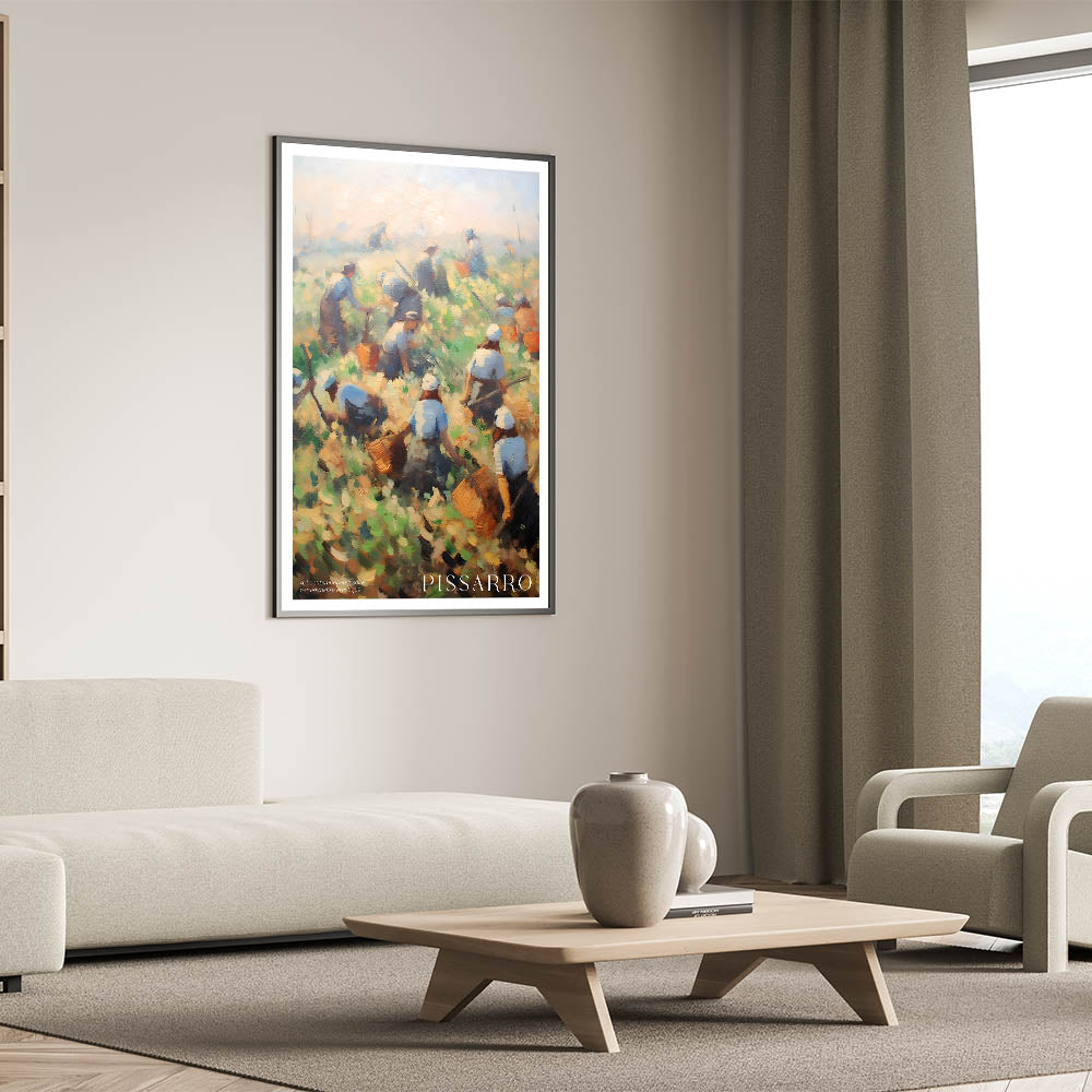 This vibrant Camille Pissarro-inspired Pissarro canvas captures the essence of rural life with a harvest scene brimming with activity. The impressionistic brushstrokes and bright, natural colors bring to life the hard work and camaraderie of harvesters in a lush field. Ideal for anyone looking to add Impressionist prints that celebrate the beauty of rural labor and community.