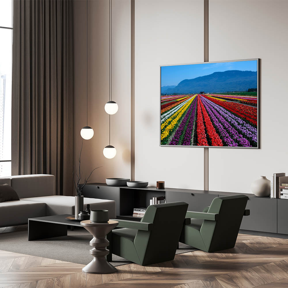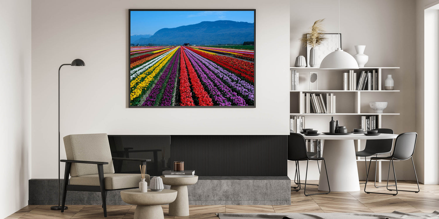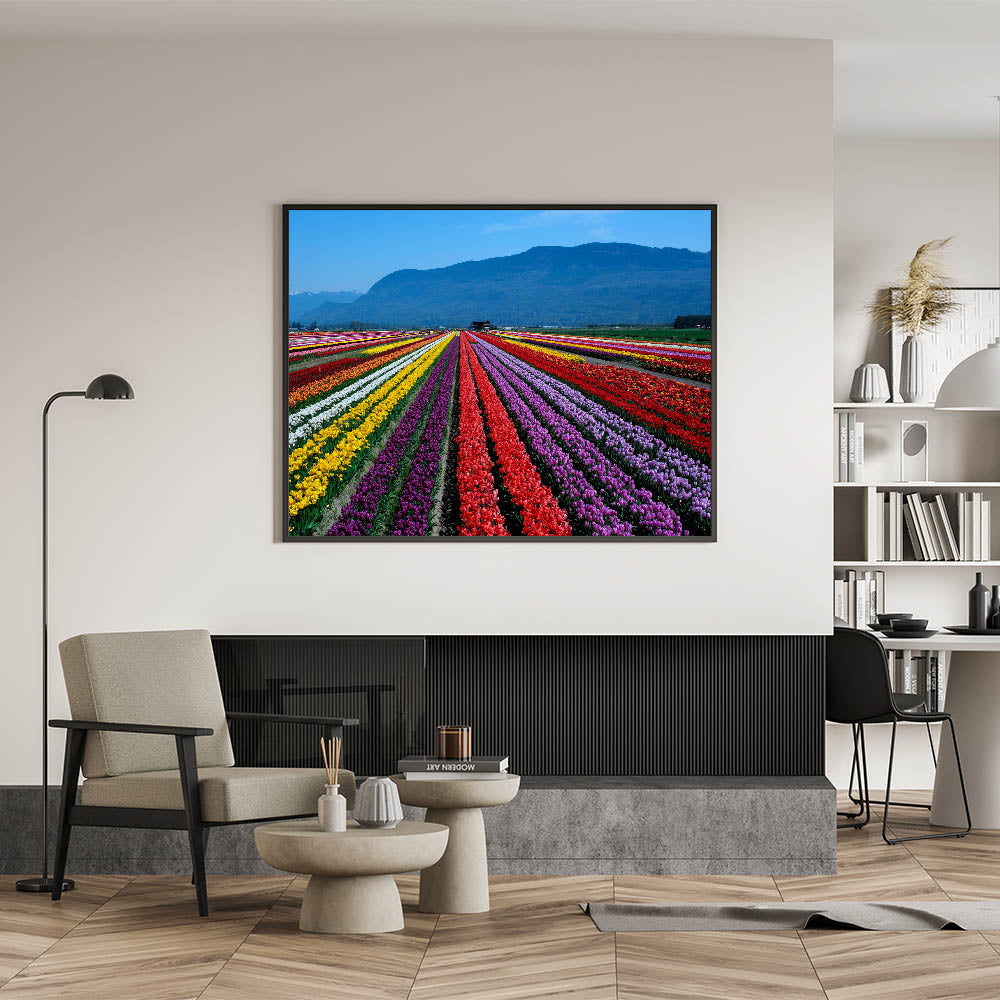 Immerse yourself in the vibrant colors of British Columbia’s tulip fields with this stunning wall art. Featuring rows of red, yellow, purple, and white tulips stretching into the horizon, this image captures the joy and beauty of spring. Set against the backdrop of majestic mountains, the scene offers a perfect blend of natural beauty and human artistry. The orderly rows of tulips and the vivid, contrasting colors create a sense of harmony and joy, making this artwork the perfect addition to brighten up any space.