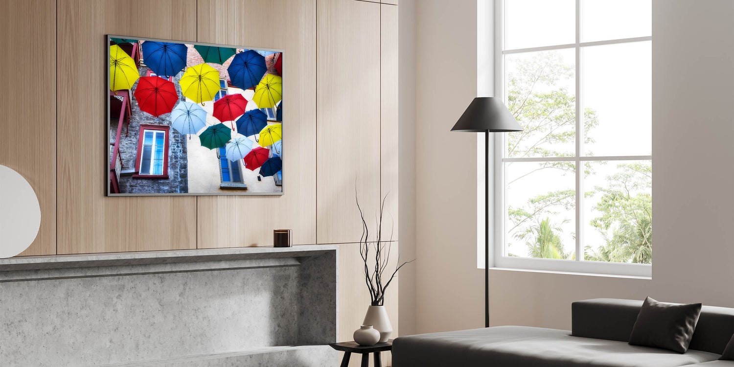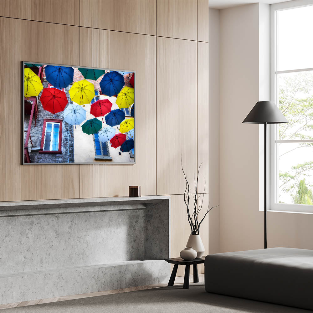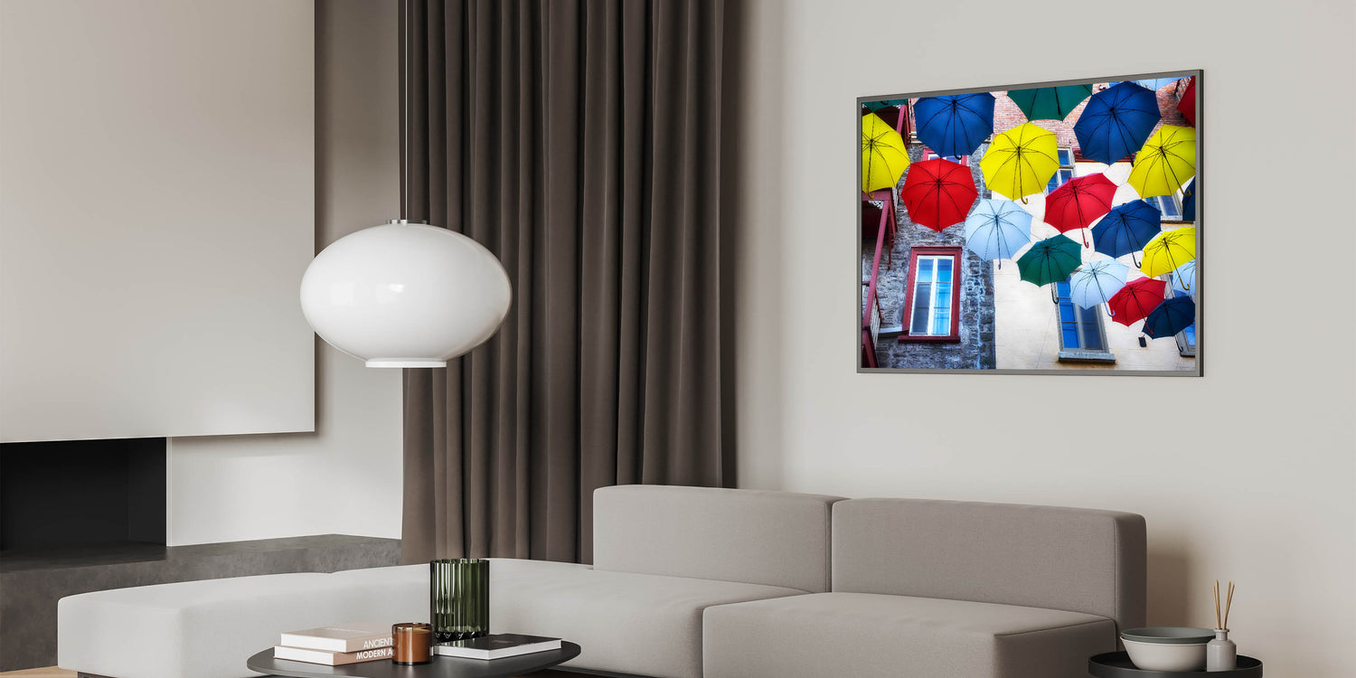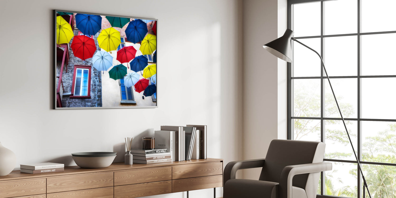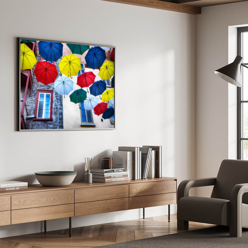 Colorful Umbrellas in Quebec Wall Art – Vibrant Street Photography Print