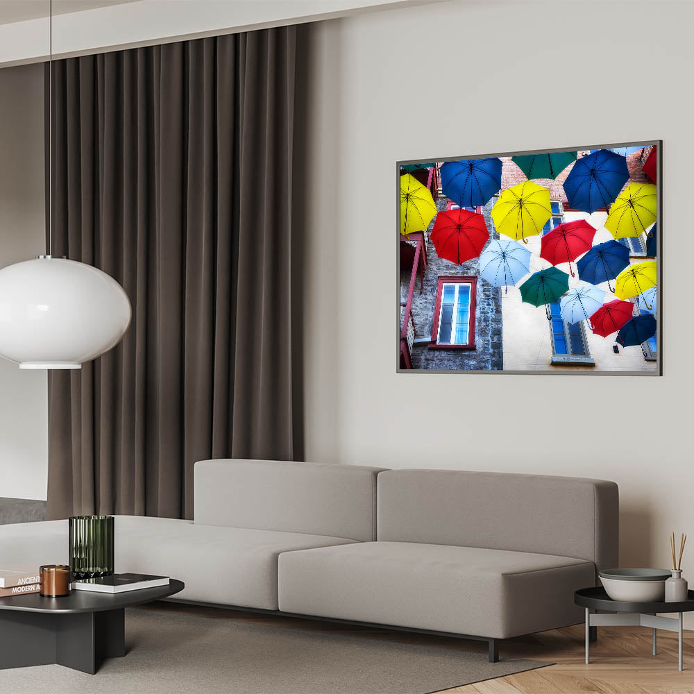Brighten up your space with this captivating wall art featuring a stunning display of colorful umbrellas in the streets of Quebec. The vibrant red, blue, yellow, and green umbrellas float overhead, creating a joyful and whimsical scene. This beautiful artwork captures a creative and playful side of Quebec’s city streets, bringing a splash of color and charm to any room. The bold contrast of the umbrellas against the traditional stone buildings adds a dynamic element to the photograph, making it perfect for anyone who appreciates both urban life and artistic expression.