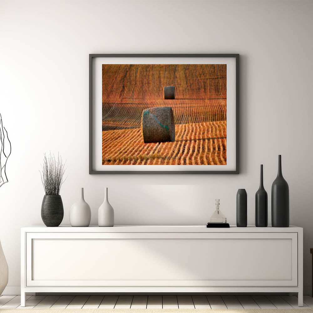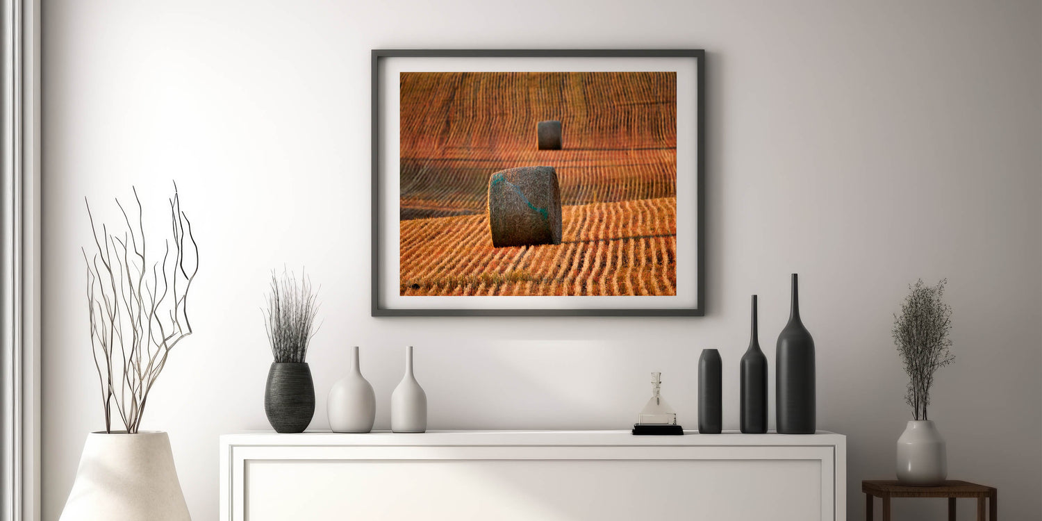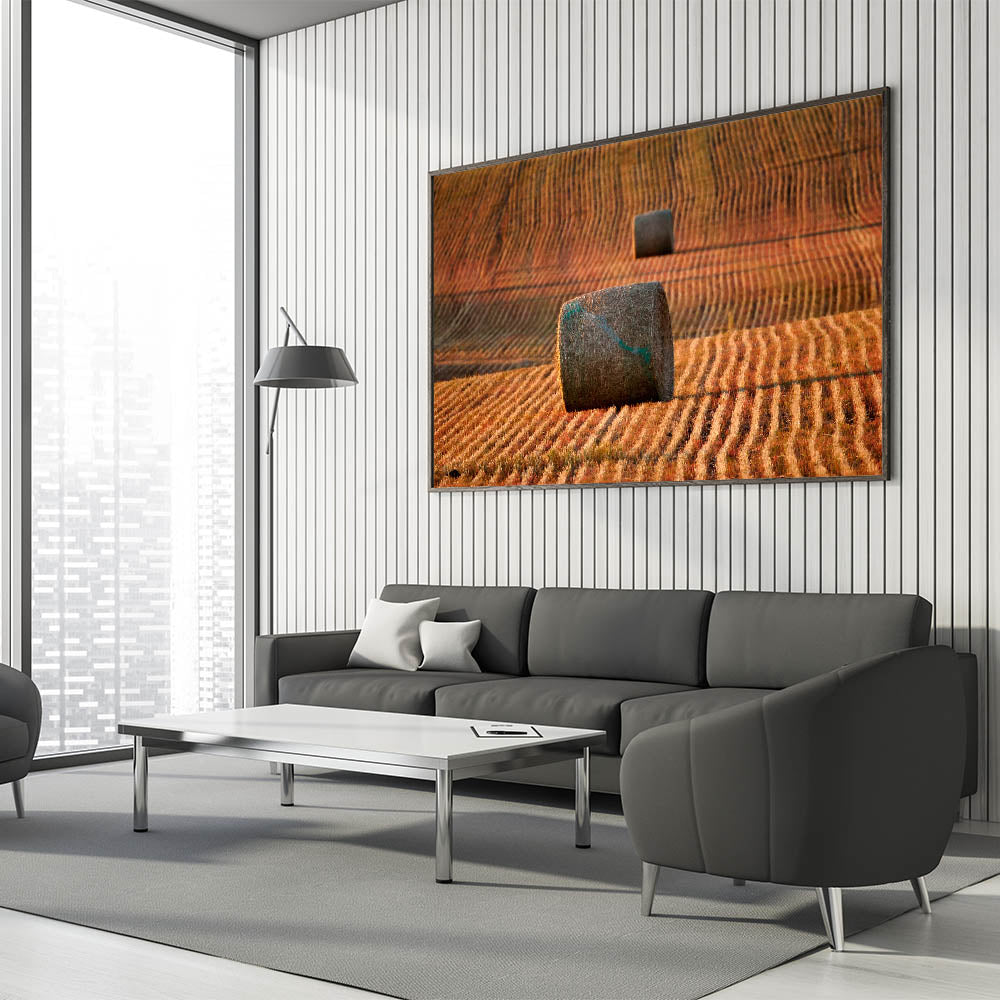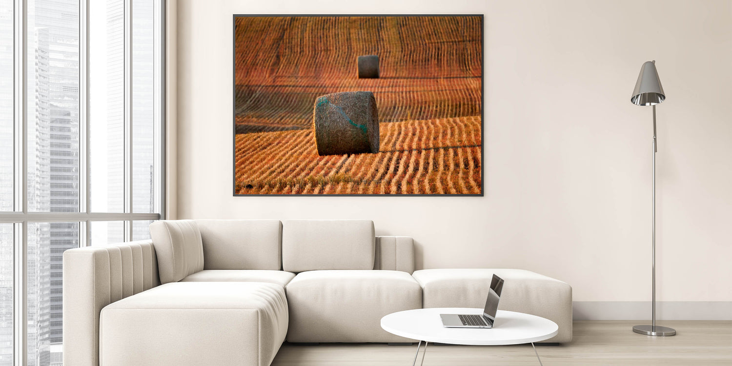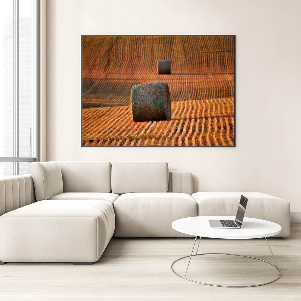 Embrace the beauty of Saskatchewan's golden prairies with this stunning wall art. This piece captures the serene landscape of a freshly harvested field with hay bales scattered across the horizon, bathed in the soft glow of sunset. The warm tones of the field, combined with the unique textures of the hay bales, create a captivating visual that embodies the tranquility of rural life in Canada.
