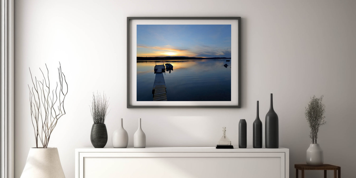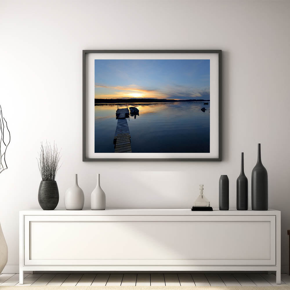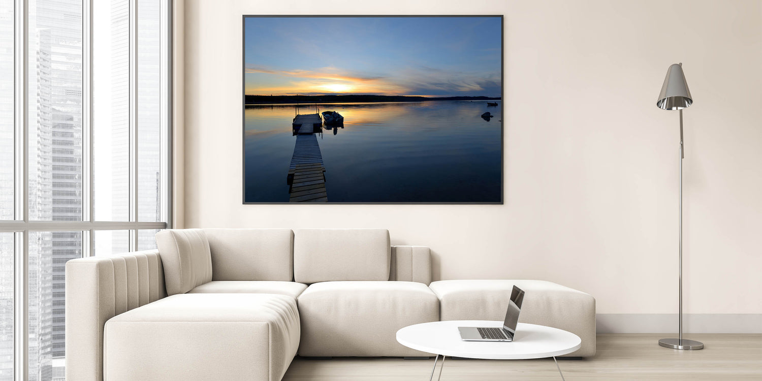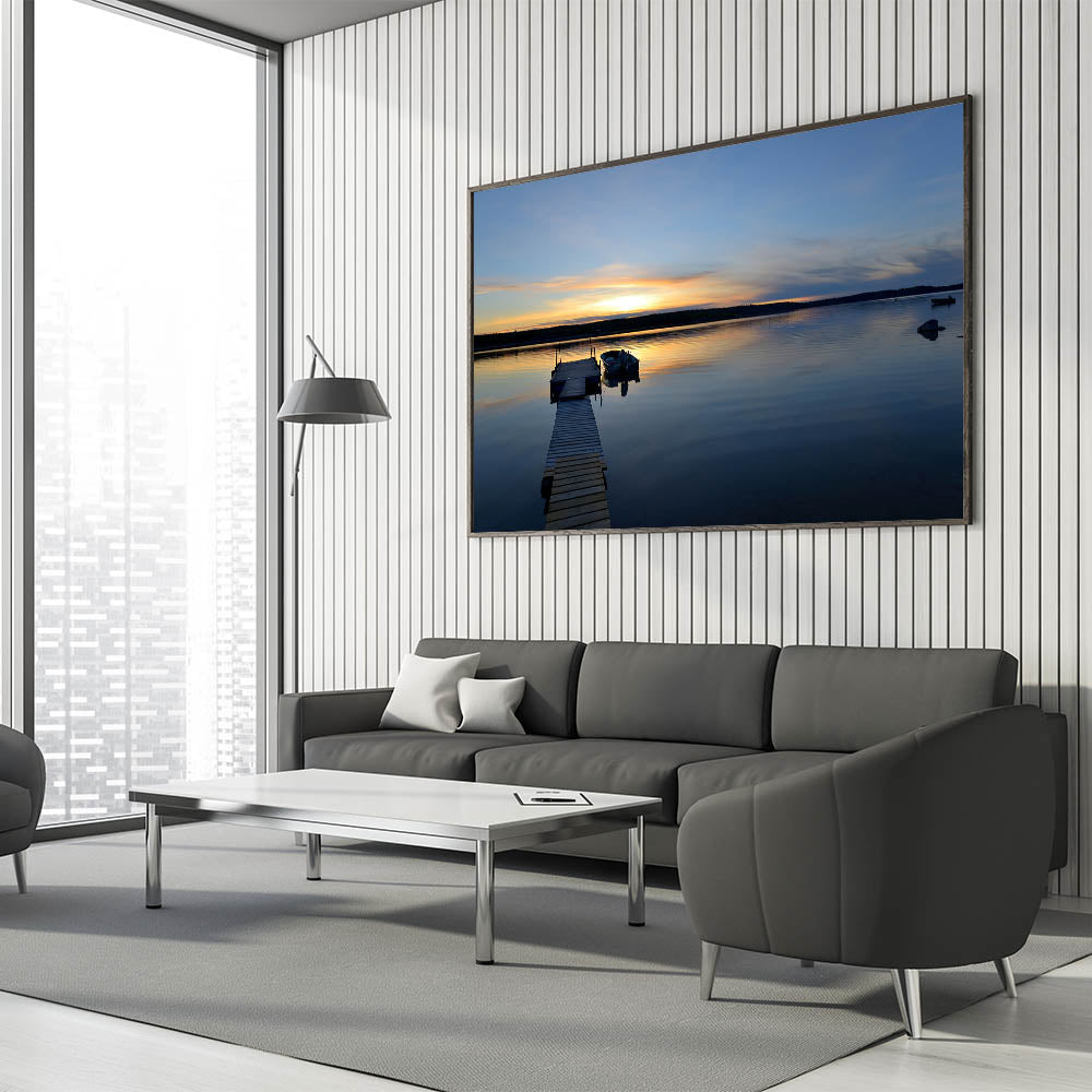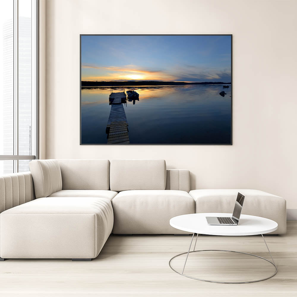 Capture the peaceful charm of a golden sunset with this stunning wall art, showcasing a tranquil dock on a serene lake in the Northwest Territories. The warm hues of the setting sun reflect beautifully on the calm waters, creating a soothing and captivating scene that brings the beauty of Canada's northern wilderness into any space. Perfect for those seeking a calming and elegant addition to their home or office decor.