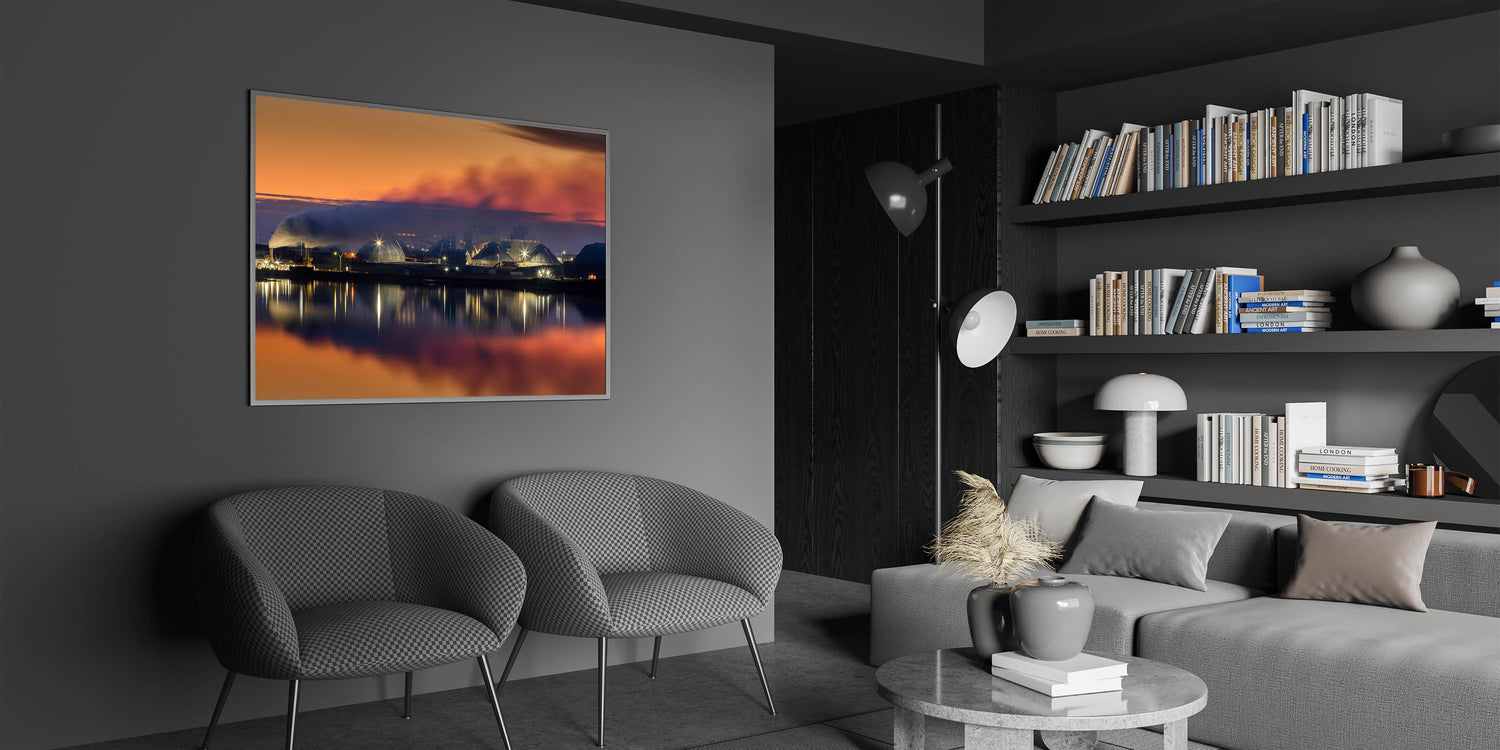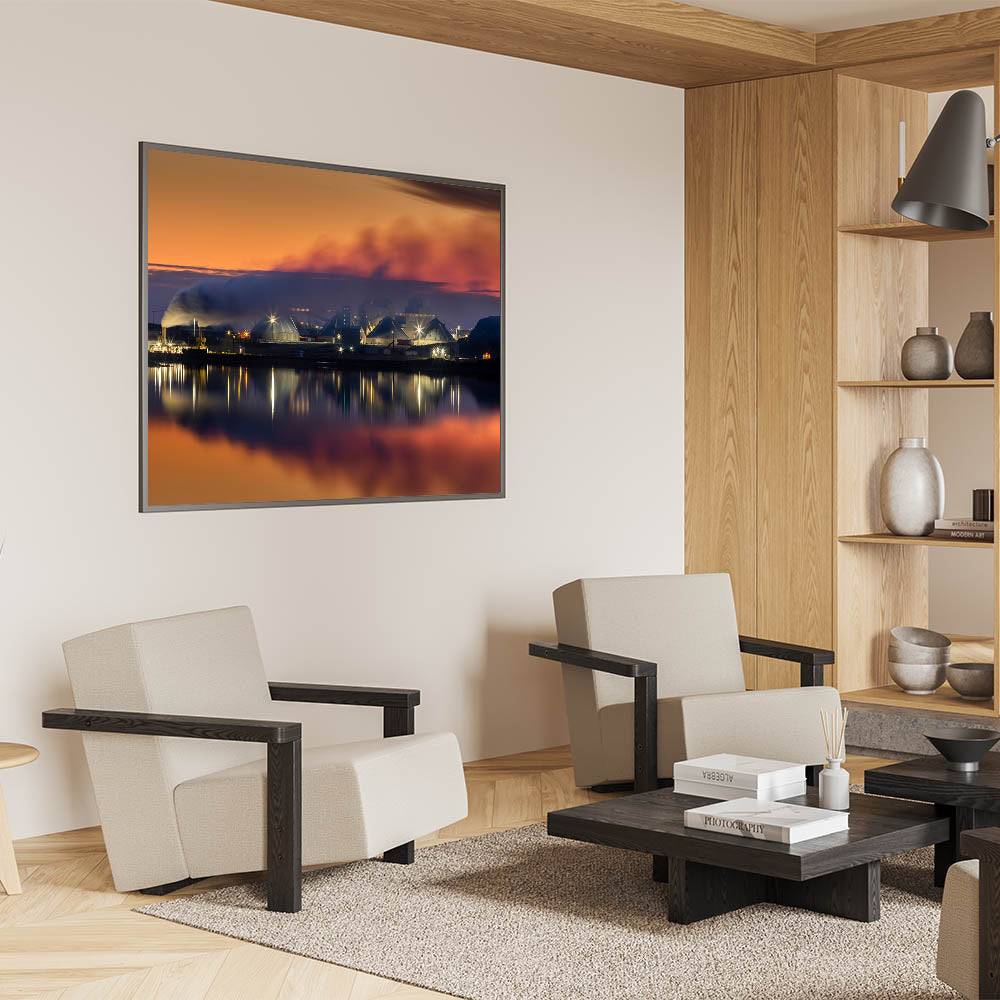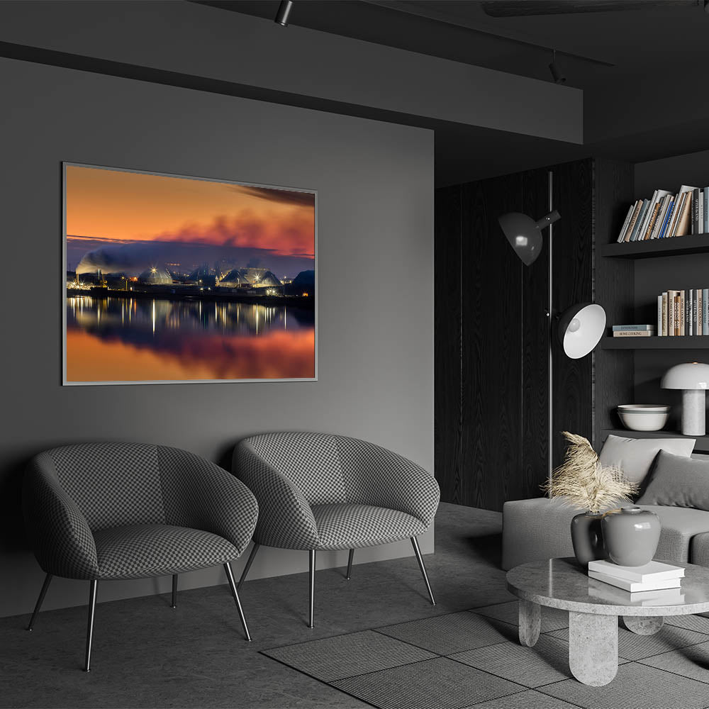 - High-quality Saskatchewan prints showcasing the stunning contrast between industrial lights and natural sunset colors.