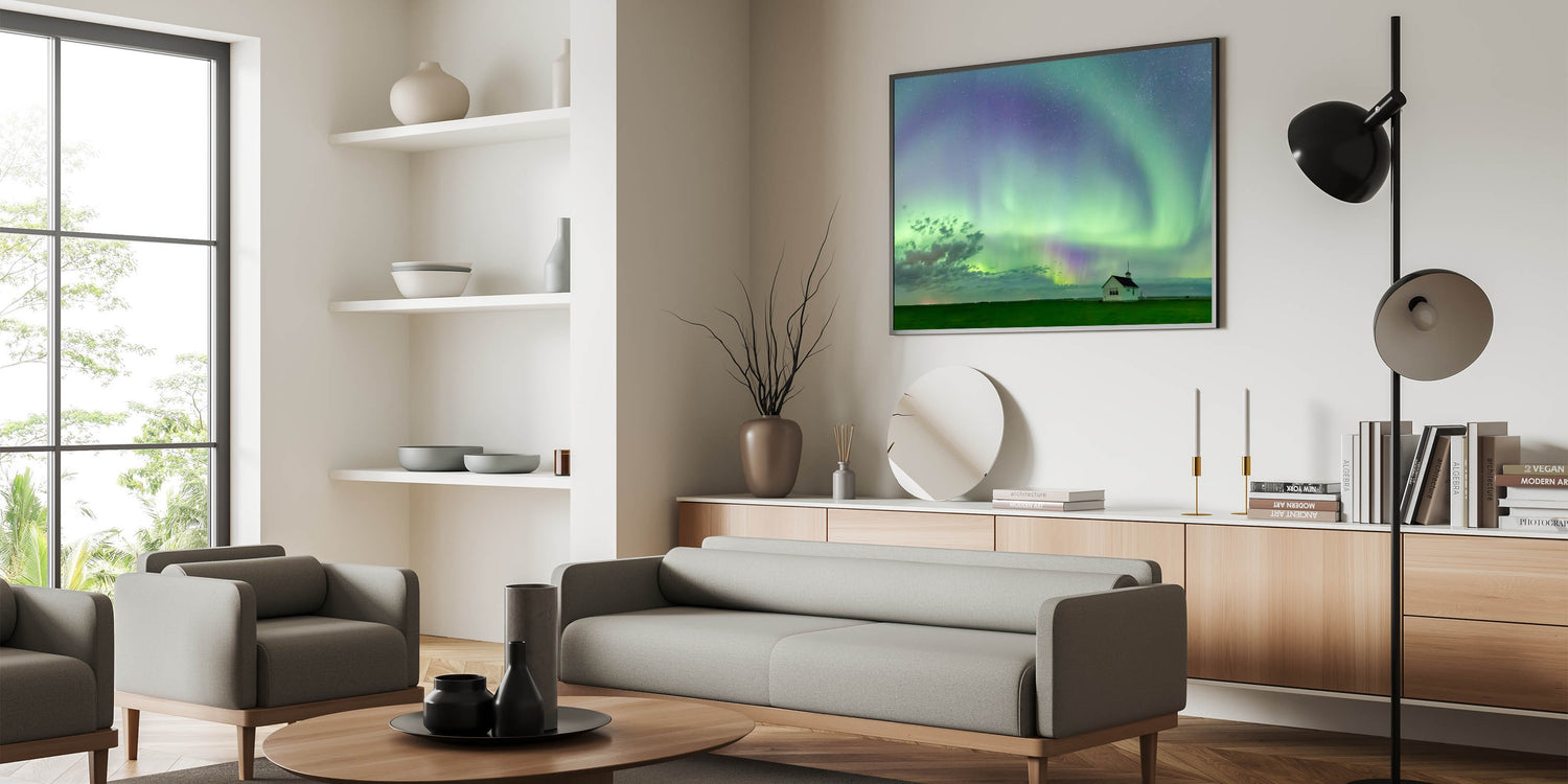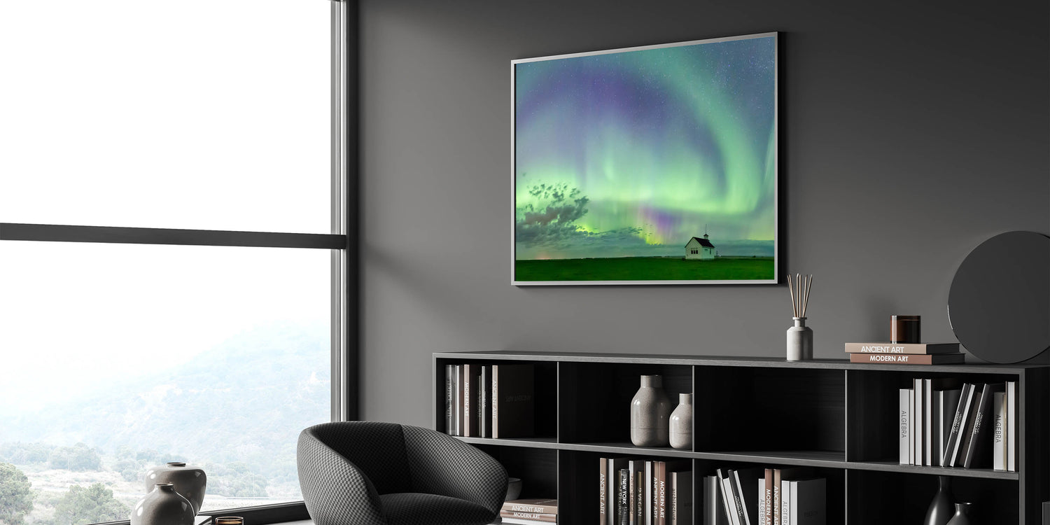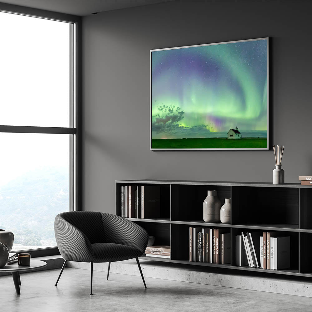 Capture the awe-inspiring beauty of Saskatchewan’s northern lights with this mesmerizing wall art. This piece features the stunning aurora borealis dancing across the night sky, casting vibrant hues of green and purple over a tranquil prairie landscape. A solitary church adds a peaceful focal point, perfectly complementing the ethereal display in the sky. This artwork brings the magic of nature’s light show into your home, offering a serene and captivating atmosphere.