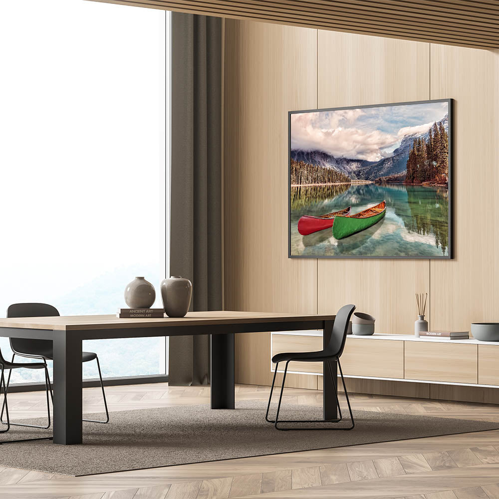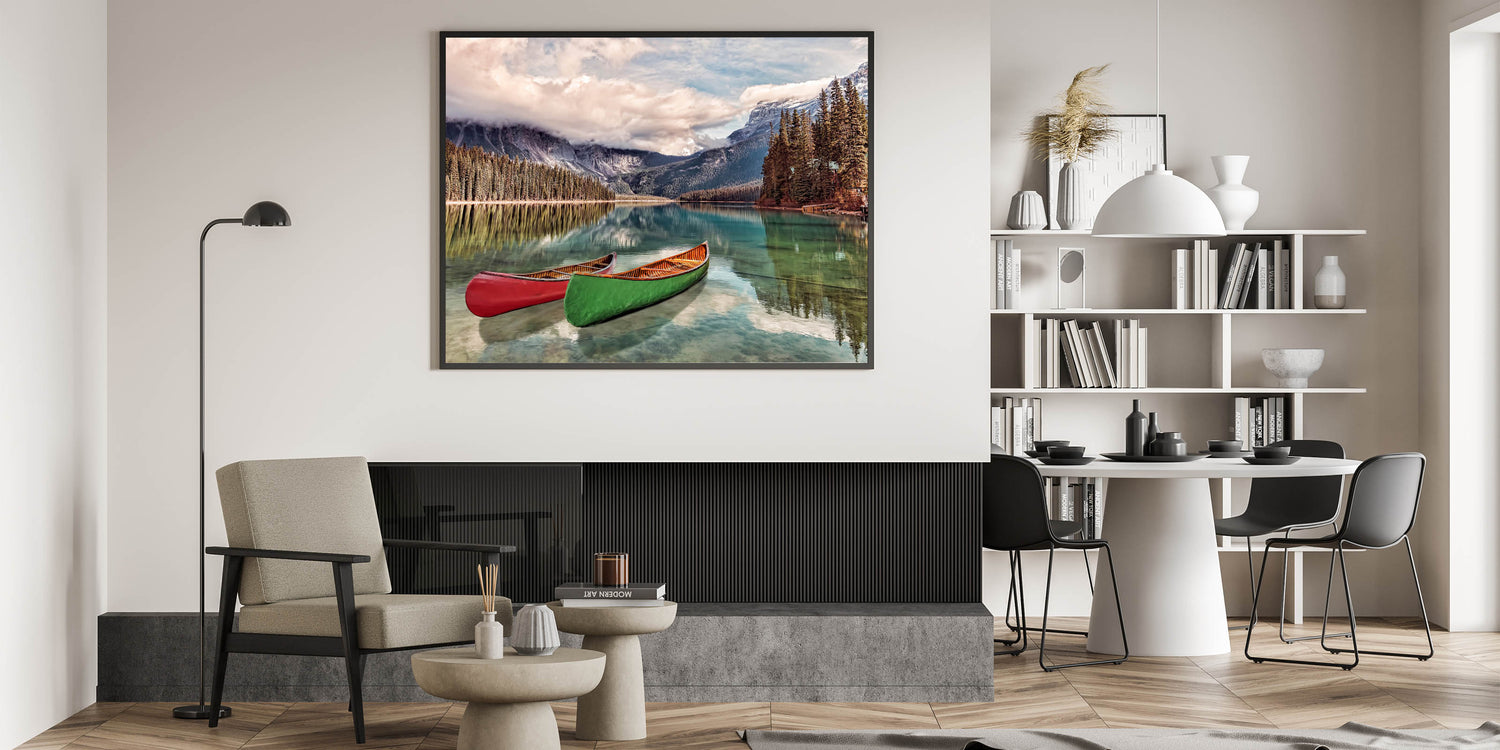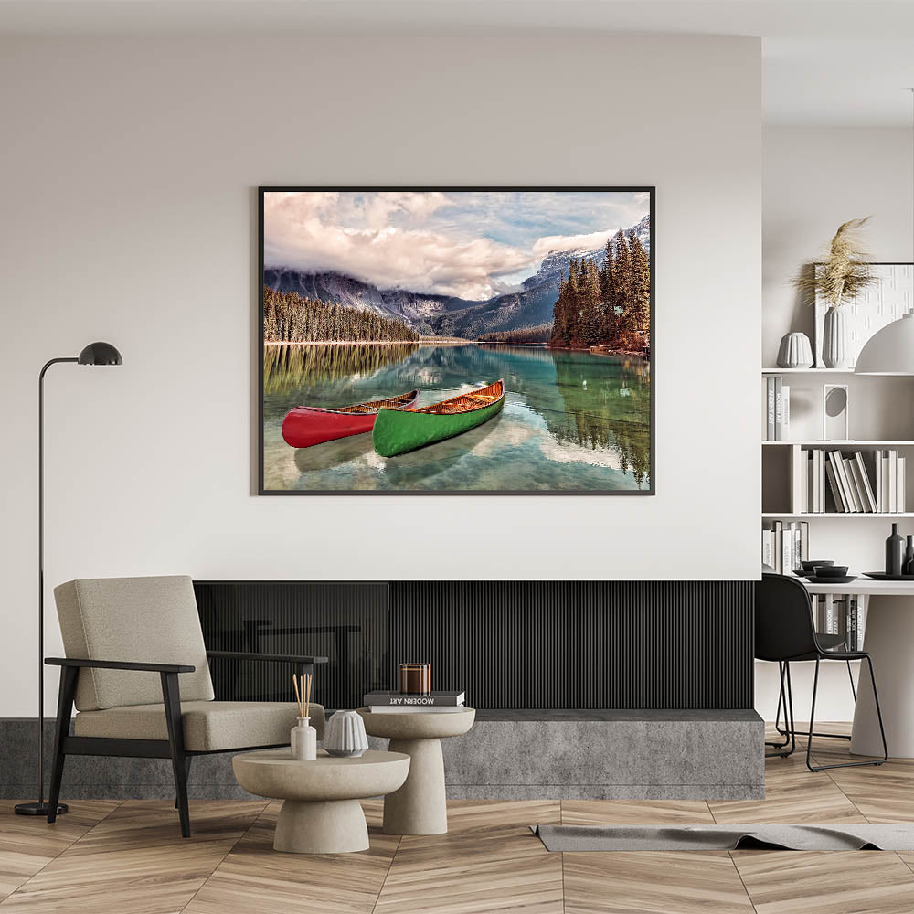 Capture the natural beauty of British Columbia with this breathtaking wall art, featuring serene canoes floating on a crystal-clear lake. The stunning Rocky Mountains rise in the background, with lush evergreen trees reflecting in the still waters. This scene encapsulates the essence of the Pacific Northwest, making it an ideal addition to any home or office.