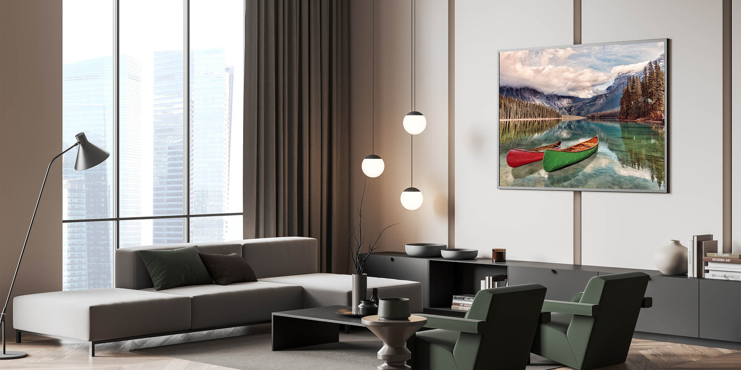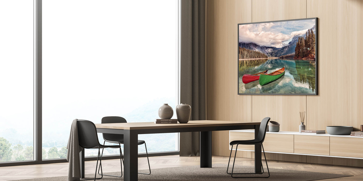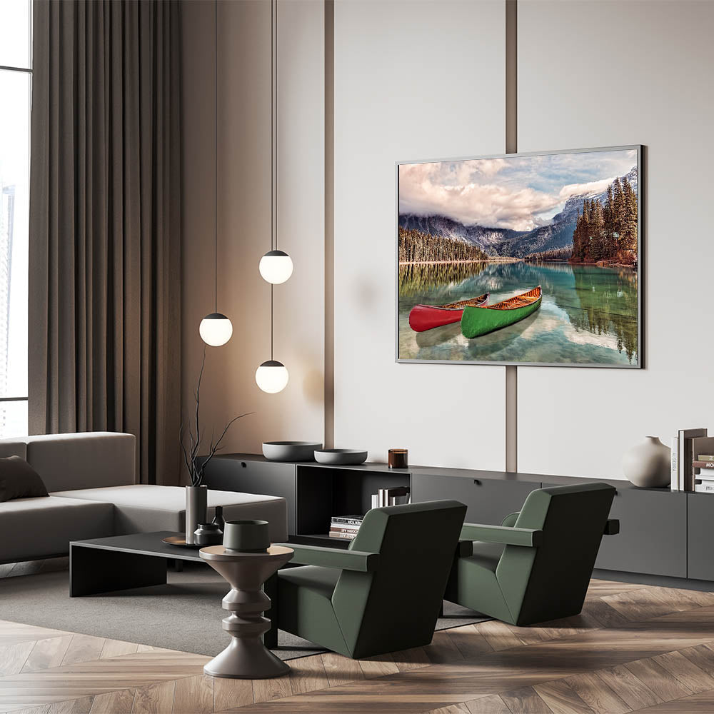 Capture the natural beauty of British Columbia with this breathtaking wall art, featuring serene canoes floating on a crystal-clear lake. The stunning Rocky Mountains rise in the background, with lush evergreen trees reflecting in the still waters. This scene encapsulates the essence of the Pacific Northwest, making it an ideal addition to any home or office.