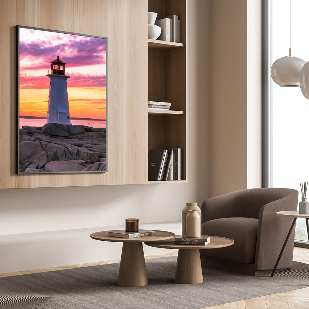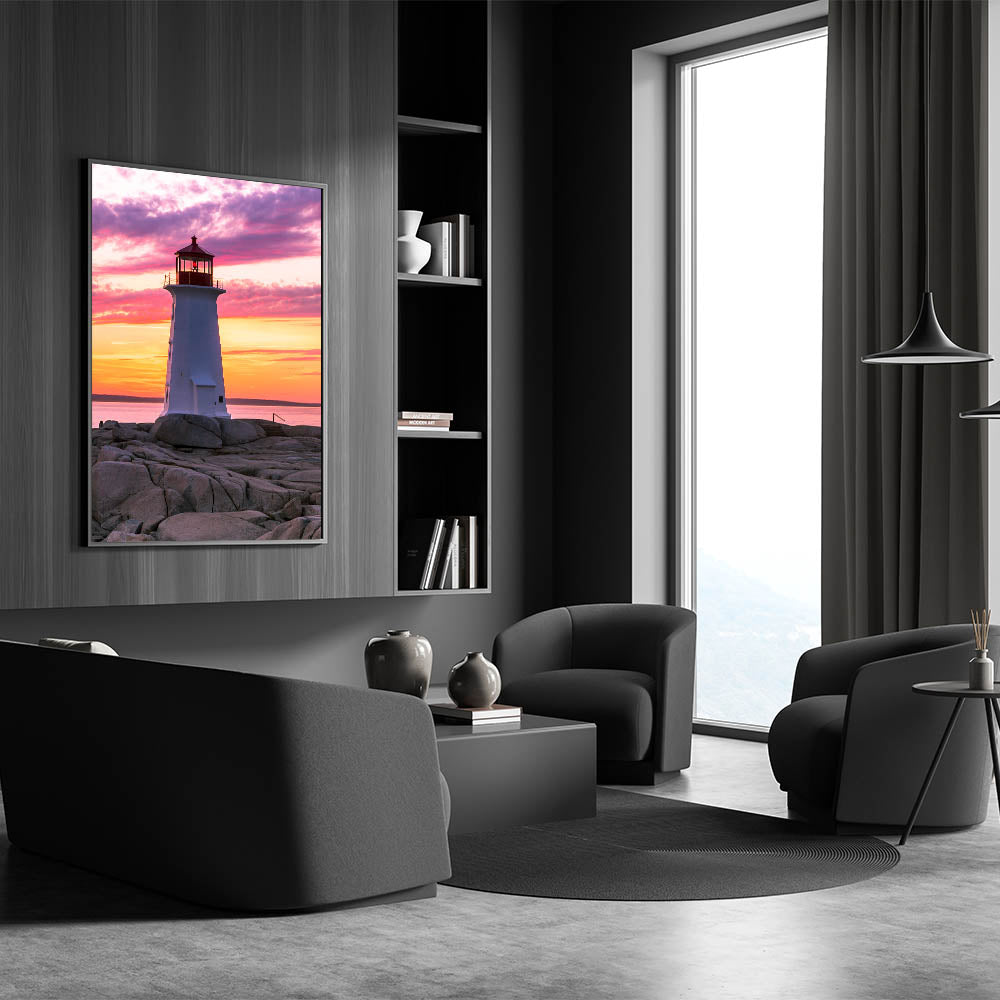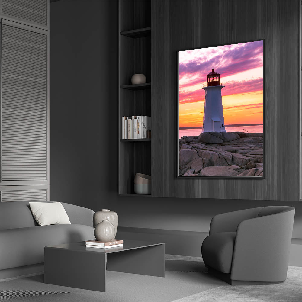 Celebrate the vibrant beauty of Nova Scotia with this stunning lighthouse at sunset wall art. Set against a breathtaking sky filled with rich hues of pink, orange, and purple, the lighthouse stands as a symbol of strength and guidance along the rocky shoreline. The brilliant sunset colors reflect off the tranquil water, creating a mesmerizing scene that will captivate any viewer. Perfect for those who love coastal scenery and the serene beauty of maritime landscapes, this piece will add warmth and charm to any space.