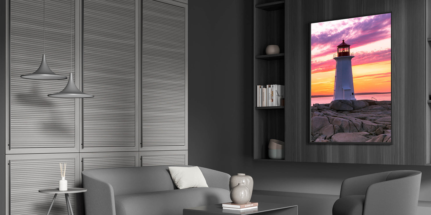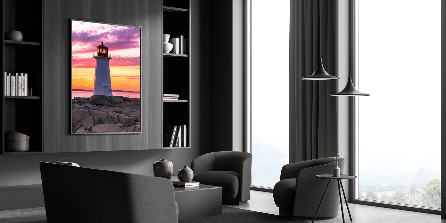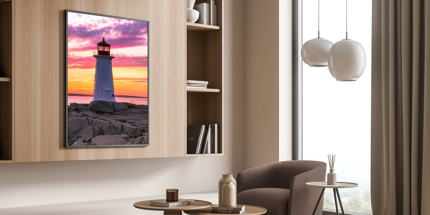 Celebrate the vibrant beauty of Nova Scotia with this stunning lighthouse at sunset wall art. Set against a breathtaking sky filled with rich hues of pink, orange, and purple, the lighthouse stands as a symbol of strength and guidance along the rocky shoreline. The brilliant sunset colors reflect off the tranquil water, creating a mesmerizing scene that will captivate any viewer. Perfect for those who love coastal scenery and the serene beauty of maritime landscapes, this piece will add warmth and charm to any space.