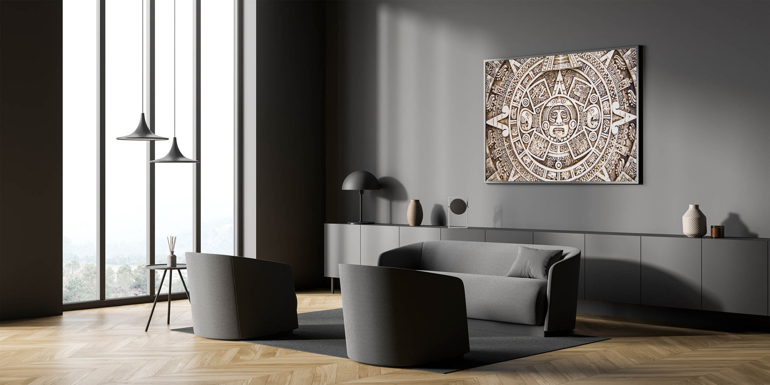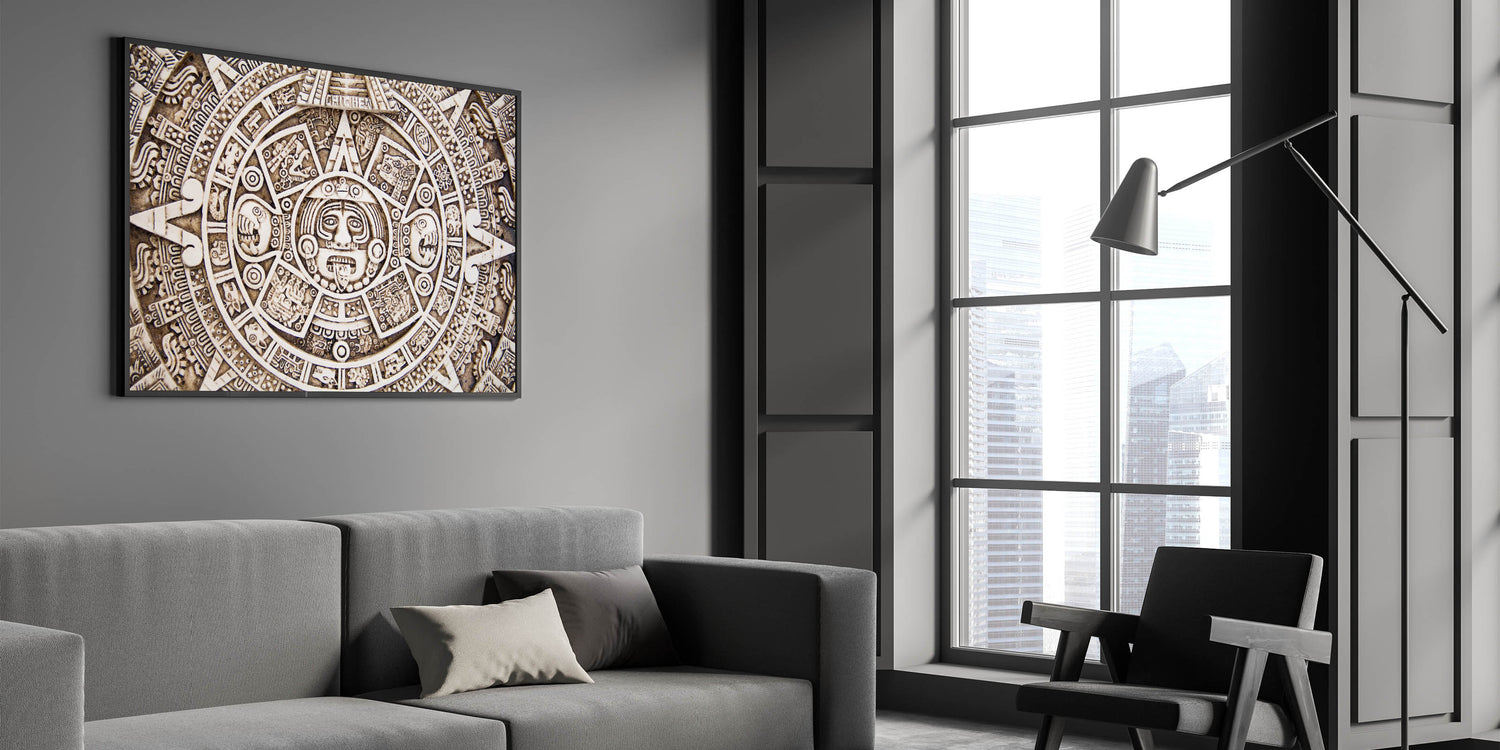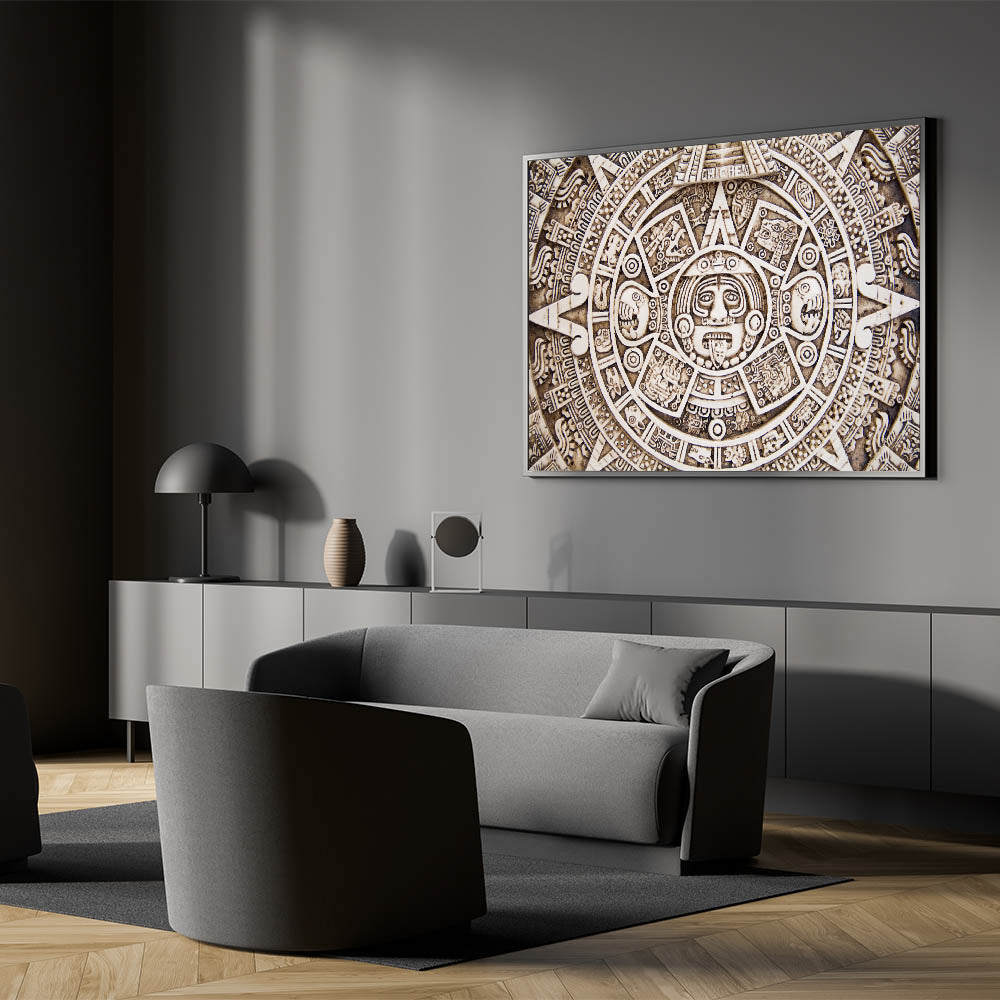 - High-quality Mayan calendar prints available in multiple formats, including Stretched Canvas, Framed Canvas, and Acrylic Glass.