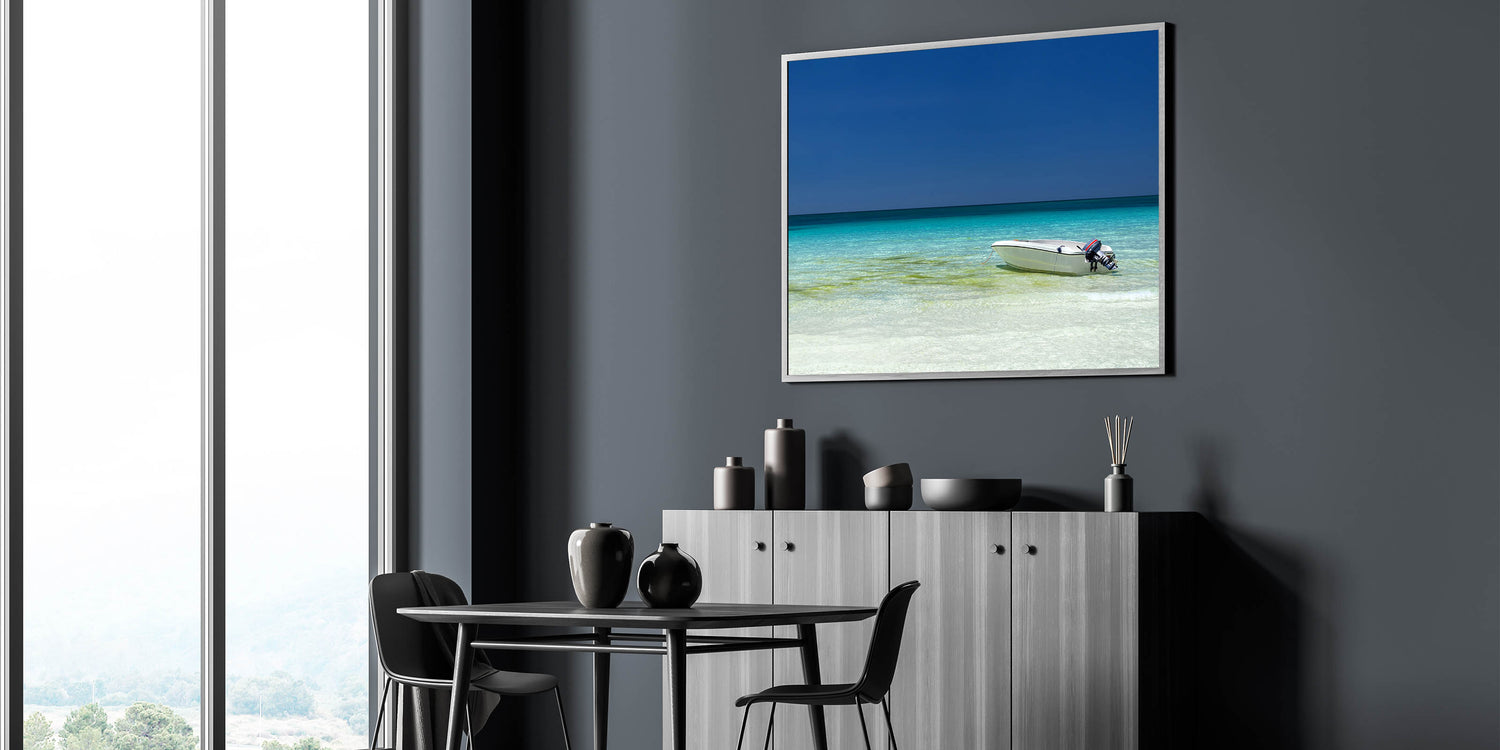 This Cancun photography print is an ideal addition for anyone looking to transform their space into a peaceful coastal retreat. The combination of turquoise waters and the simplicity of the lone boat creates an atmosphere of calm and relaxation.