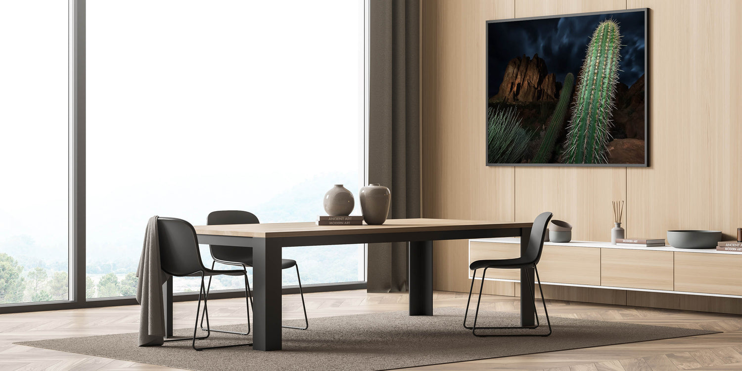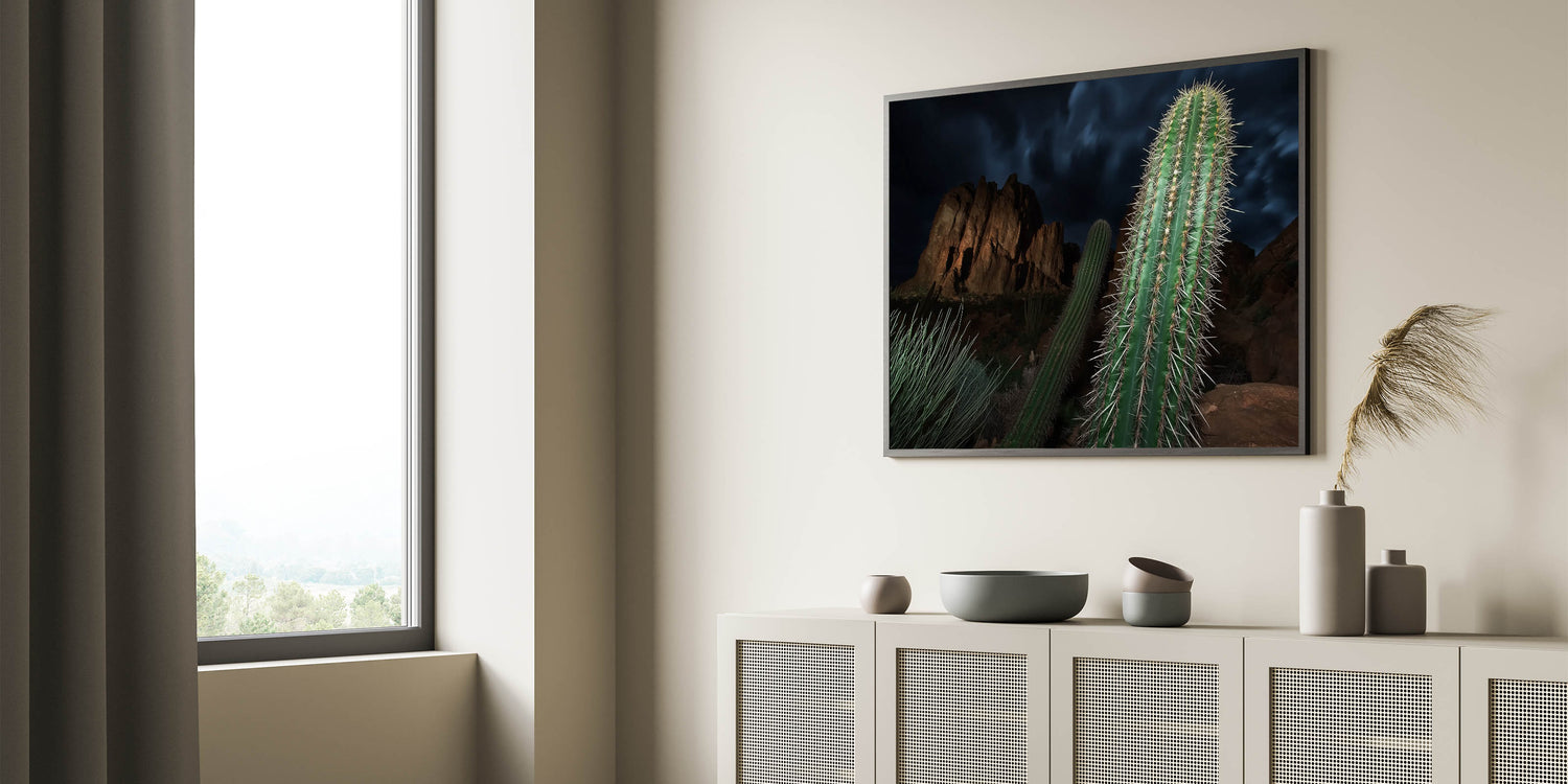 Transform your living room, bedroom, or office into a desert oasis with this one-of-a-kind artwork. The bold composition and rich textures make it a perfect centerpiece or addition to a gallery wall. Celebrate the untamed beauty of desert landscapes and let this cactus and canyon nightscape bring a sense of calm and intrigue to your home.