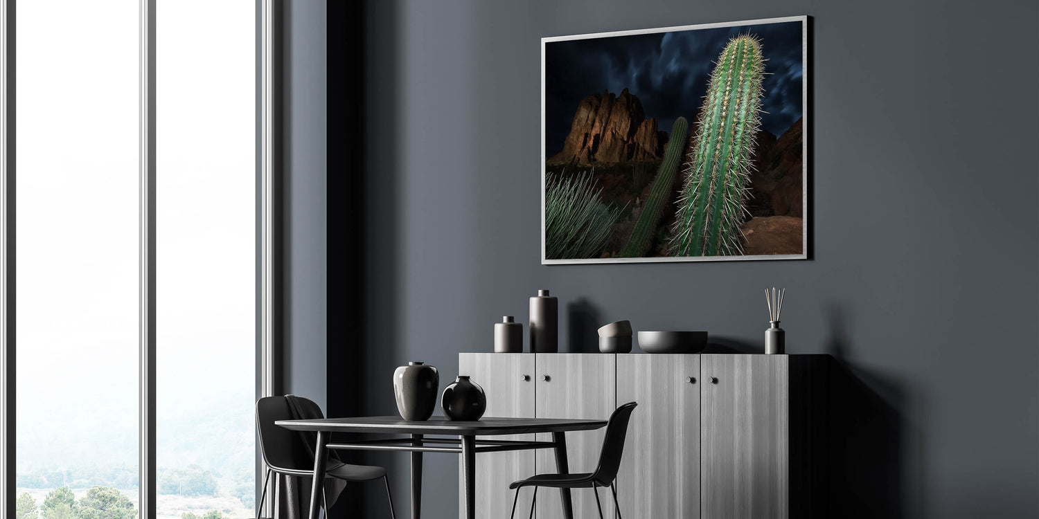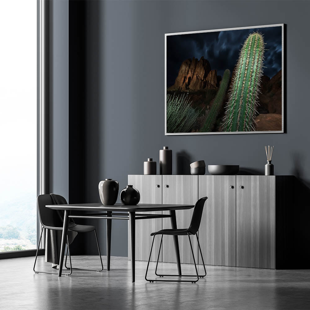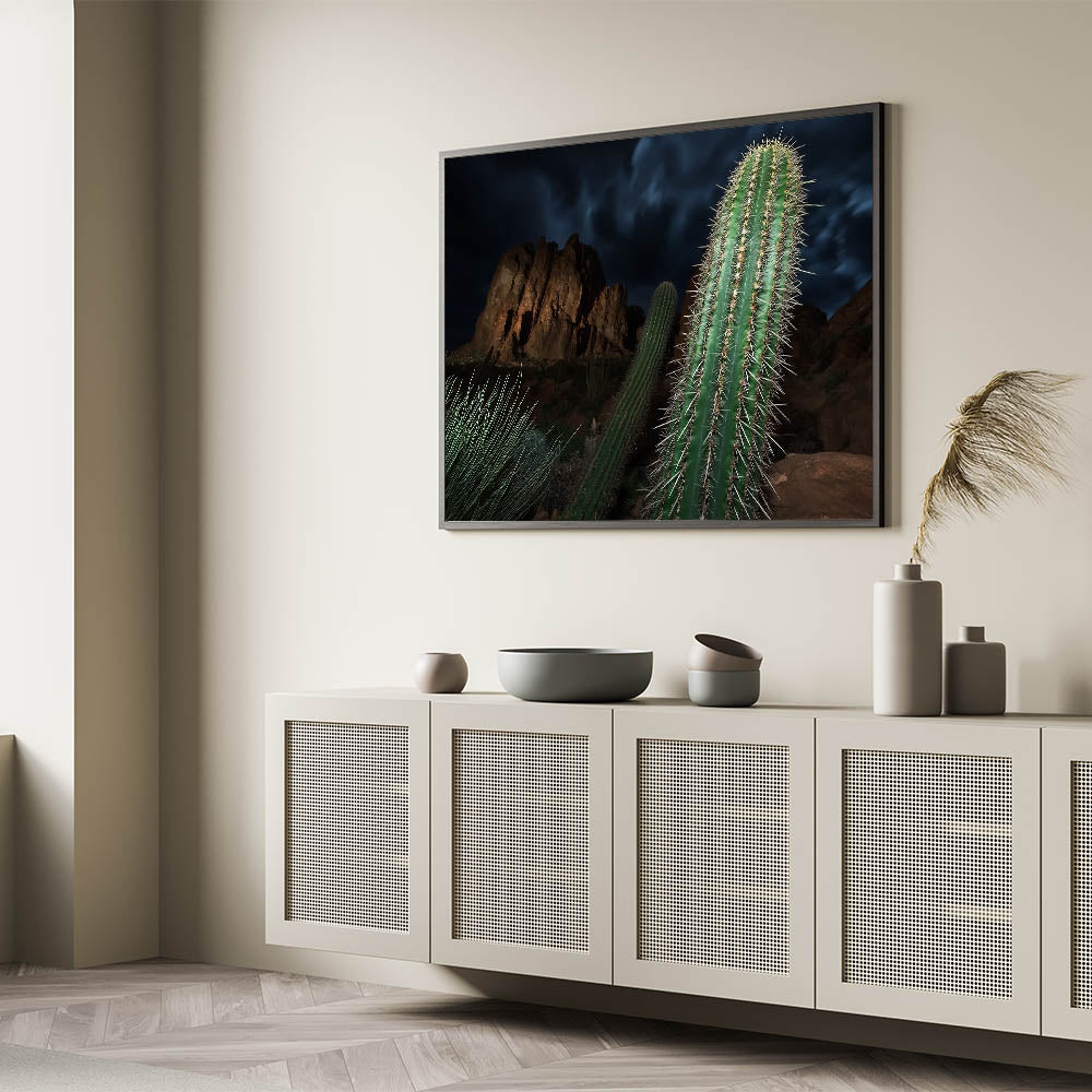 Immerse yourself in the captivating beauty of the desert night with this stunning wall art featuring dramatic cacti and rugged canyon formations under a moonlit sky. The striking interplay of shadows and light creates a mesmerizing contrast, showcasing the vibrant green of the cacti against the earthy tones of the canyon. Perfect for lovers of desert landscapes and modern art, this piece will bring a touch of adventure and serenity into your space.