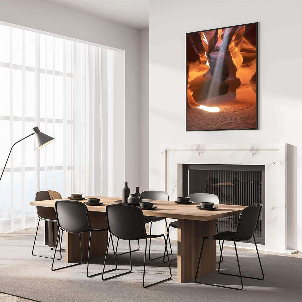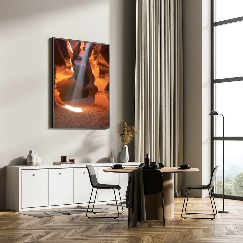 Immerse yourself in the mesmerizing glow of sunlight streaming through a canyon with this stunning artwork. The ethereal light beam illuminates the rich orange and gold sandstone walls, creating a breathtaking contrast of warmth and shadow. This piece captures the tranquil beauty of nature, making it a perfect addition to any home or office space.