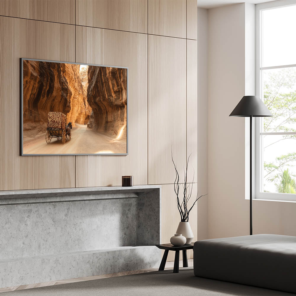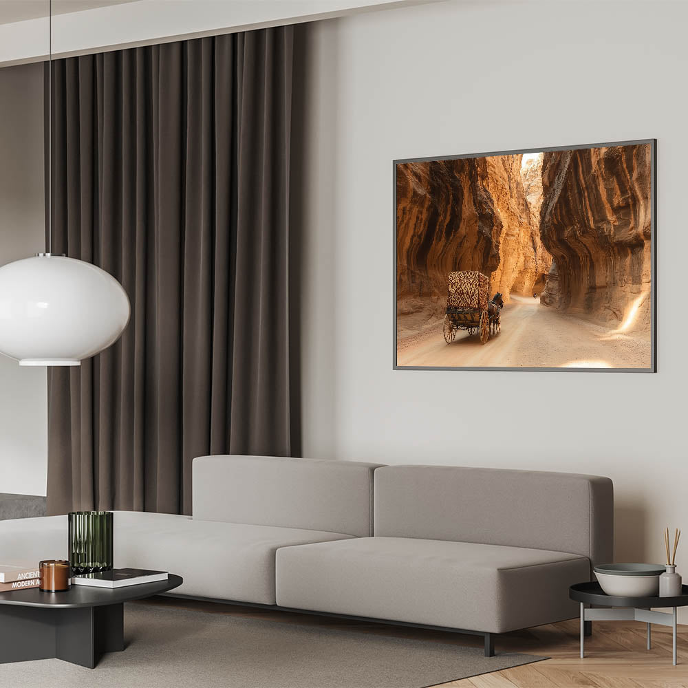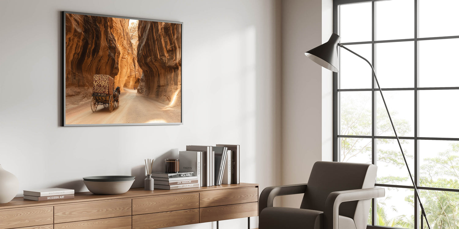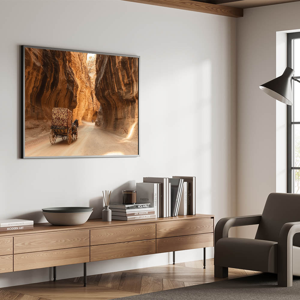 Step back in time with this Desert Caravan Canyon Art. Featuring a horse-drawn cart adorned with intricate patterns, this artwork beautifully captures a serene journey through a sandstone canyon bathed in warm golden light. The rugged canyon walls showcase nature’s artistry, while the sandy pathway evokes a sense of adventure and history. Perfect for living rooms, offices, or entryways, this piece adds warmth and cultural richness to any space.